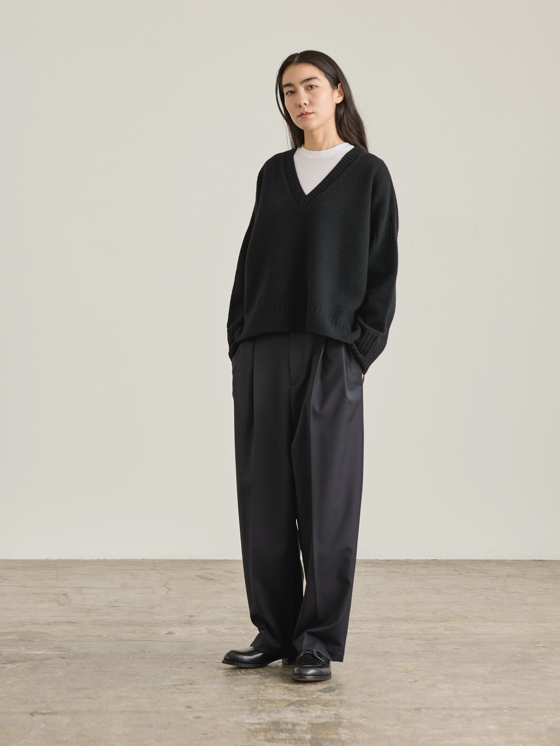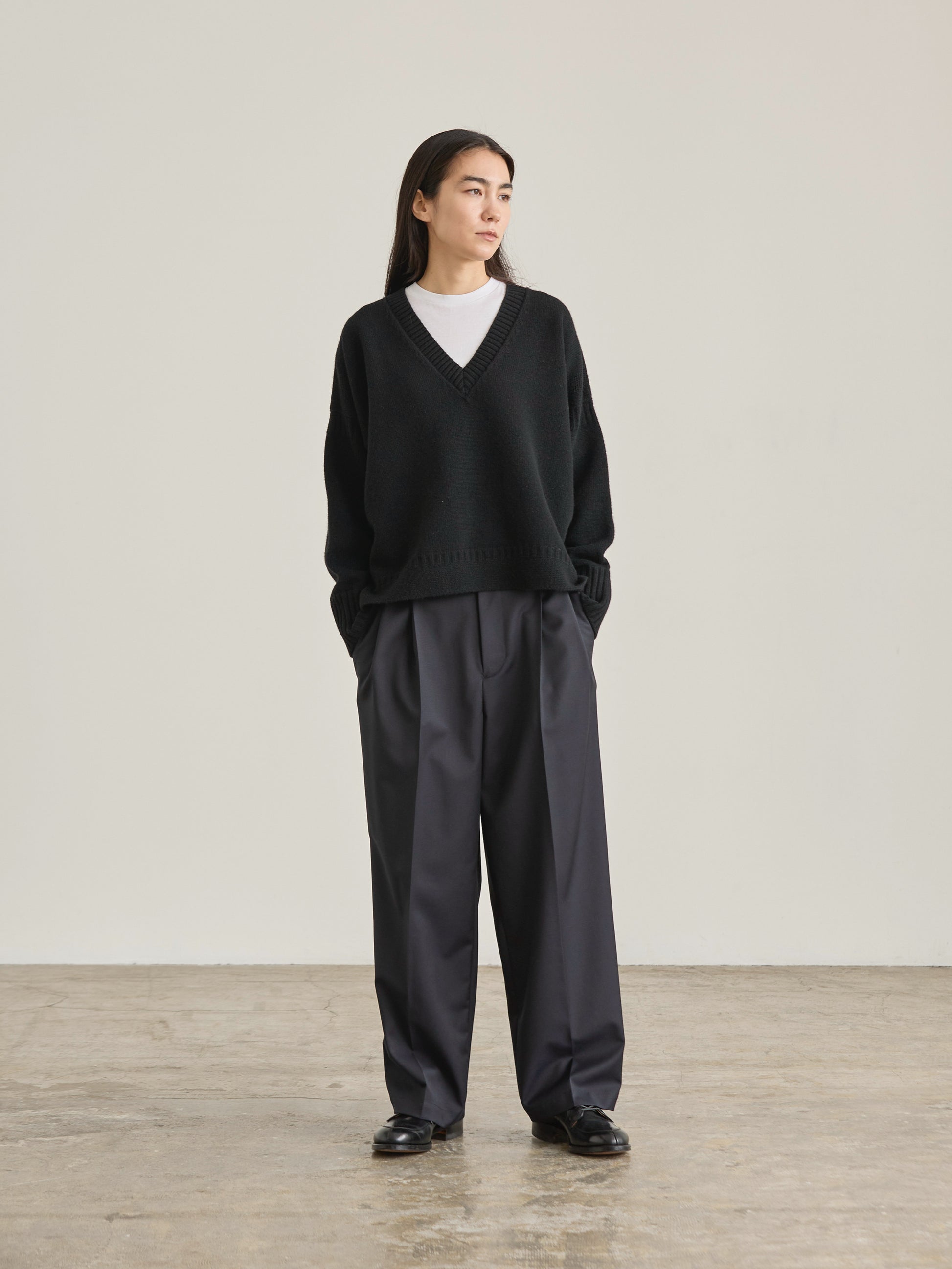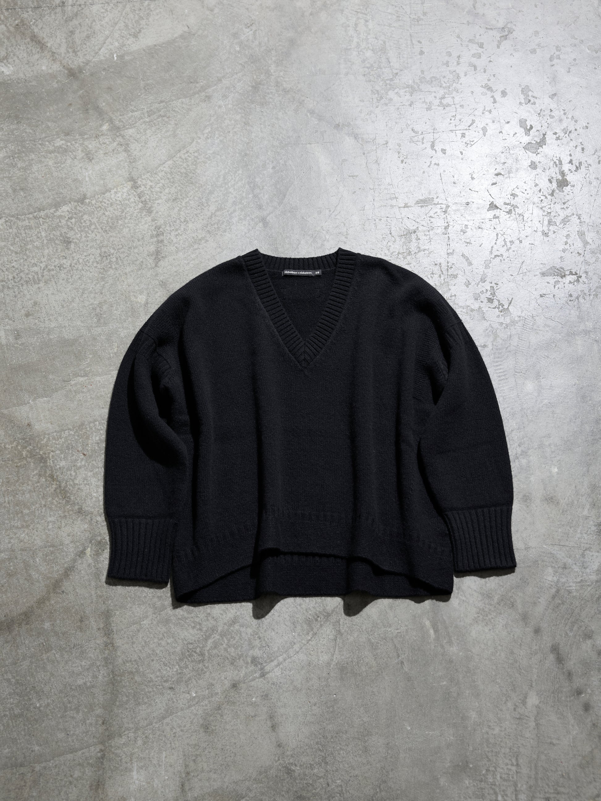 クラシカルなアイテムをモダンにアレンジしたビッグシルエットニット。ガンジーニットのディテール、雰囲気を残しつつサイズバランスを見直し、大人の女性が着用出来るVネックに仕上げました。インナーTシャツやシャツとのコーディネートをお楽しみ下さい。
