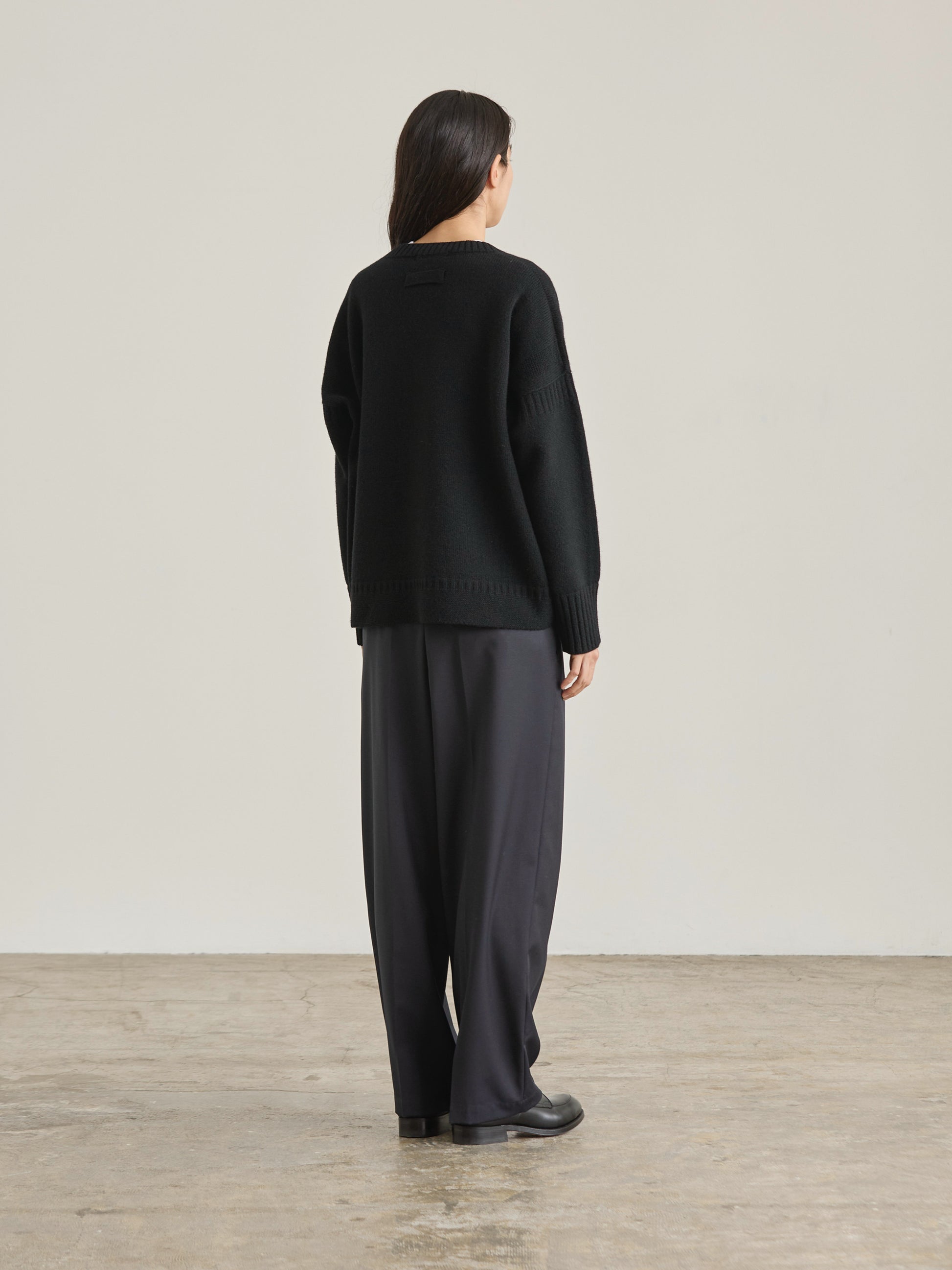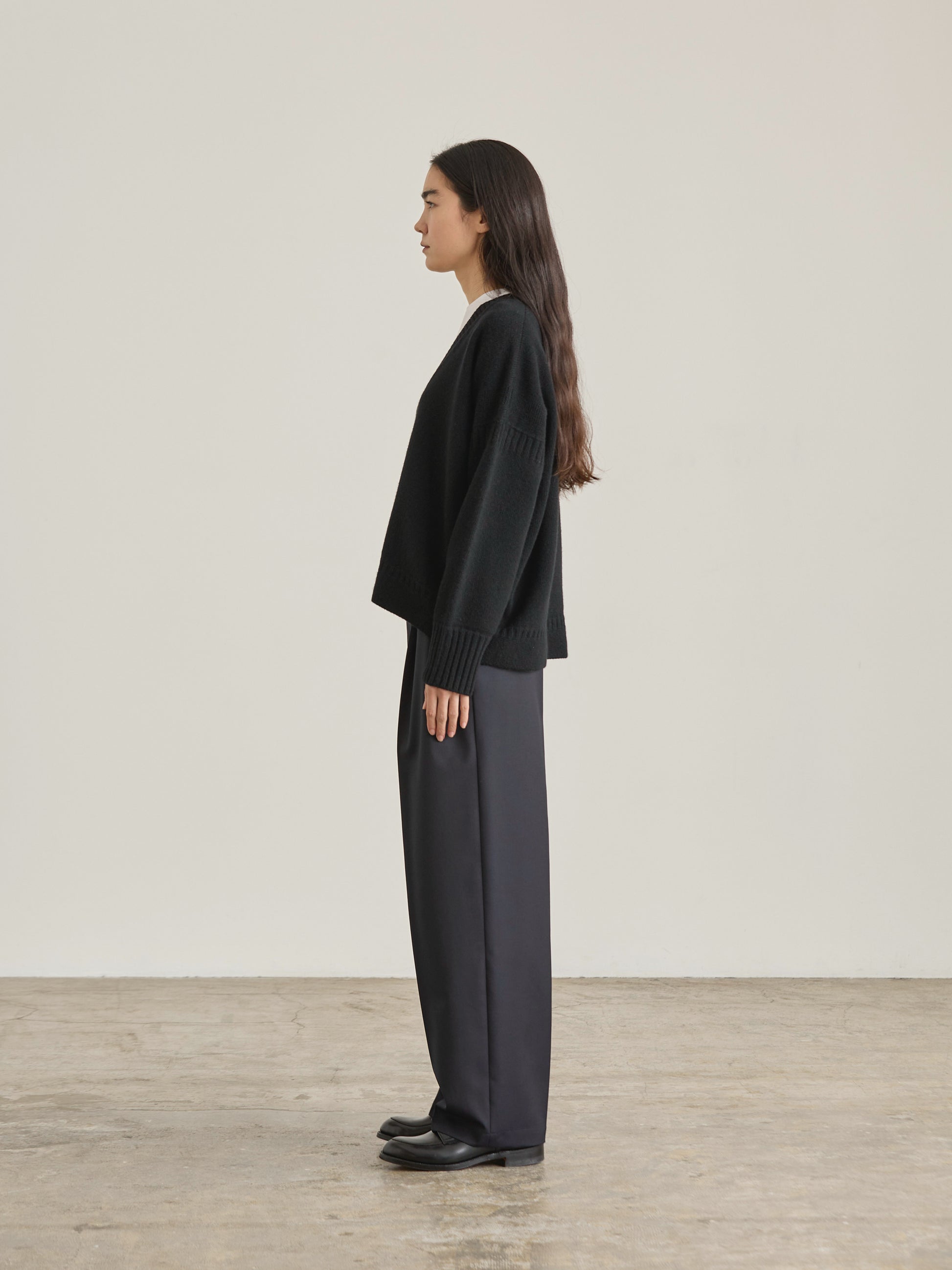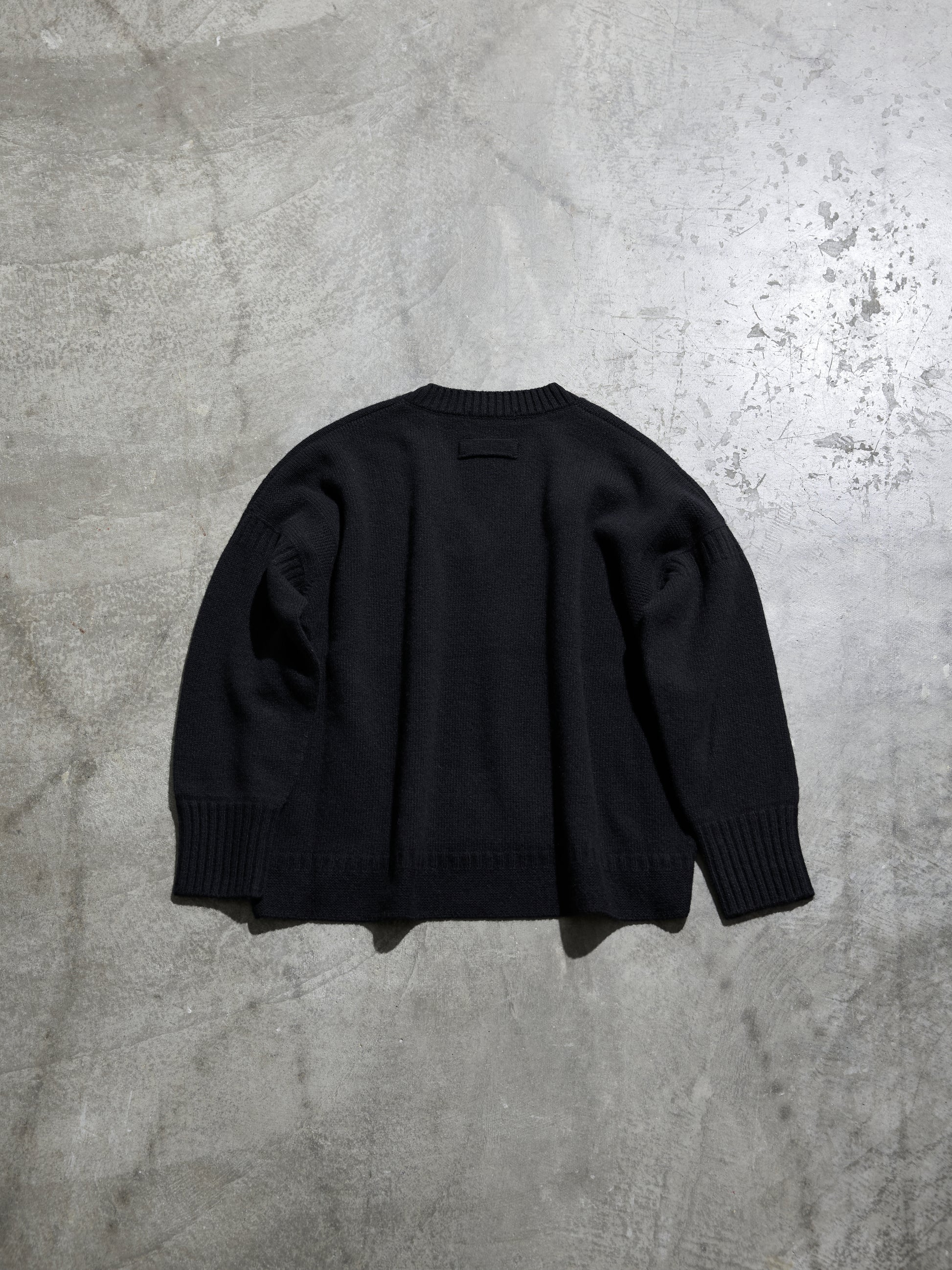 クラシカルなアイテムをモダンにアレンジしたビッグシルエットニット。ガンジーニットのディテール、雰囲気を残しつつサイズバランスを見直し、大人の女性が着用出来るVネックに仕上げました。インナーTシャツやシャツとのコーディネートをお楽しみ下さい。