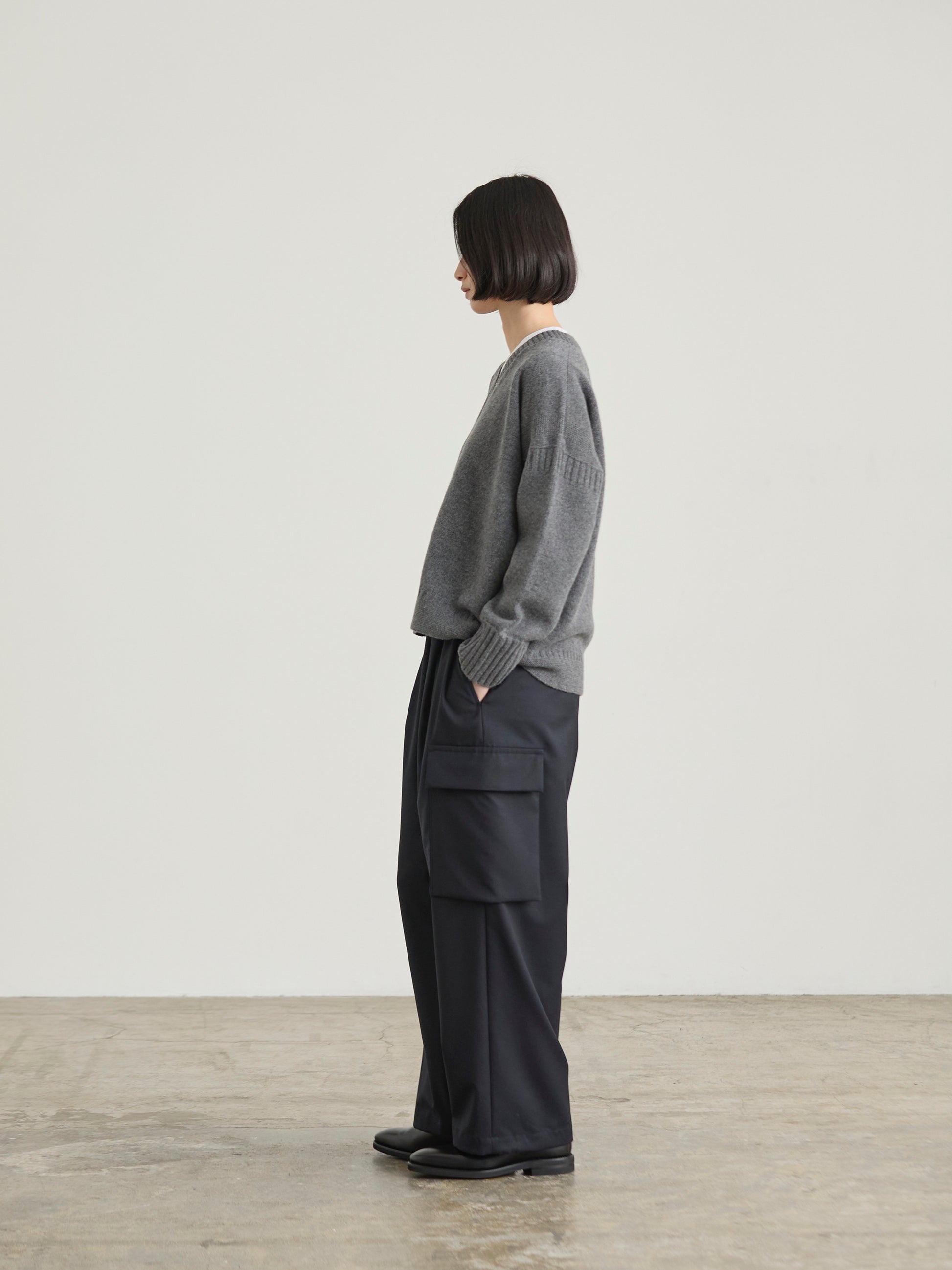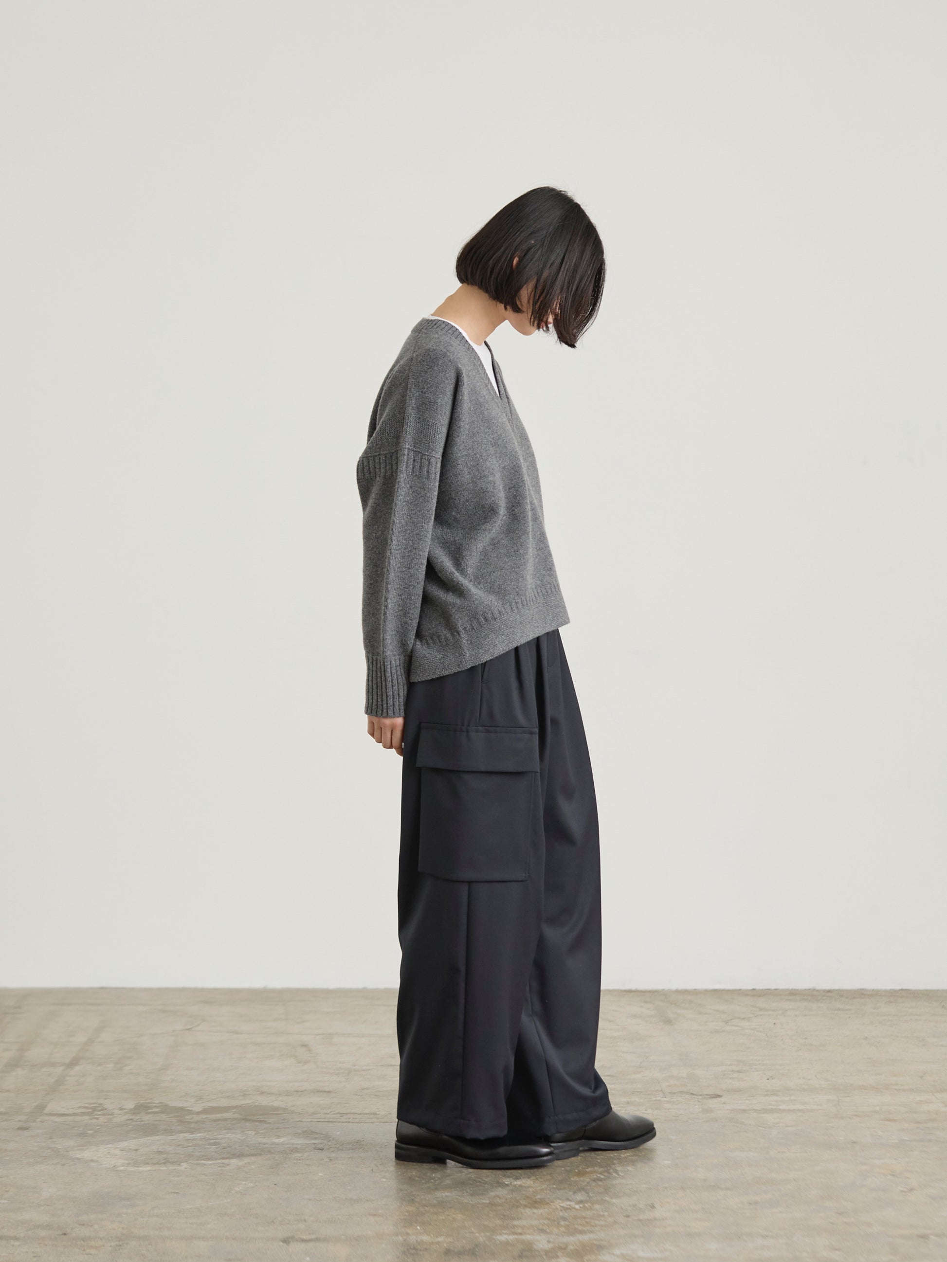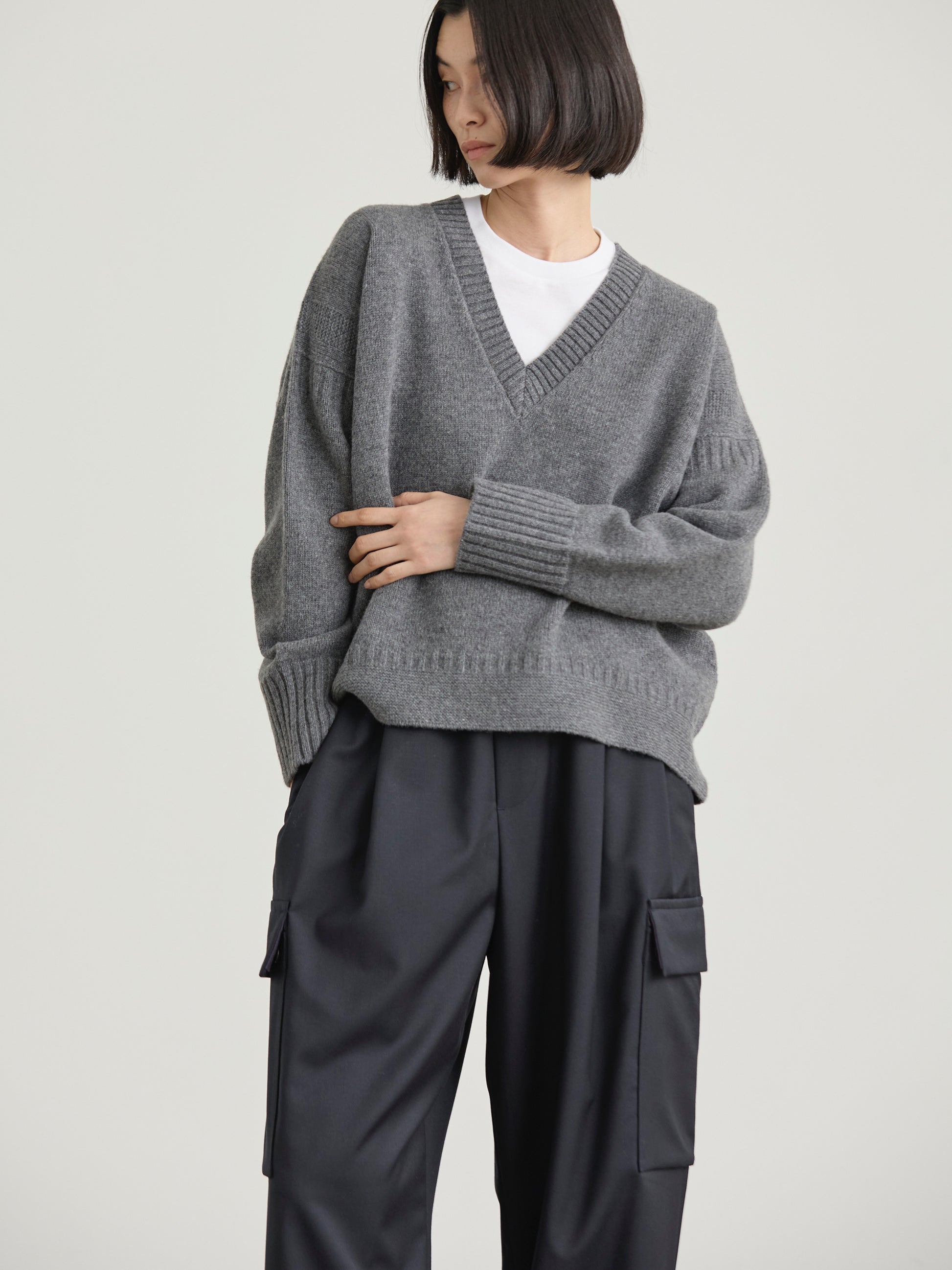 クラシカルなアイテムをモダンにアレンジしたビッグシルエットニット。ガンジーニットのディテール、雰囲気を残しつつサイズバランスを見直し、大人の女性が着用出来るVネックに仕上げました。インナーTシャツやシャツとのコーディネートをお楽しみ下さい。