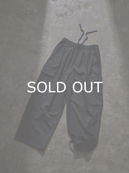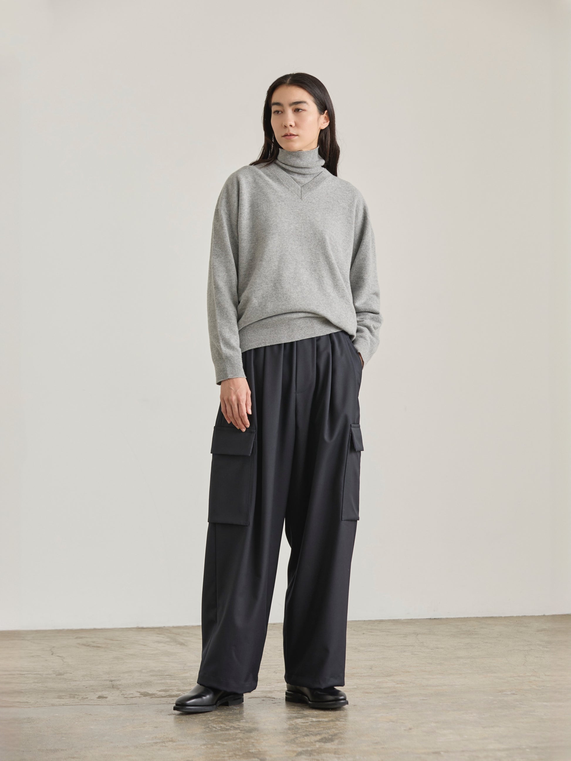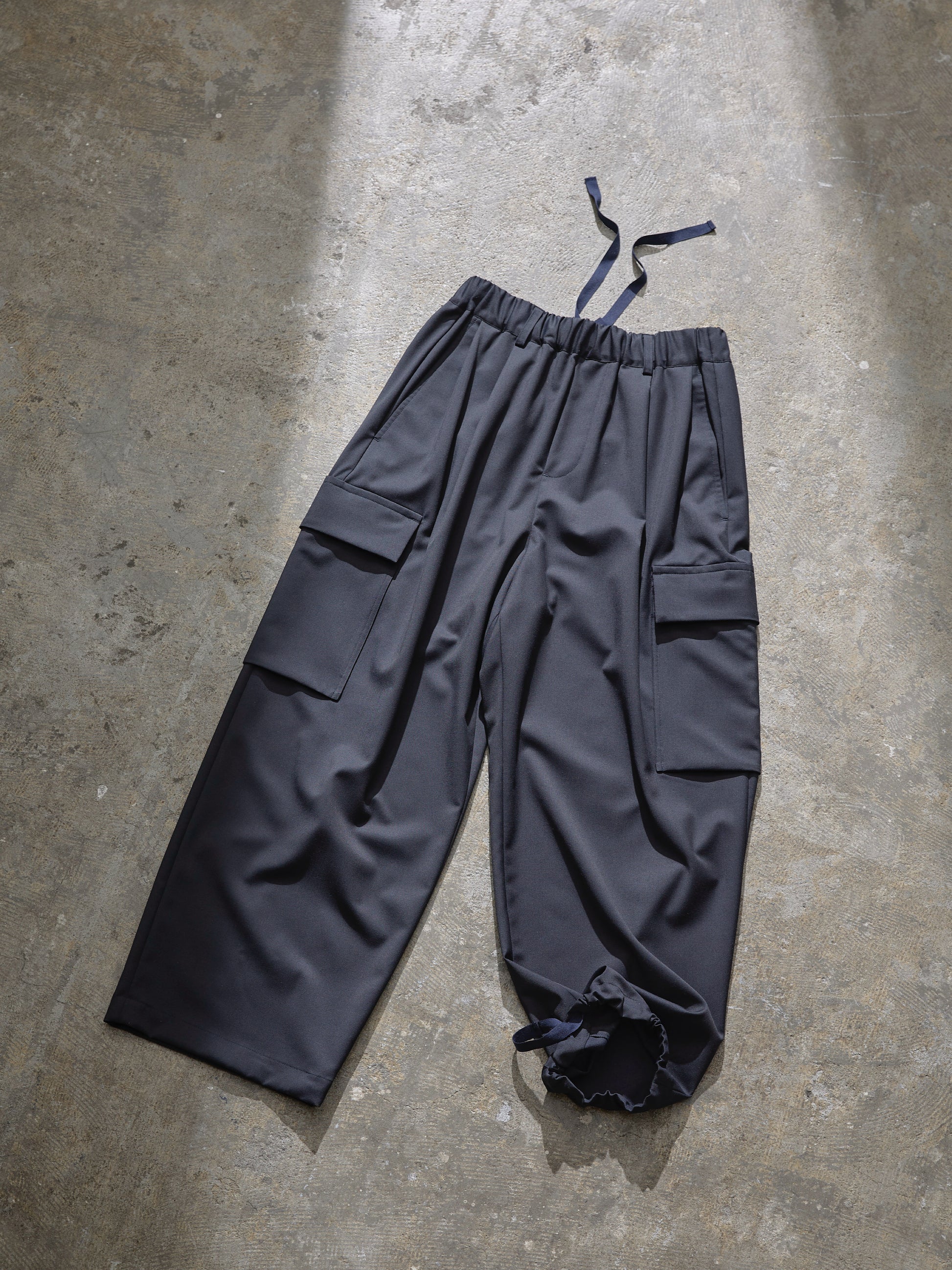 2タックのワイドシルエットのカーゴパンツ。ショートやロング、ジャスト、ビッグなどいろいろなトップスとも好相性。腰回りにゆとりをもたせたウエストゴムのイージーパンツ仕様。デザインポイントのサイドポケットと後フラップポケット、裾のドローコードをアレンジした2wayの着こなしをお楽しみ下さい。
