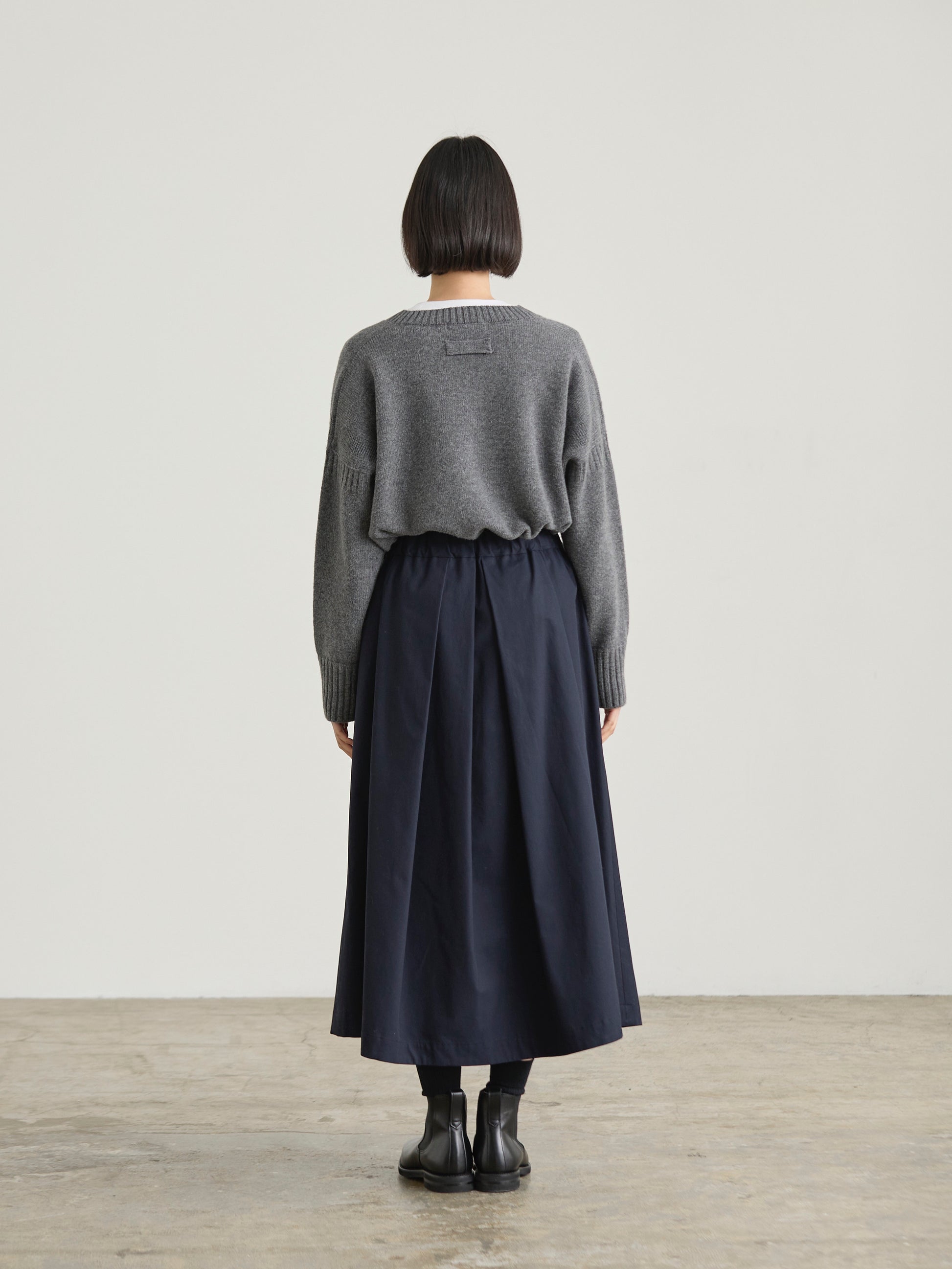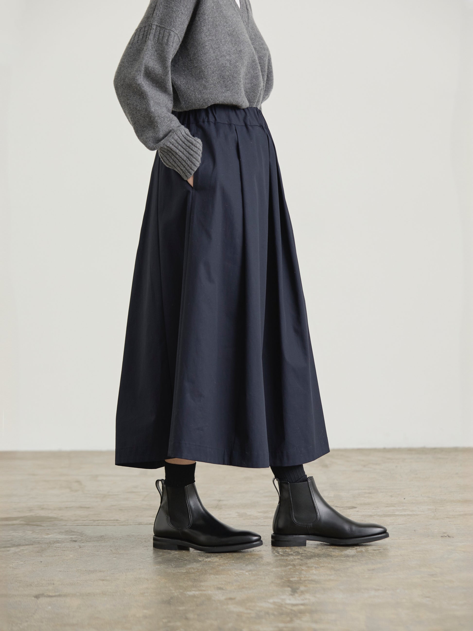 たっぷりとったボリュームとランダムに入ったタックが人気のスカート。ウエストはゴム仕様に加えフィット感を高めるドローストリング。足首まである丈が大人な印象を与えてくれます。
