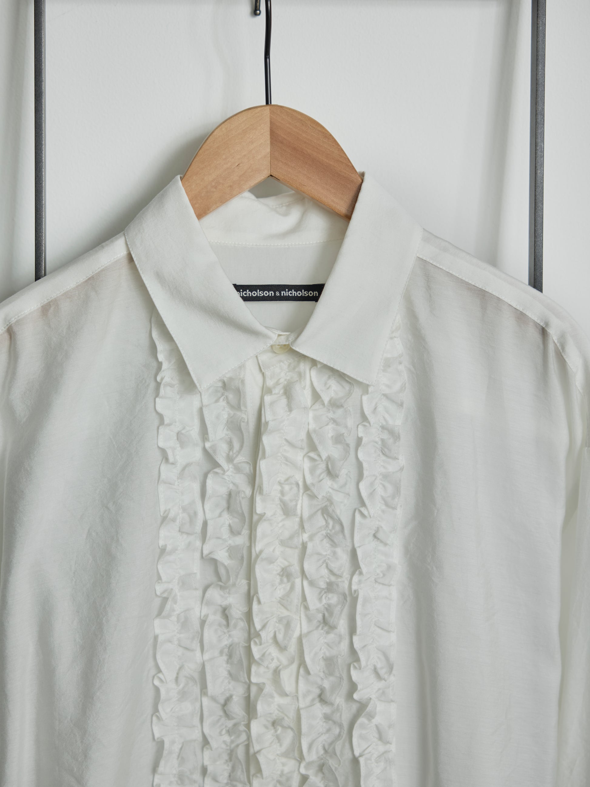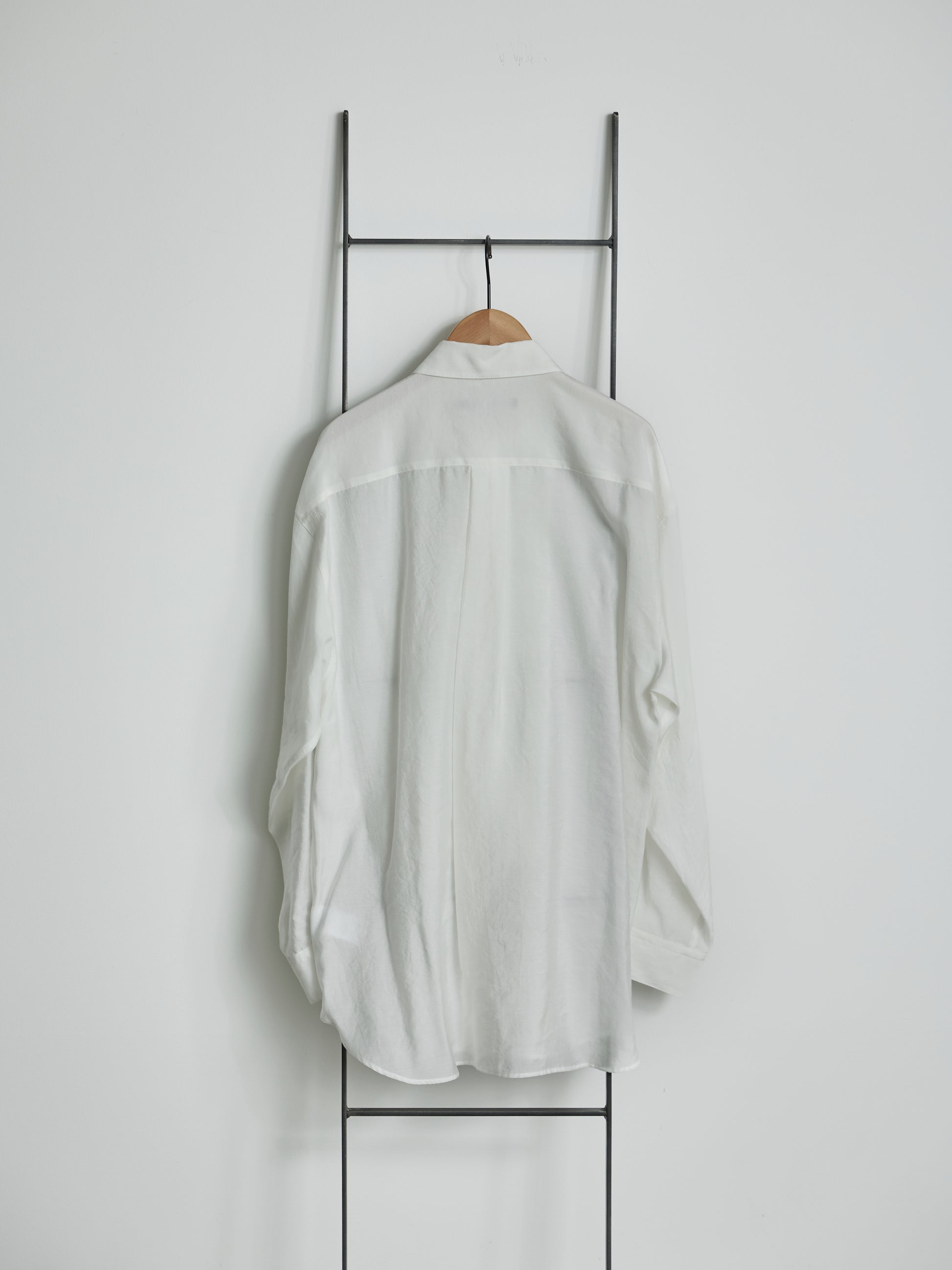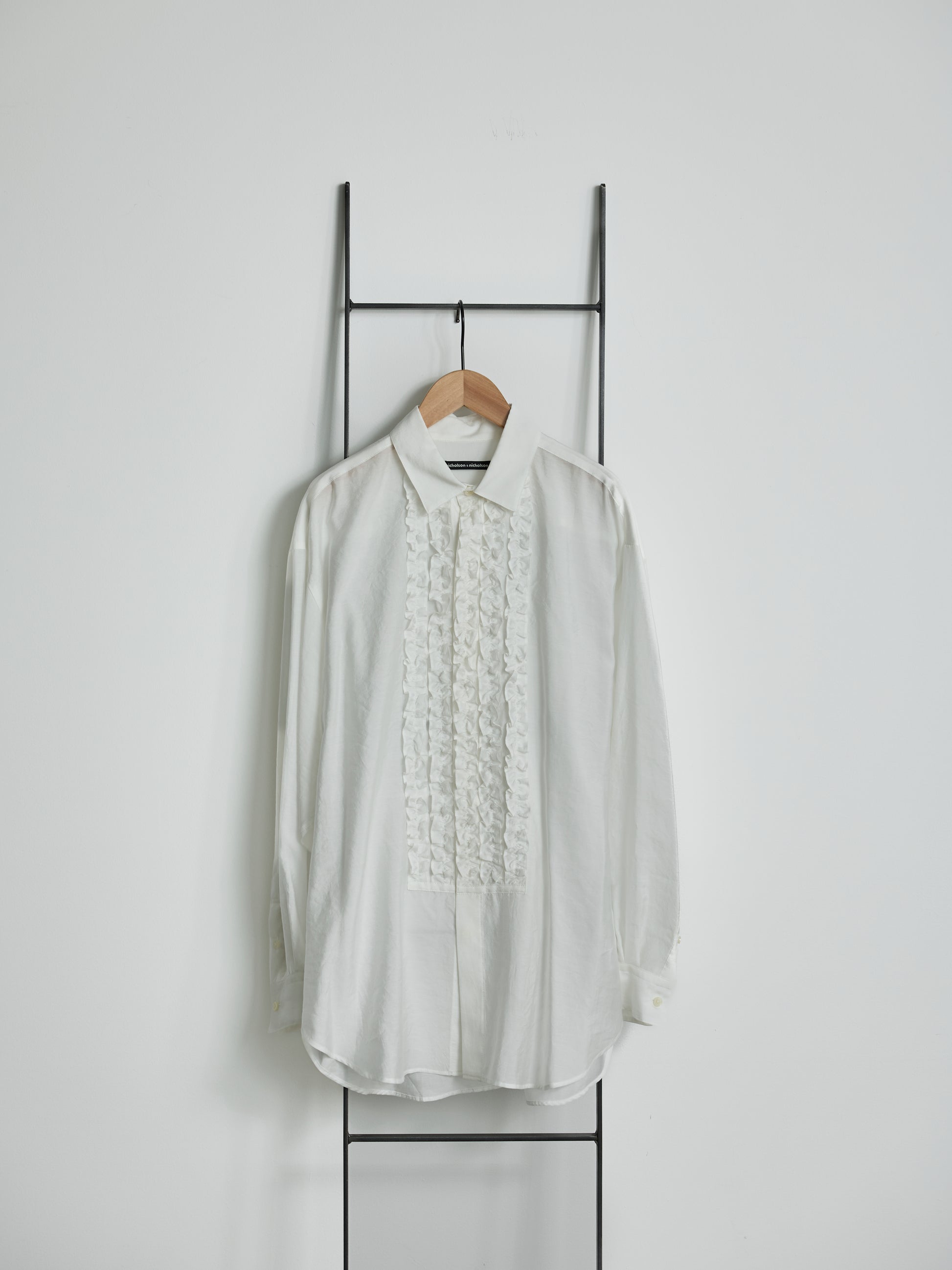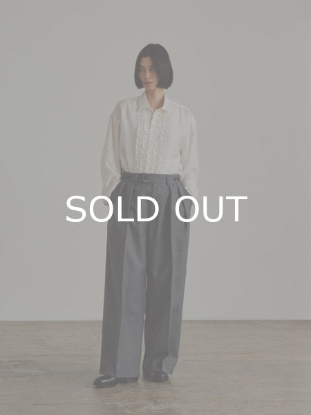 オケージョンにもカジュアルダウンした装いにも活躍してくれる大人のブラウスです。前身頃にあしらったテープ状のフリルが華やかさを与えてくれ、ゆとりあるユニセックスなフィット感との組み合わせによる新しさもお楽しみいただけます。