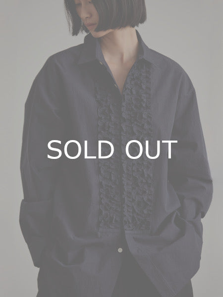 オケージョンにもカジュアルダウンした装いにも活躍してくれる大人のブラウスです。前身頃にあしらったテープ状のフリルが華やかさを与えてくれ、ゆとりあるユニセックスなフィット感との組み合わせによる新しさもお楽しみいただけます。