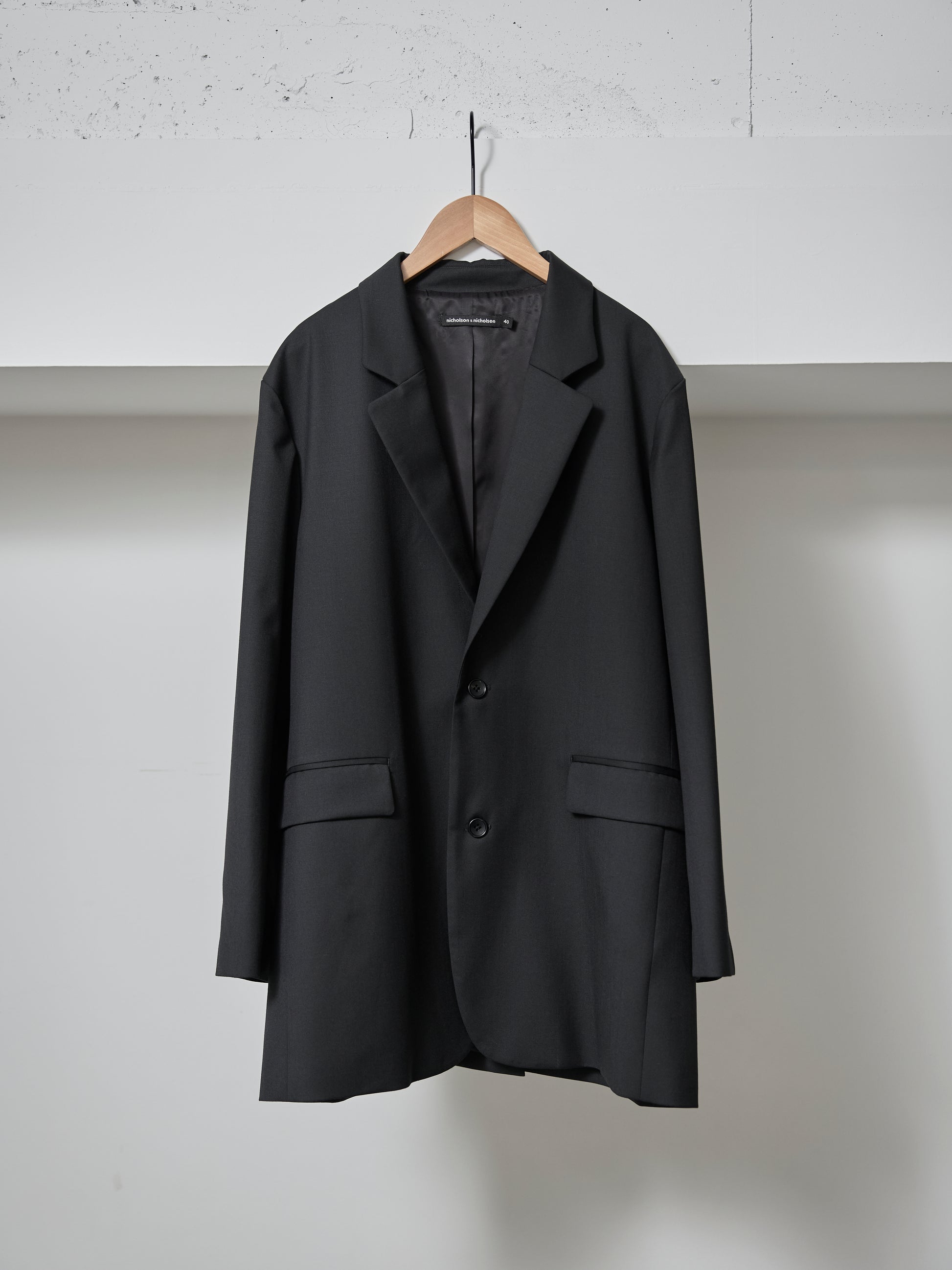 ゴージラインを低めに設定したリラックスフィットのシングルブレステッドブレザー。2ボタンフロント、両脇フラップポケット、内側の縫製仕様などテイラードブレザーのディテールを踏襲しながら、大人の女性が普段使いできるように軽さとシルエットにこだわりました。肩パッドや裄わたなどを廃したミニマルな仕様とデザインも魅力。