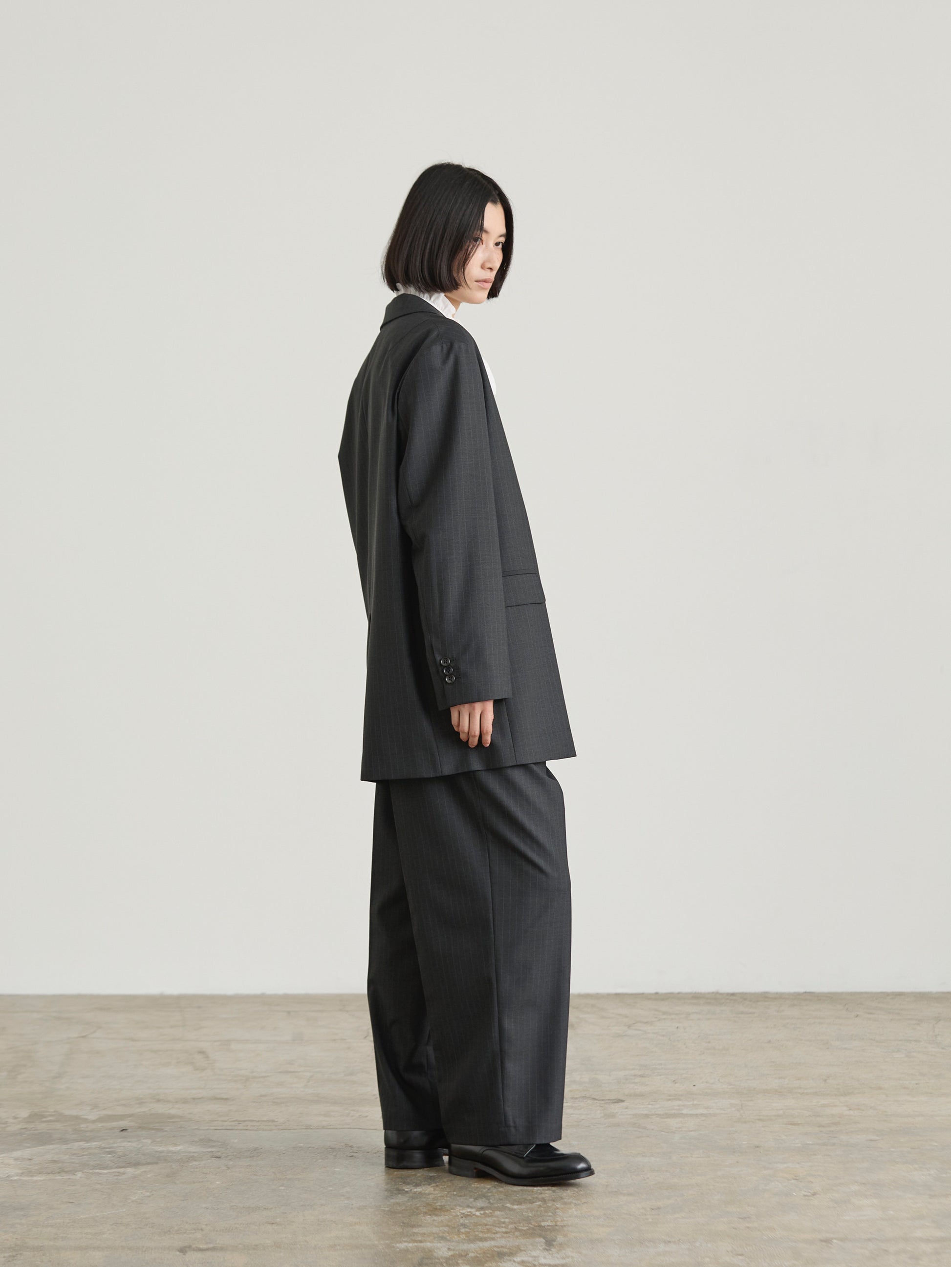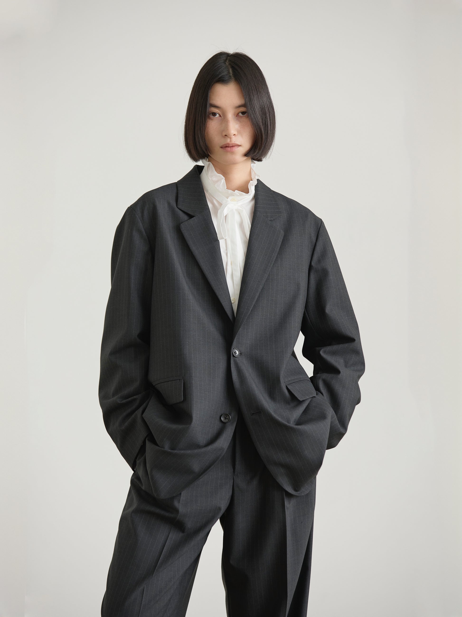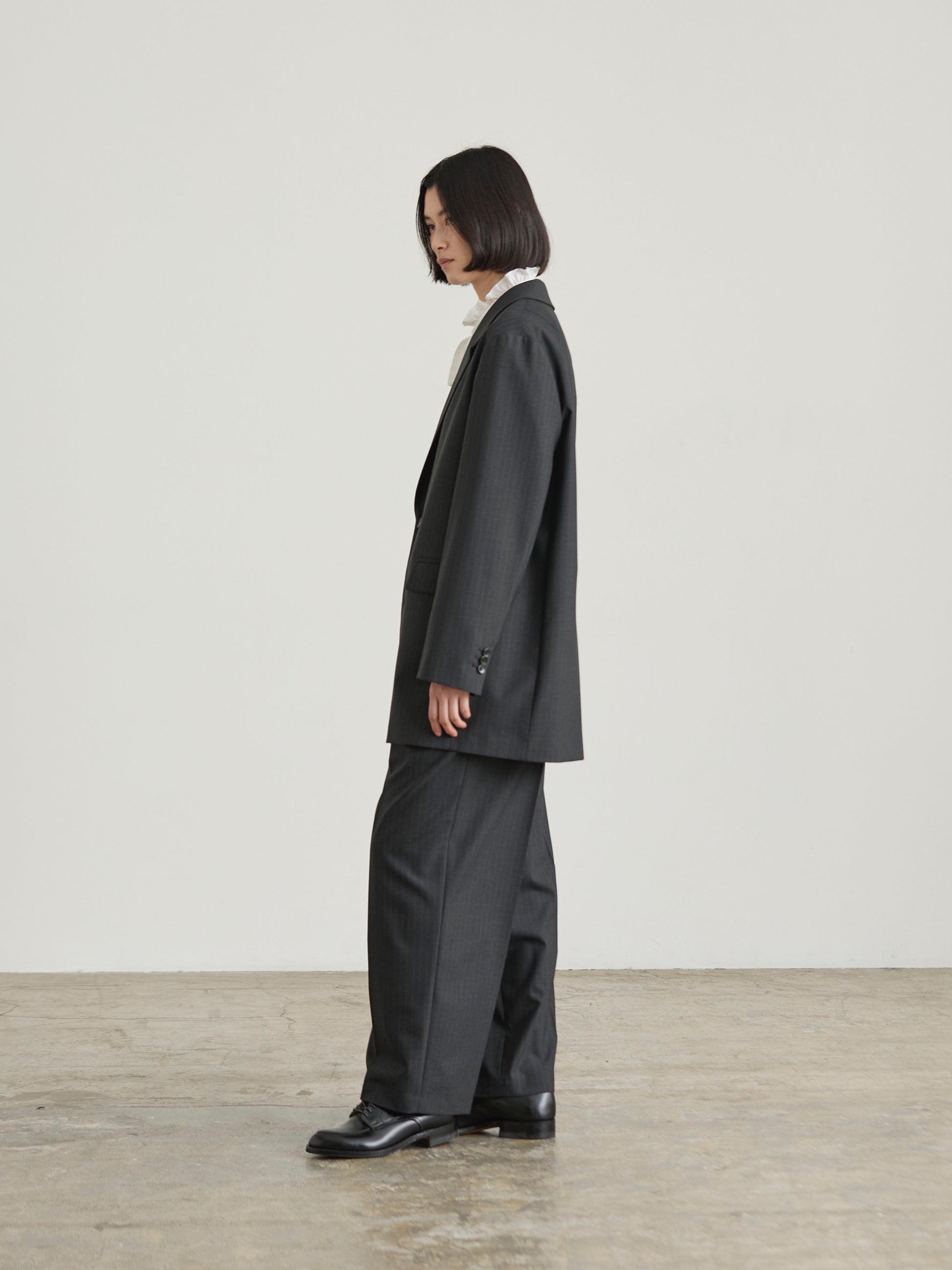 ゴージラインを低めに設定したリラックスフィットのシングルブレステッドブレザー。2ボタンフロント、両脇フラップポケット、内側の縫製仕様などテイラードブレザーのディテールを踏襲しながら、大人の女性が普段使いできるように軽さとシルエットにこだわりました。肩パッドや裄わたなどを廃したミニマルな仕様とデザインも魅力。