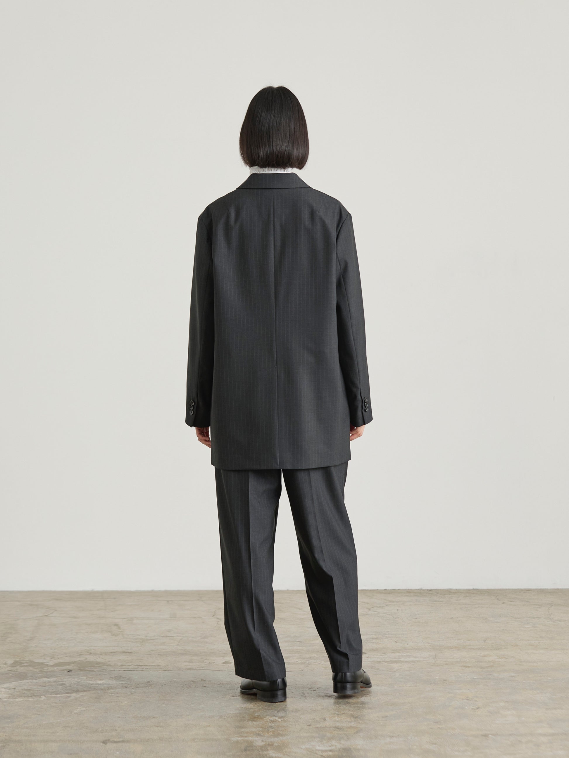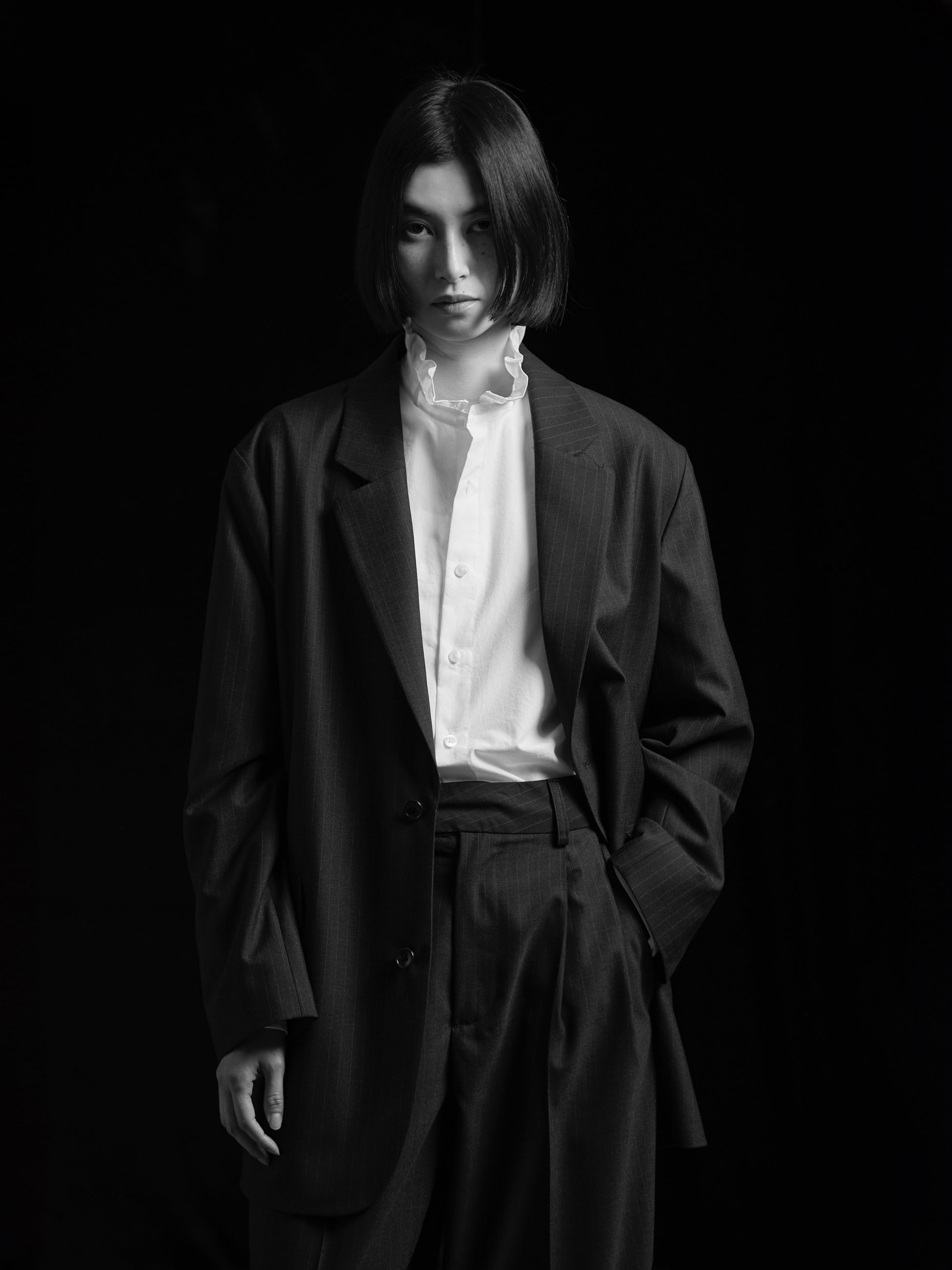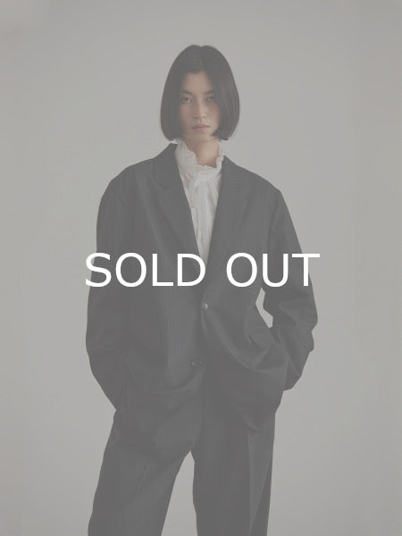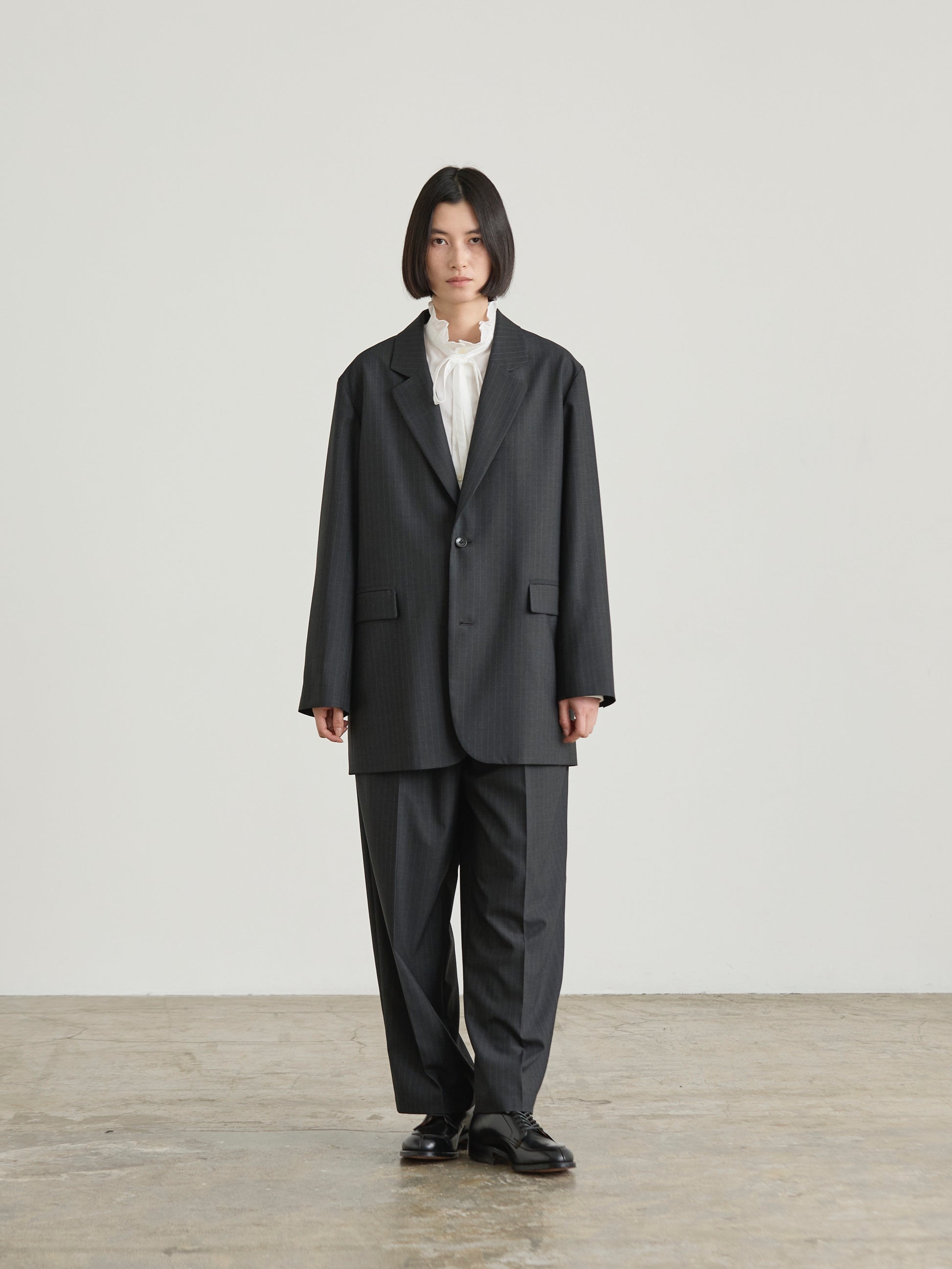ゴージラインを低めに設定したリラックスフィットのシングルブレステッドブレザー。2ボタンフロント、両脇フラップポケット、内側の縫製仕様などテイラードブレザーのディテールを踏襲しながら、大人の女性が普段使いできるように軽さとシルエットにこだわりました。肩パッドや裄わたなどを廃したミニマルな仕様とデザインも魅力。