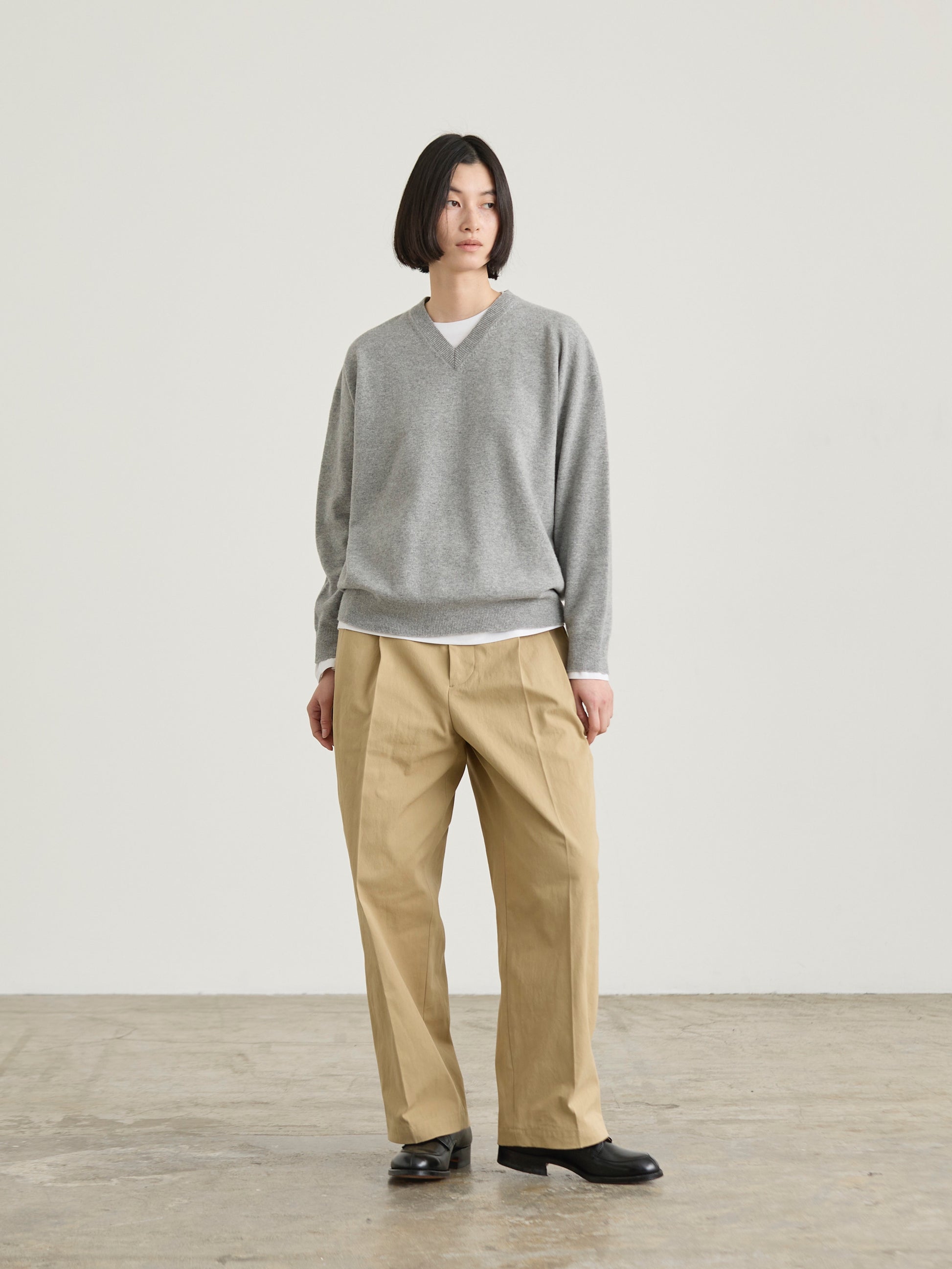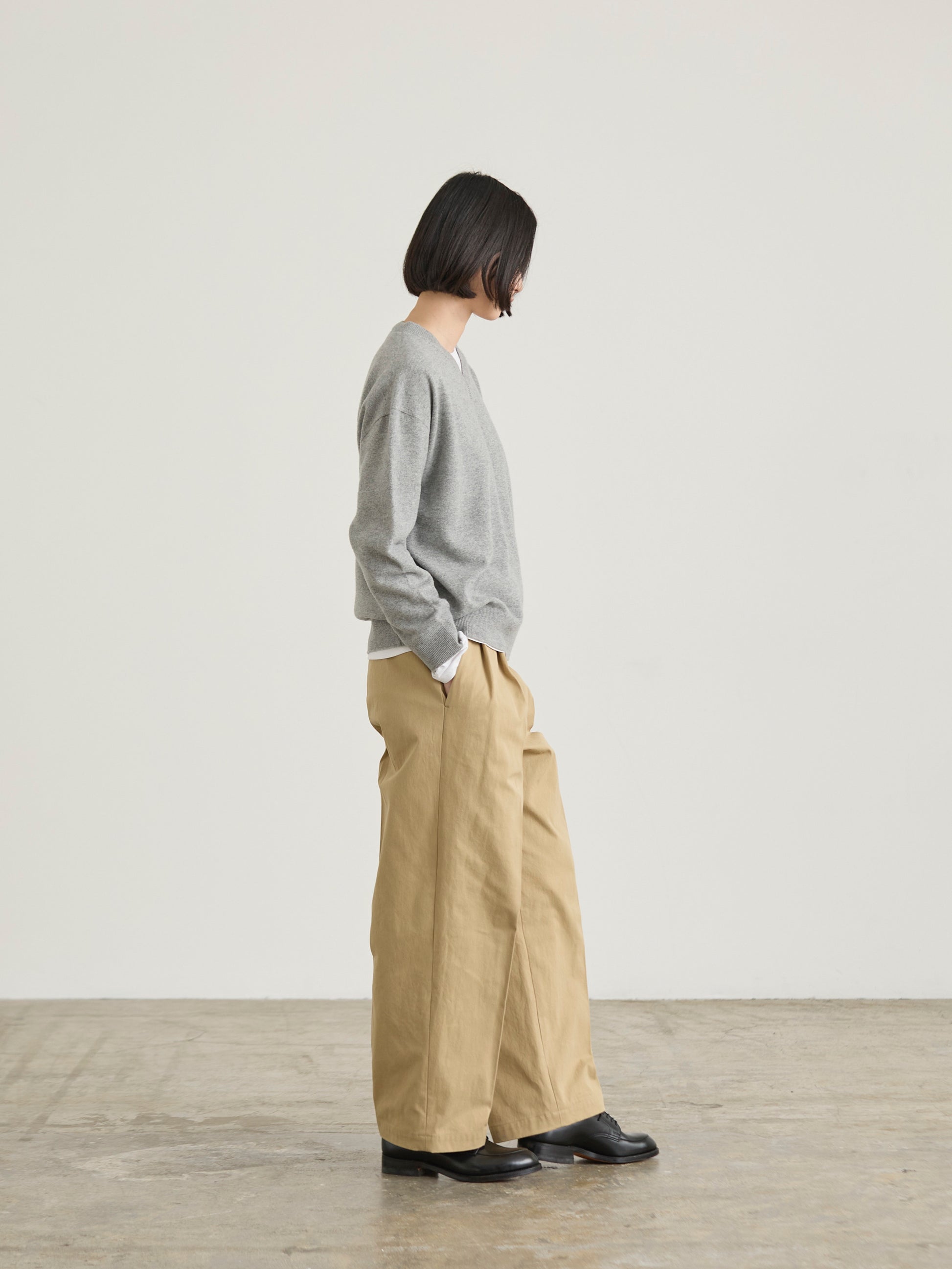 小さめのVゾーンでインナーTシャツとの相性も良好の大人のVネックニット。 大人の女性にもスタイリングしやすいようにリラックスフィットのシンプルでシックなスタイルをお楽しみいただけます。