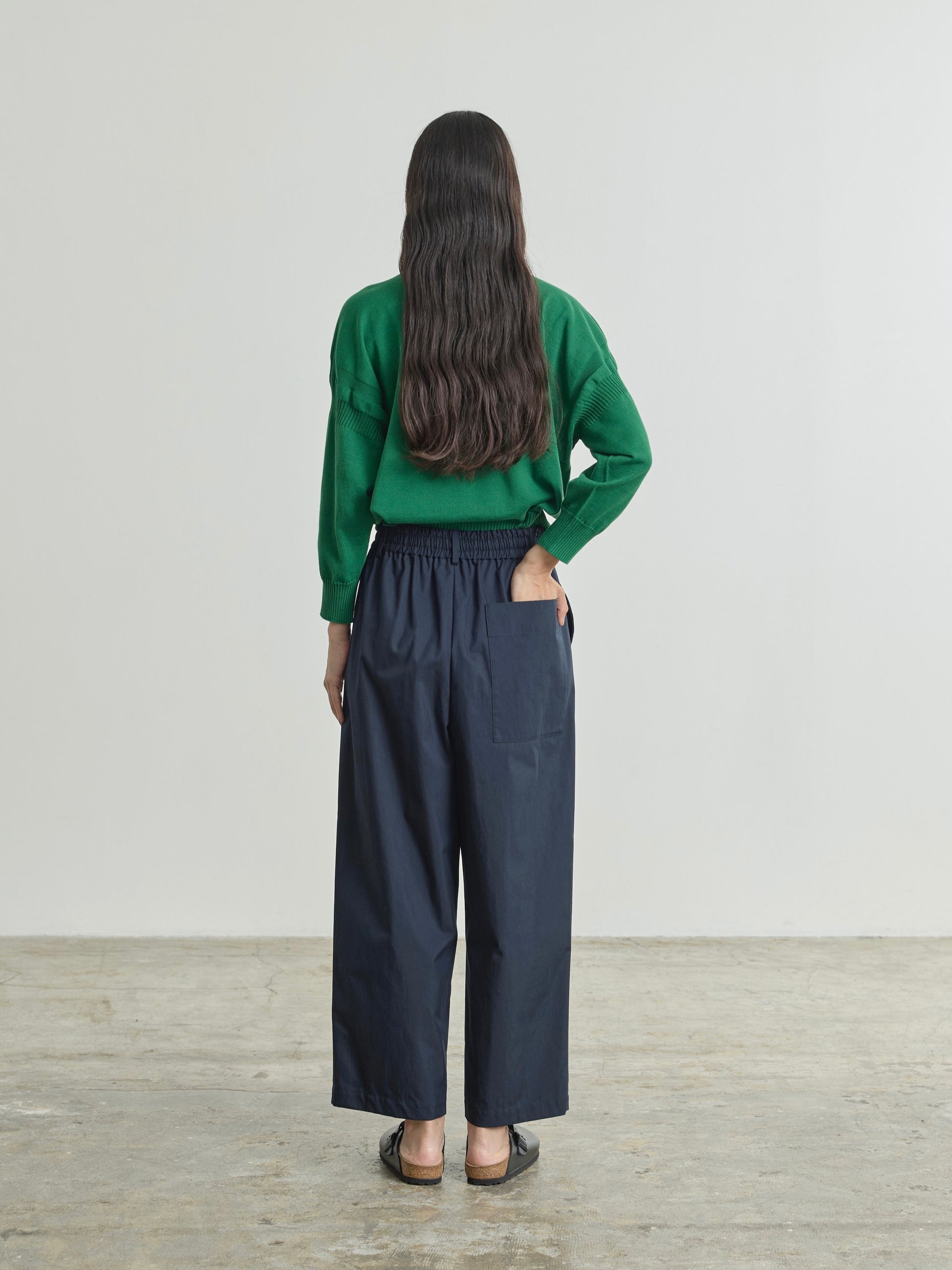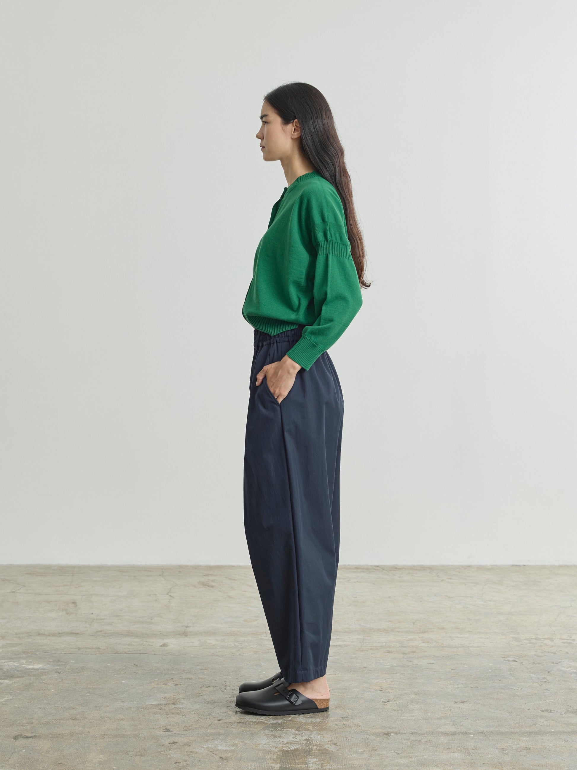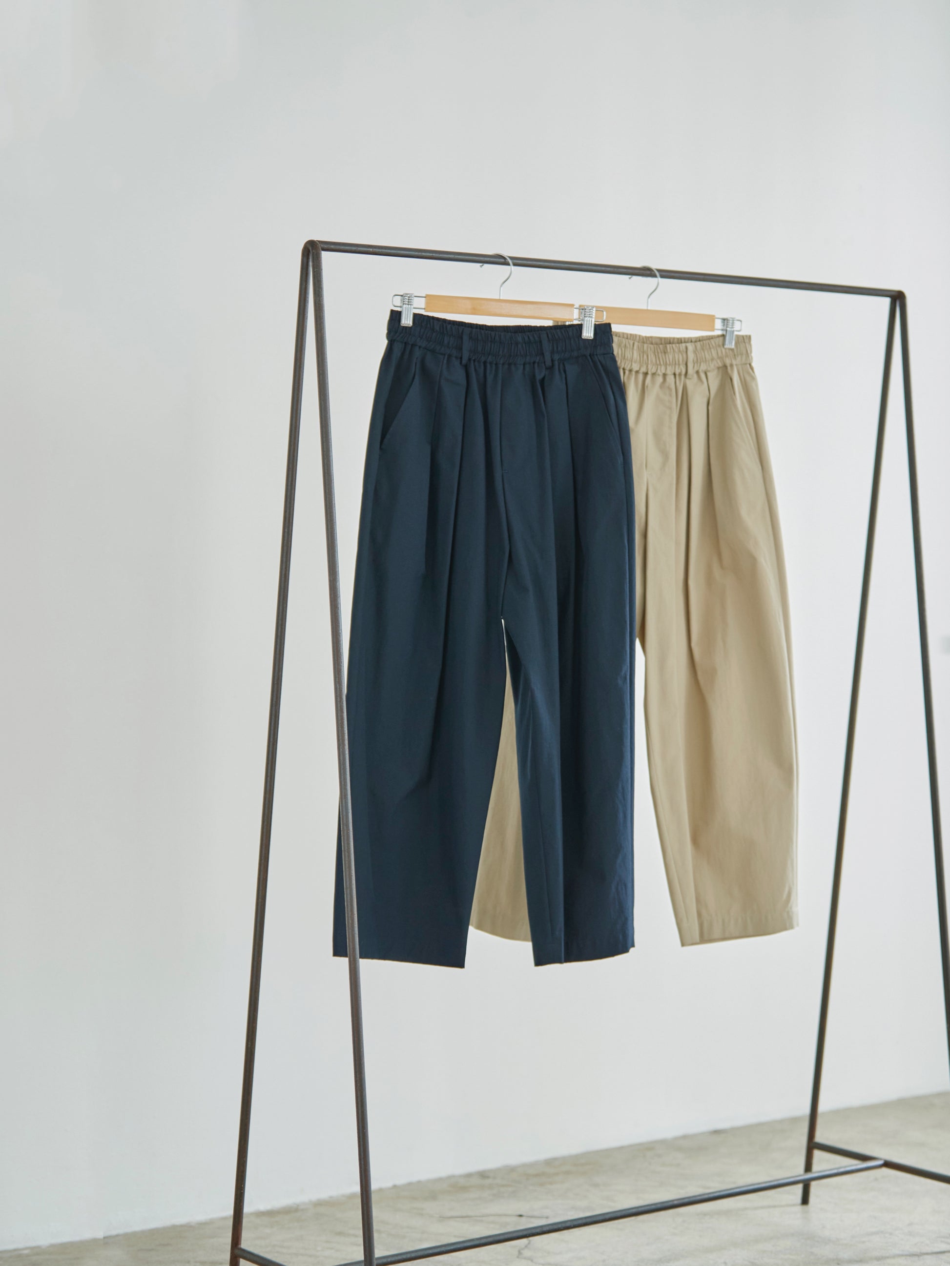 2タックのワイドパンツをイージーに仕上げた一枚。裾に向けてストンとストレートに落とした美しいシルエットが魅力です。ウエストはゴム仕様に加えフィット感を高めるドローストリング。