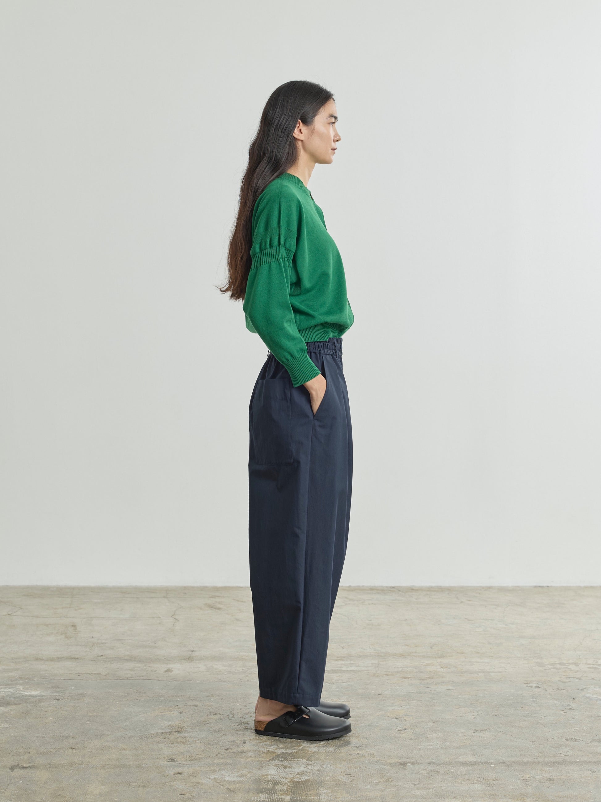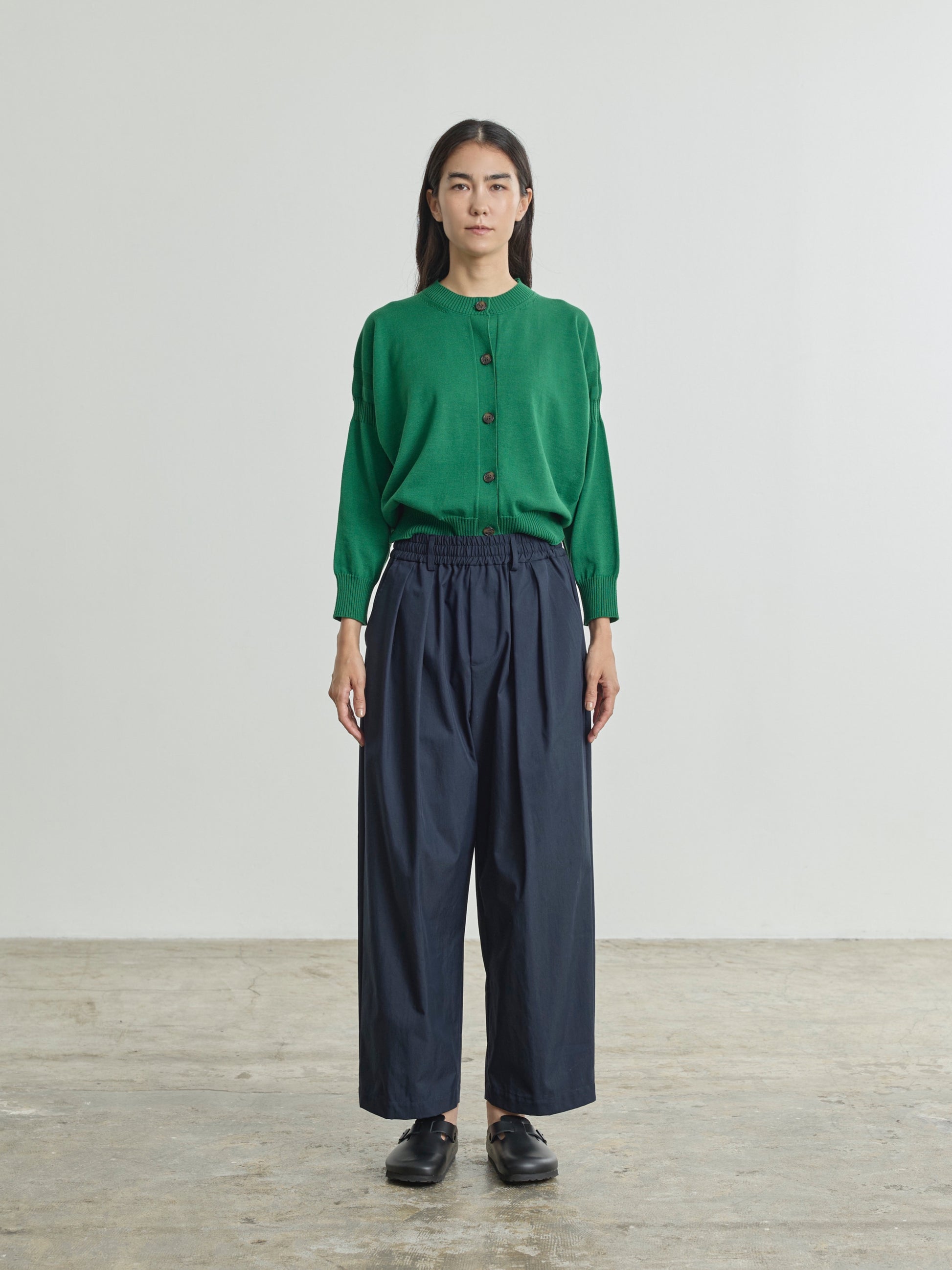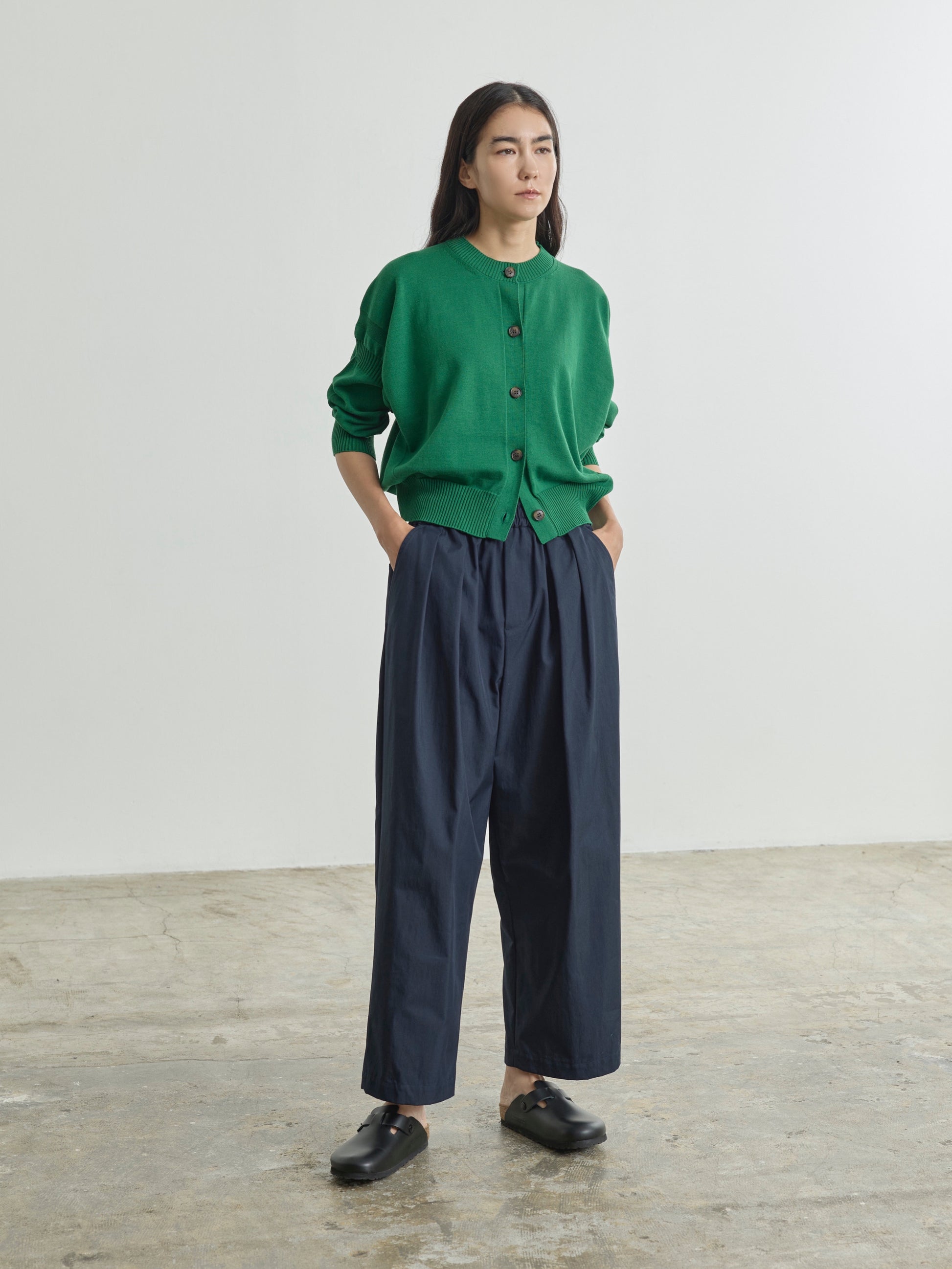 2タックのワイドパンツをイージーに仕上げた一枚。裾に向けてストンとストレートに落とした美しいシルエットが魅力です。ウエストはゴム仕様に加えフィット感を高めるドローストリング。