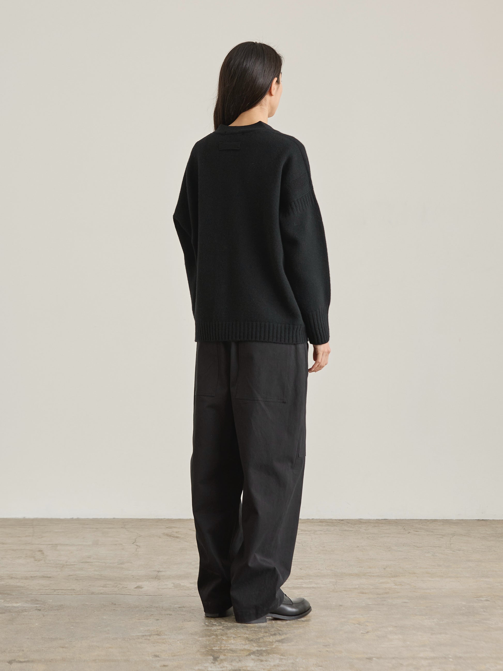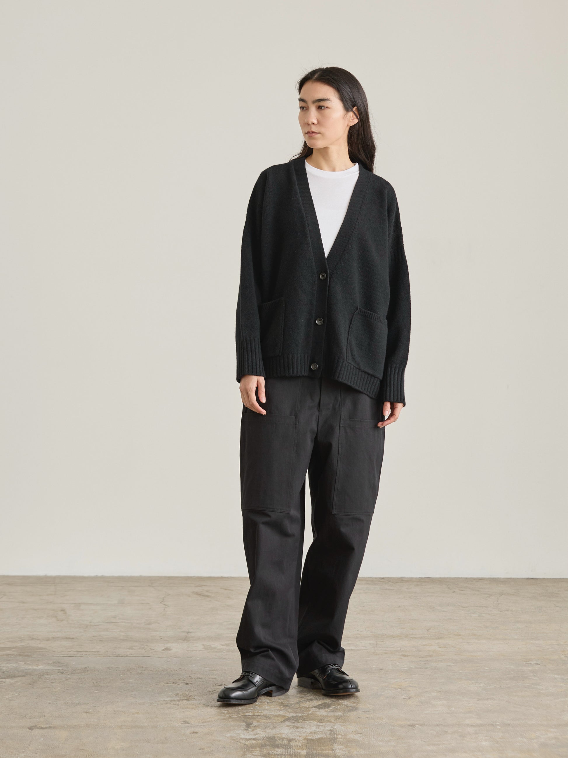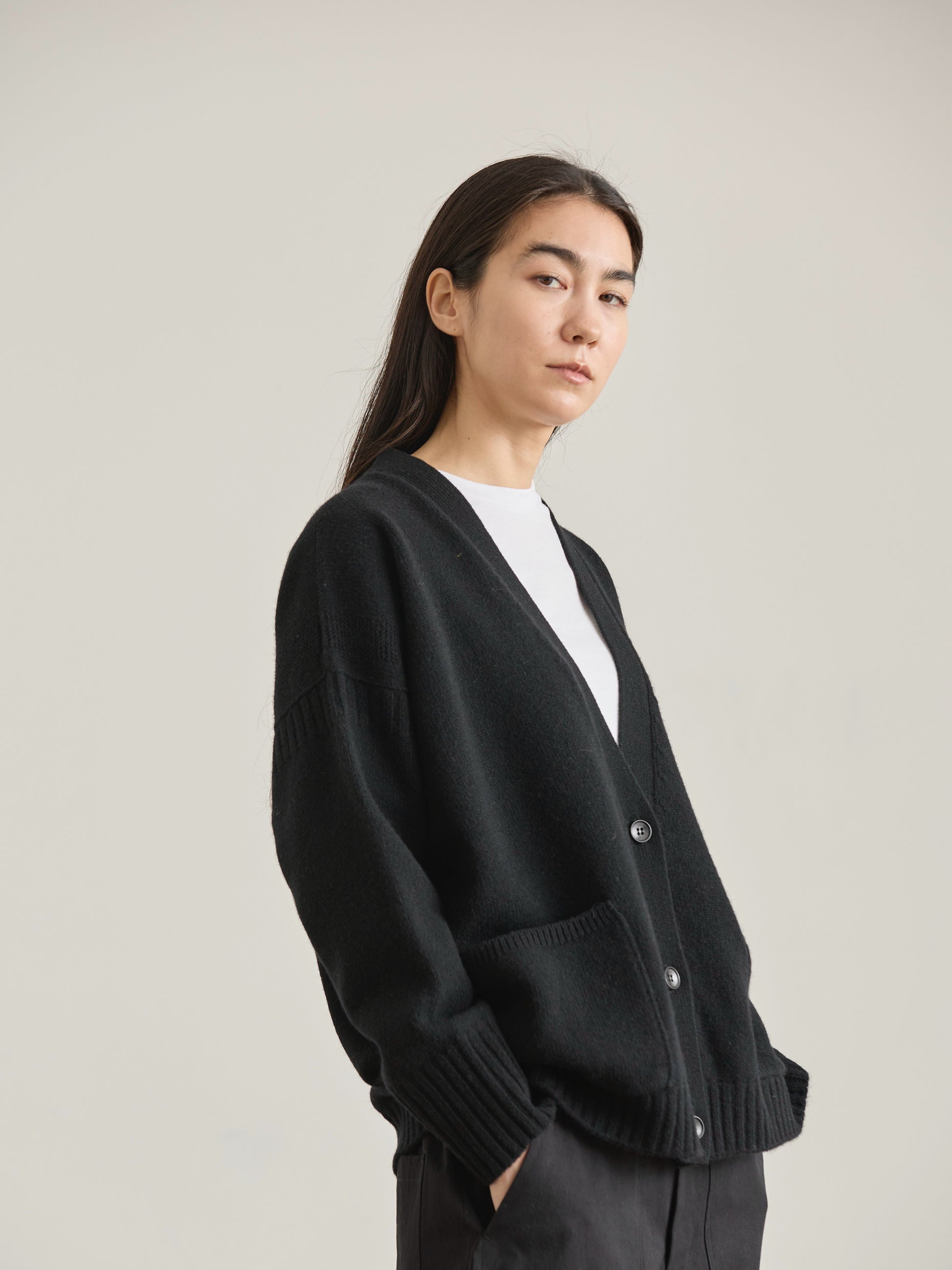 レイヤードスタイルに欠かせないニットカーディガン。クラシカルなアイテムをモダンにアレンジしたビッグシルエットニット。ガンジーニットのディテール、雰囲気を残しつつサイズバランスを見直し、大人の女性が着用できるVネックカーディガンに仕上げました。コーディネートの幅が広がる冬ニットです。