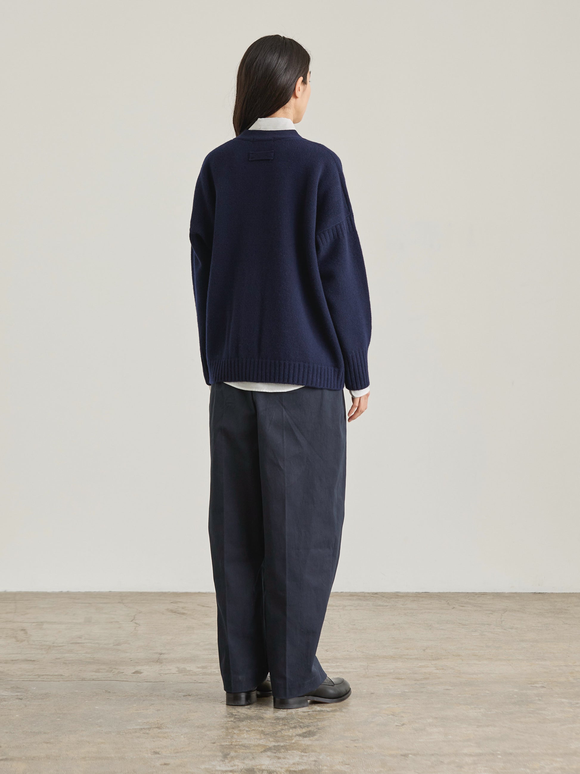 レイヤードスタイルに欠かせないニットカーディガン。クラシカルなアイテムをモダンにアレンジしたビッグシルエットニット。ガンジーニットのディテール、雰囲気を残しつつサイズバランスを見直し、大人の女性が着用できるVネックカーディガンに仕上げました。コーディネートの幅が広がる冬ニットです。