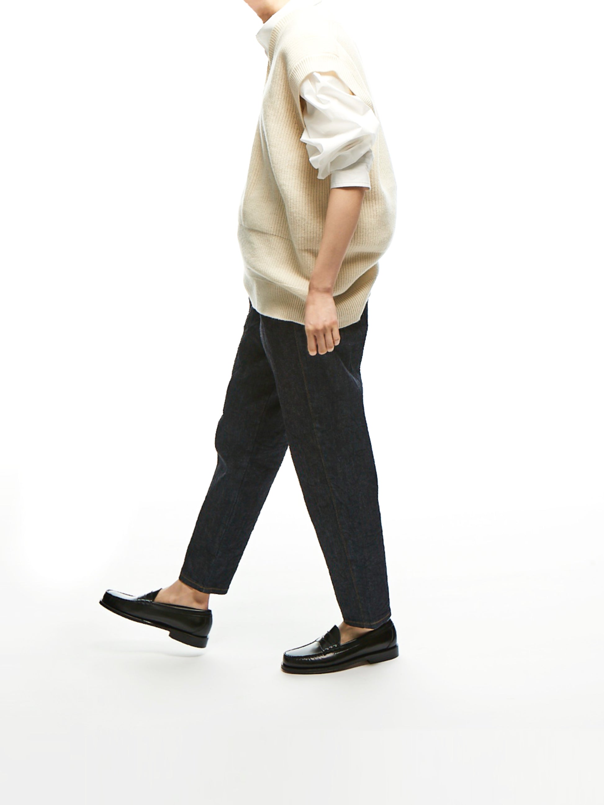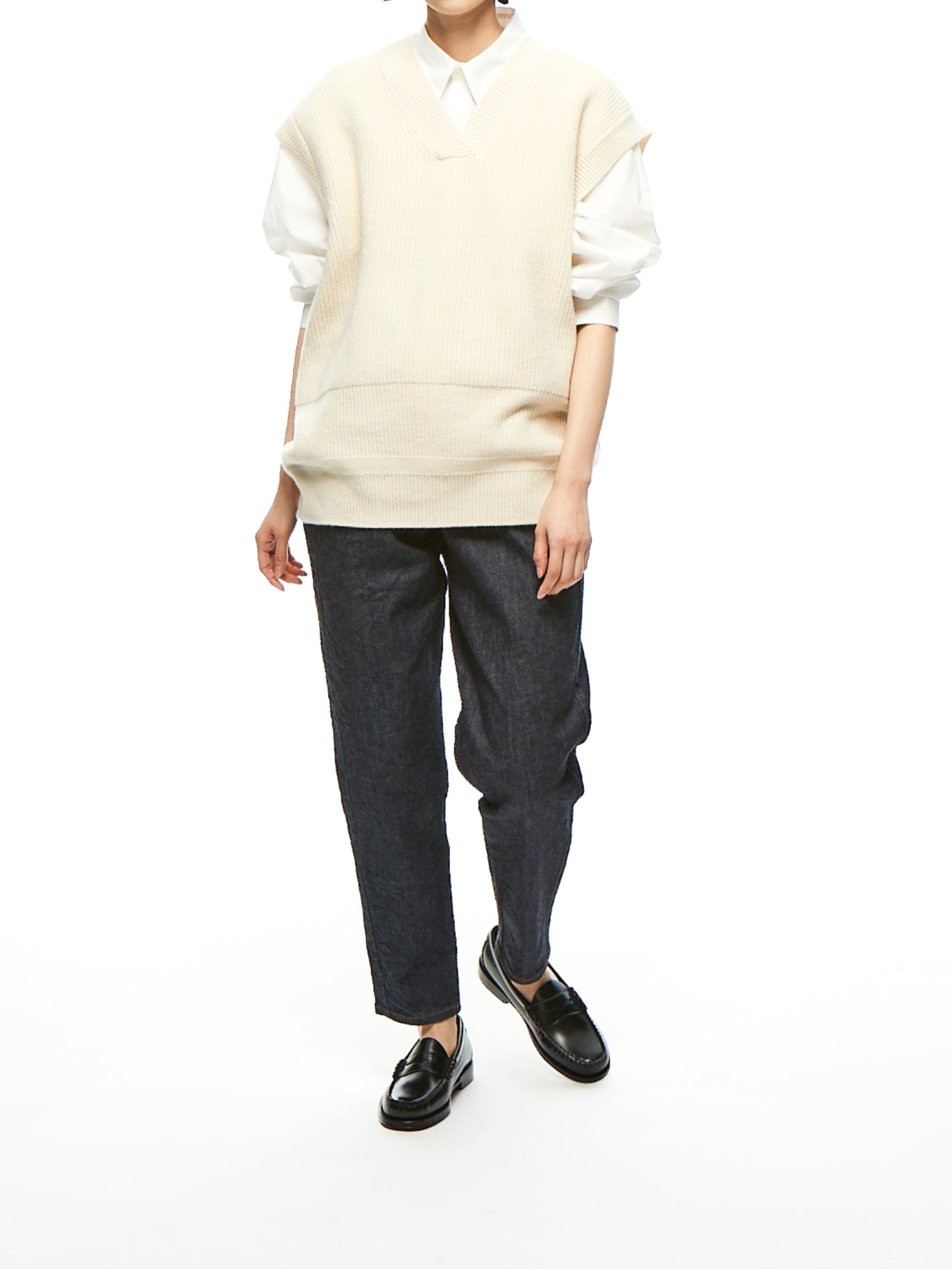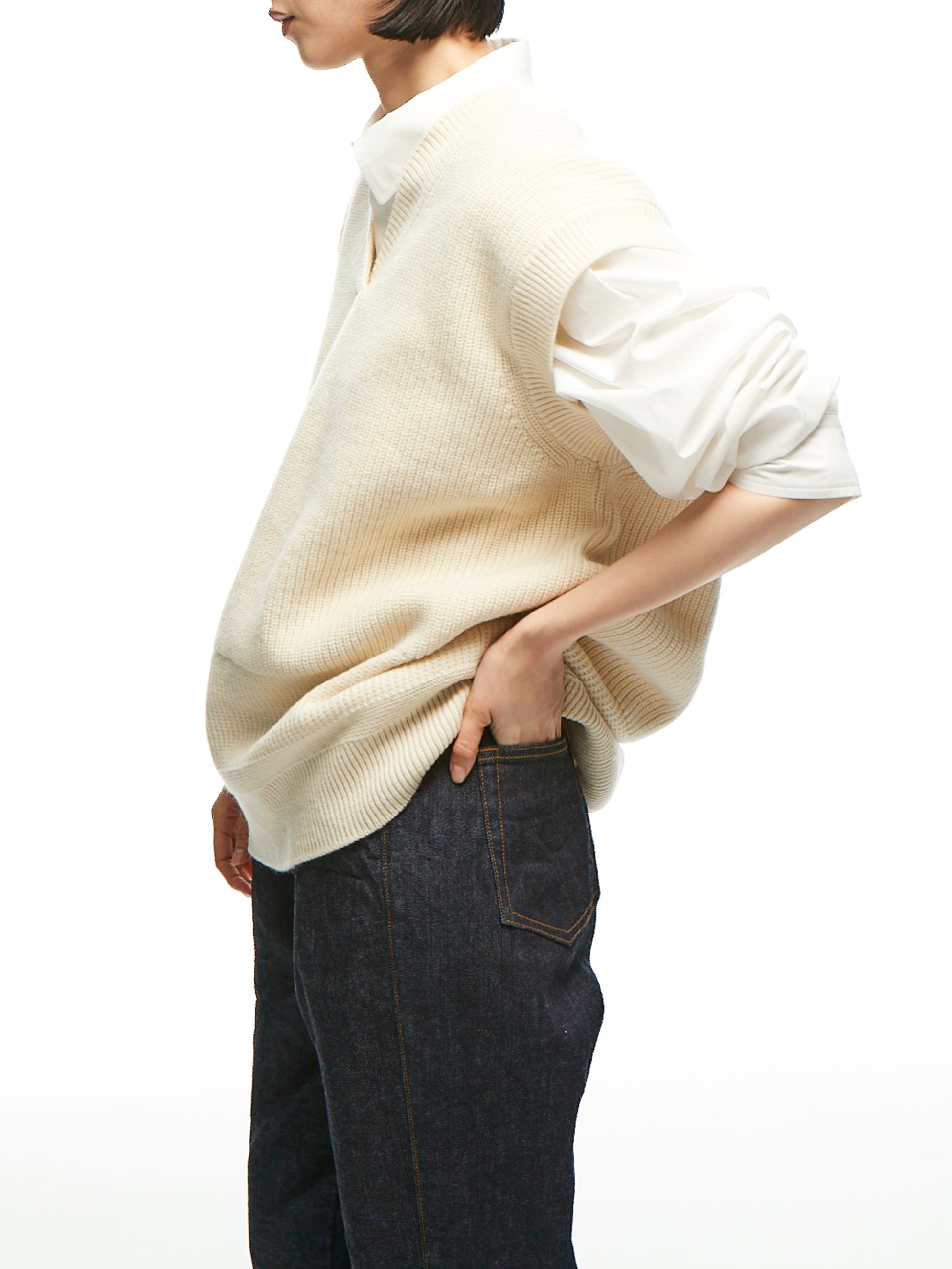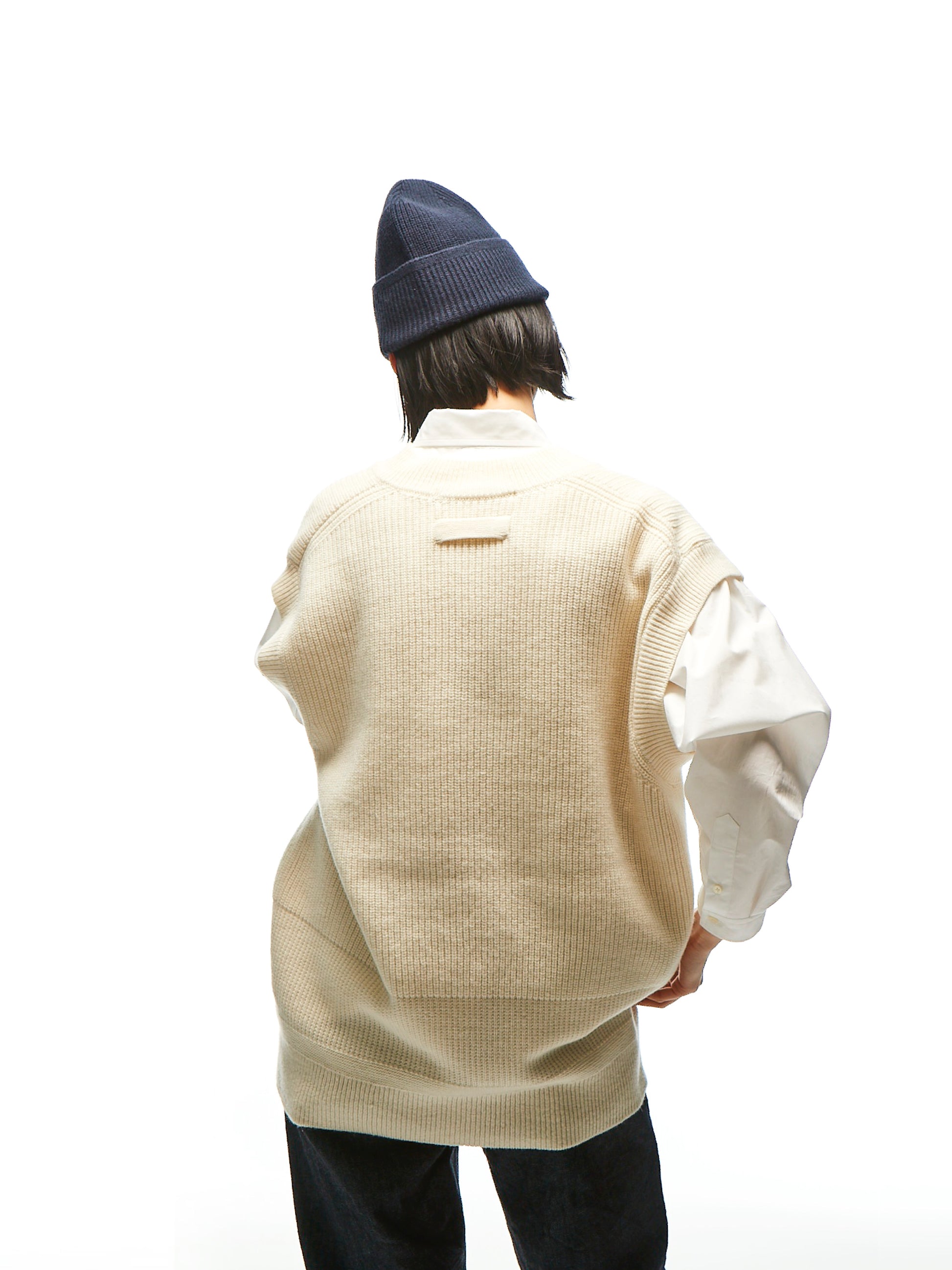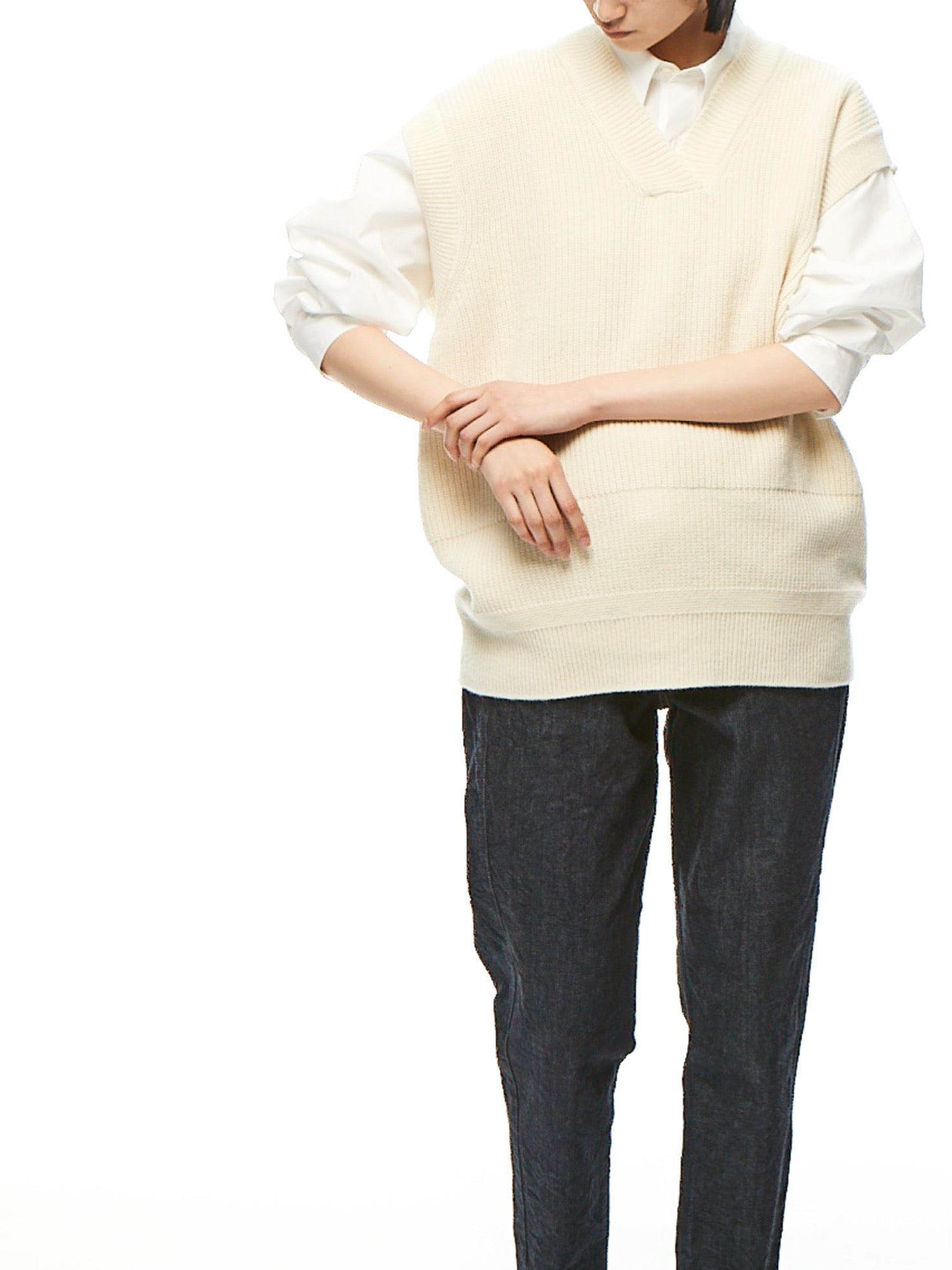 レイヤードスタイルに欠かせないニットベスト。編地の変化でシンプルなデザインにもアクセントを。コーディネートの幅が広がるおすすめのアイテムです。