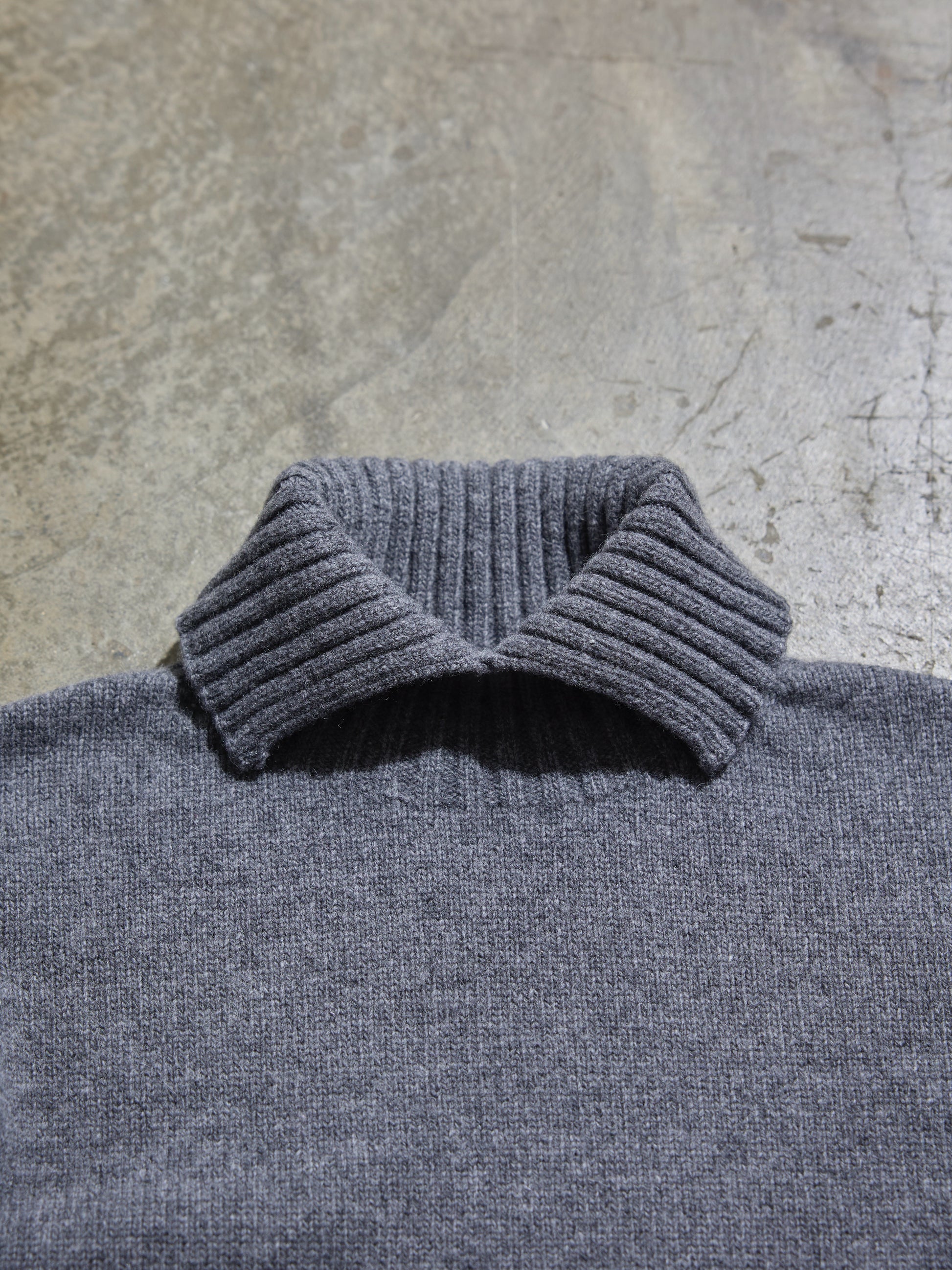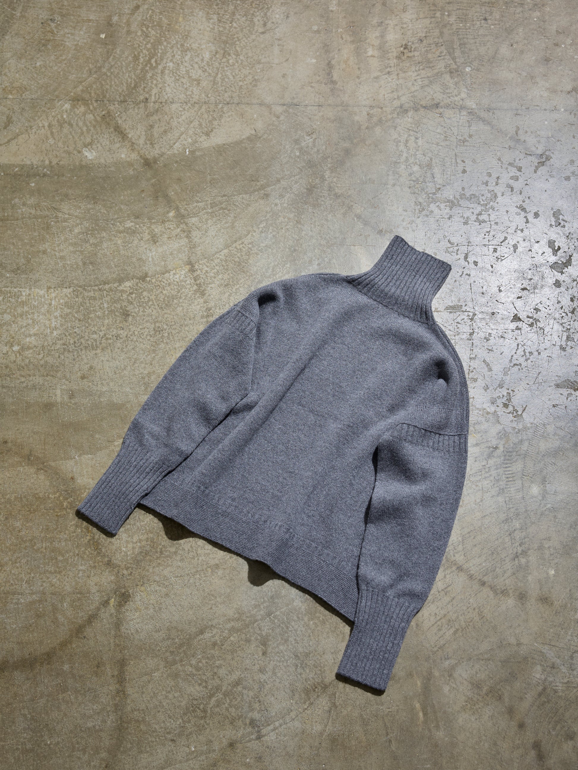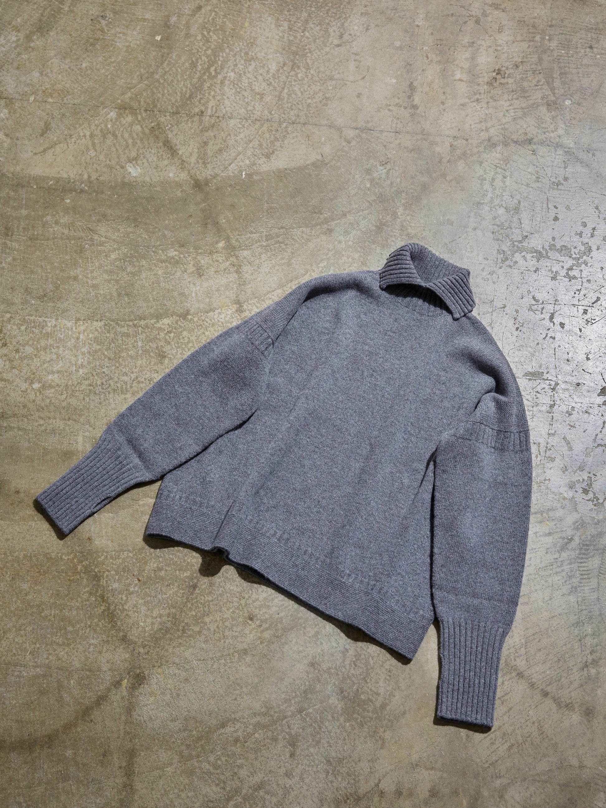 クラシカルなアイテムをモダンにアレンジしたビッグシルエットニット。ガンジーニットのディテール、雰囲気を残しつつサイズバランスを見直し、前後2wayで着用できるタートルネックに仕上げました。