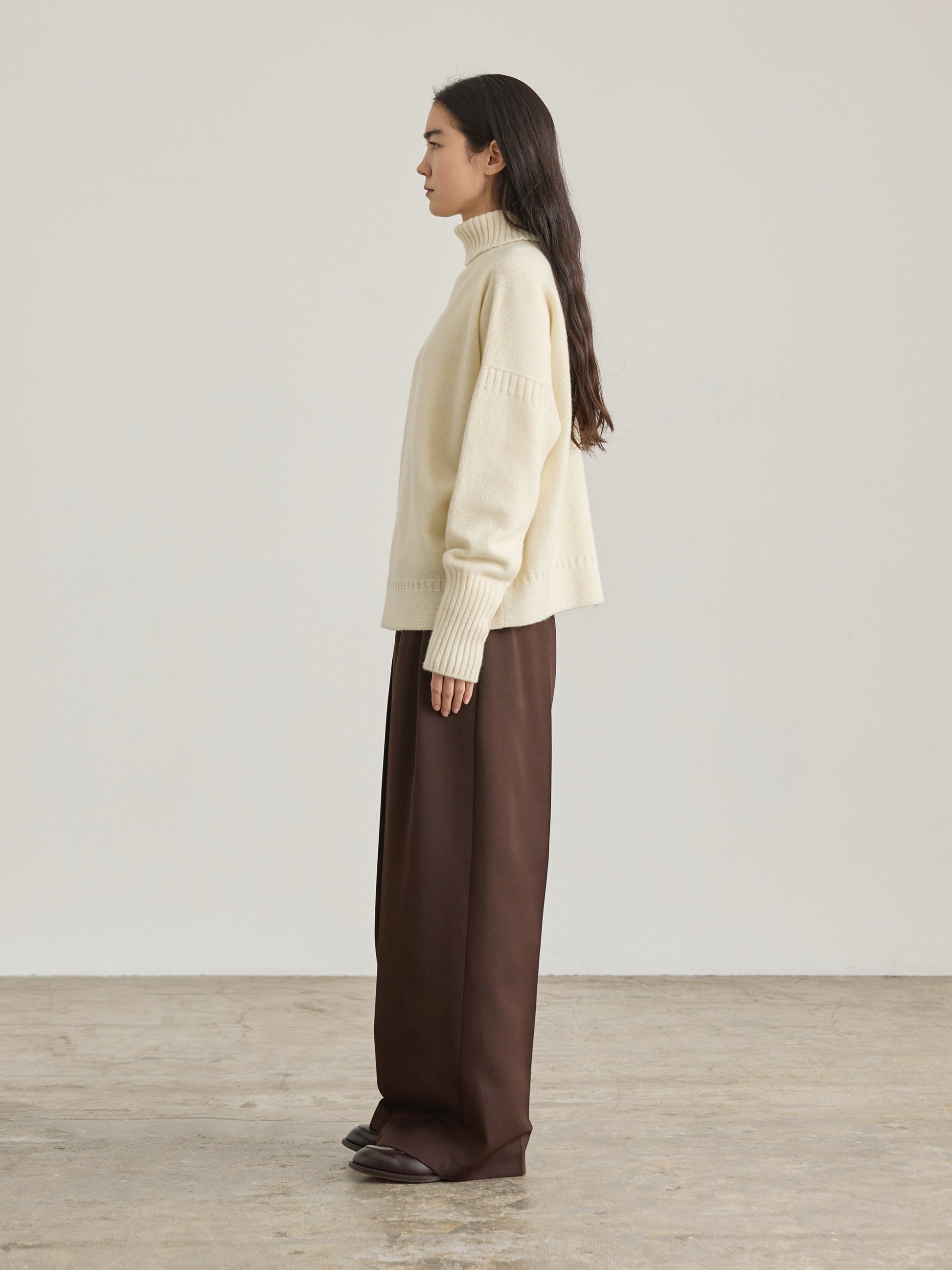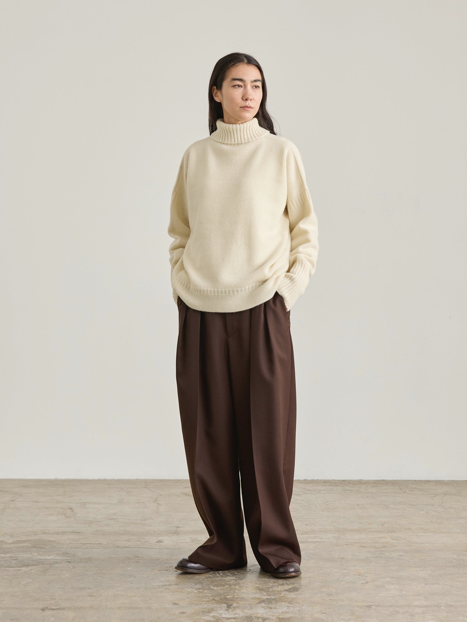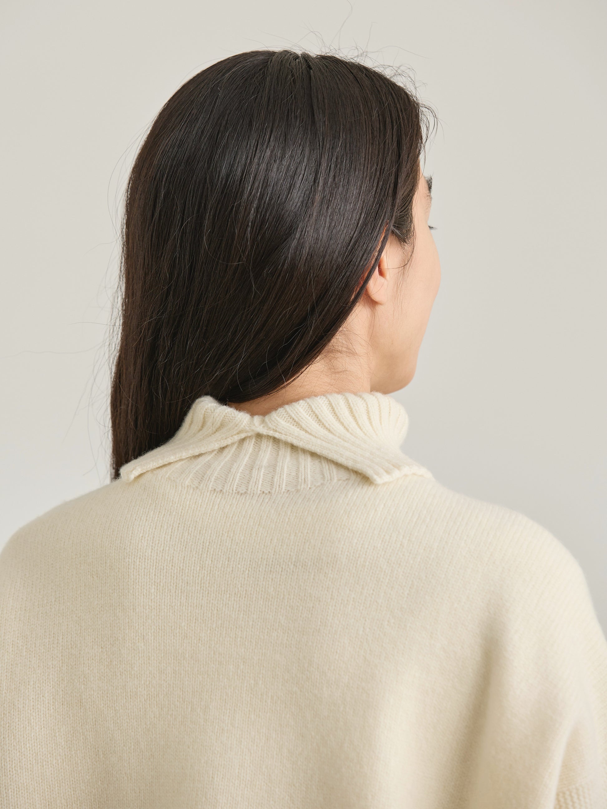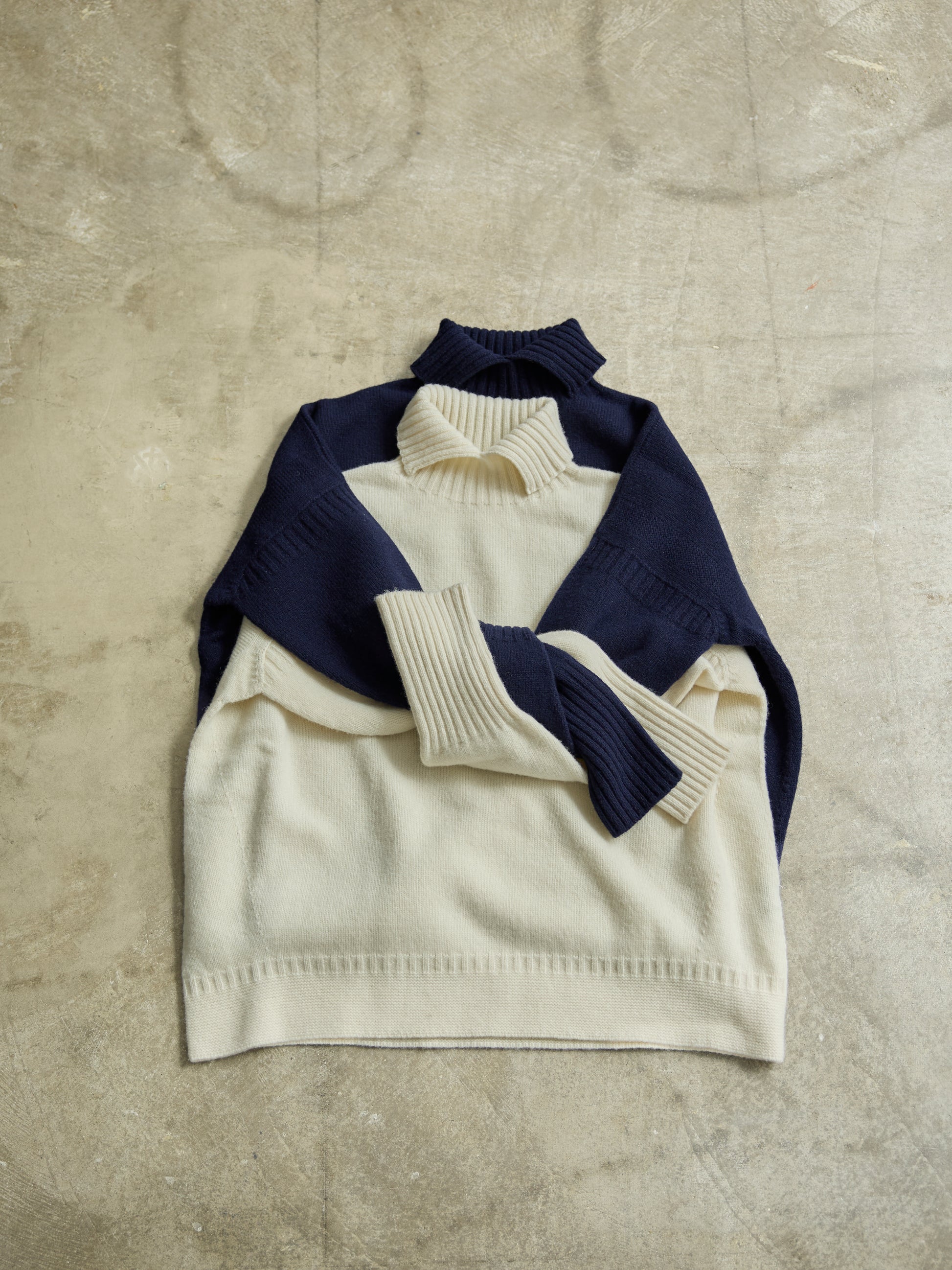 クラシカルなアイテムをモダンにアレンジしたビッグシルエットニット。ガンジーニットのディテール、雰囲気を残しつつサイズバランスを見直し、前後2wayで着用できるタートルネックに仕上げました。