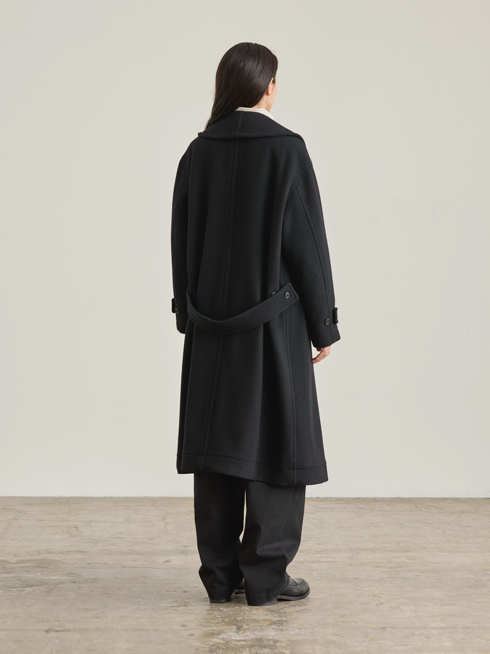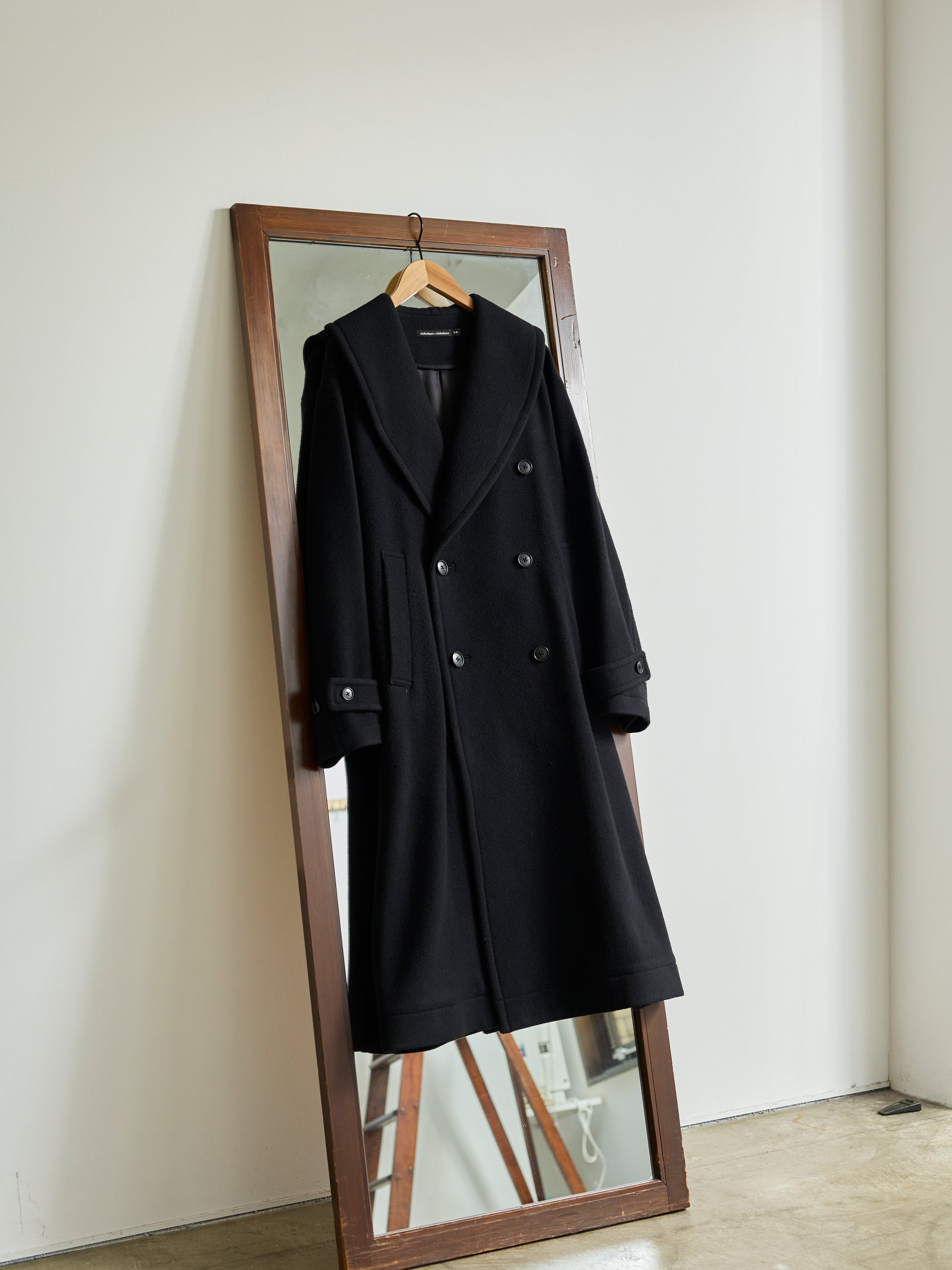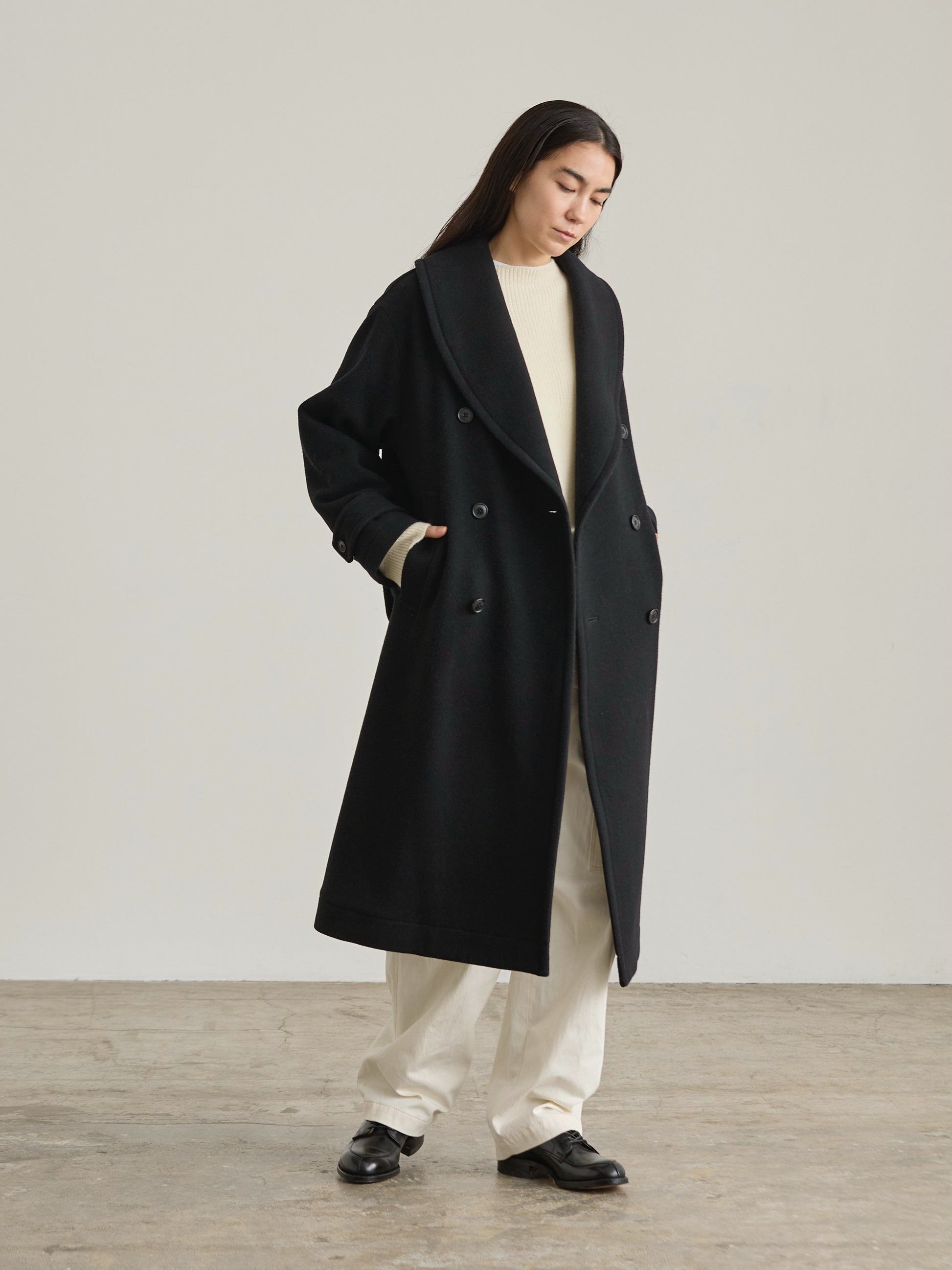 ビンテージのマッキーノコートからインスピレーションを得たショールカラーコート。ダブルブレステッド仕様のロングコートに袖口ベルトやバックベルトのアクセントを加えることで女性らしい1枚に仕上がりました。