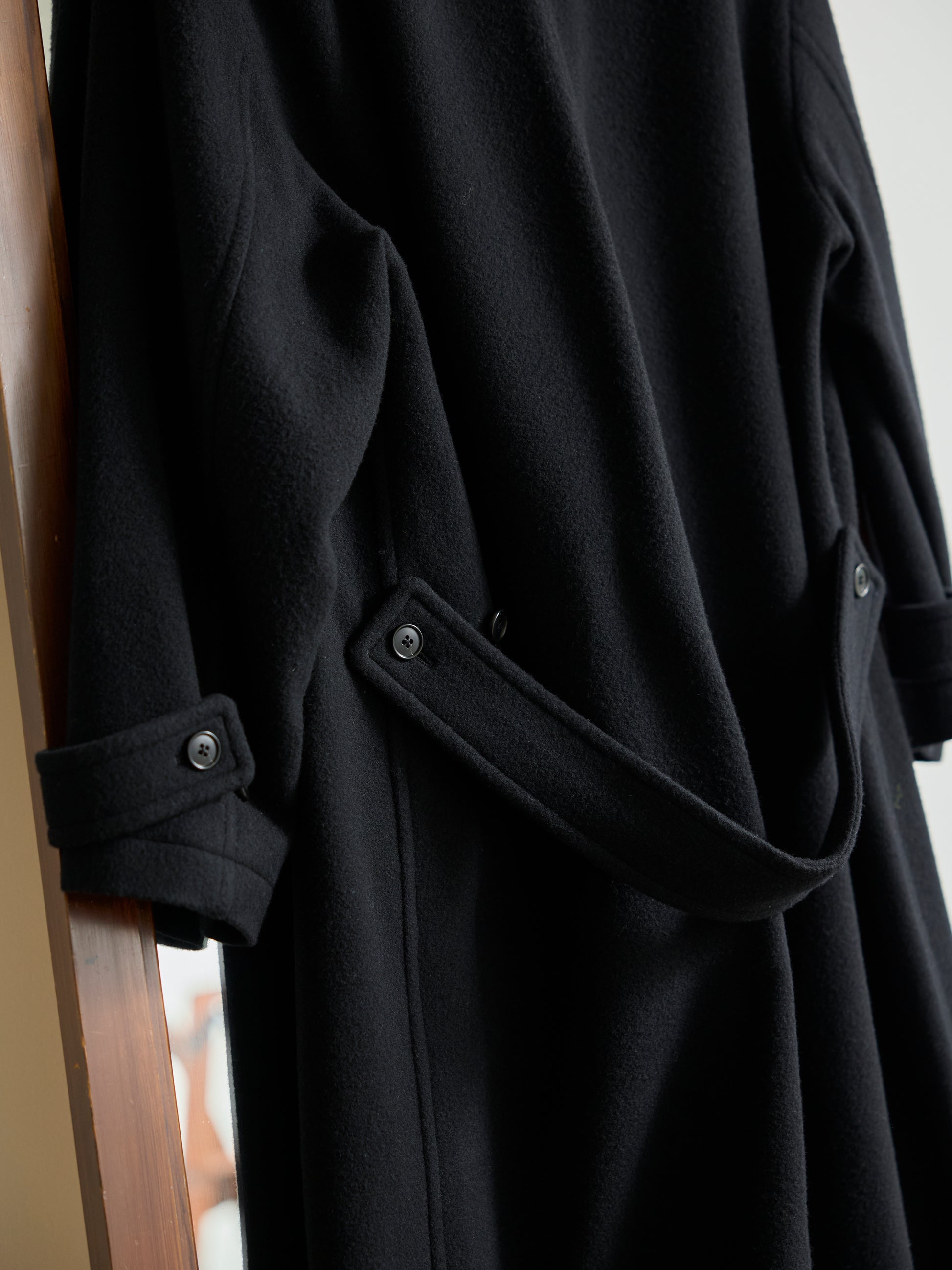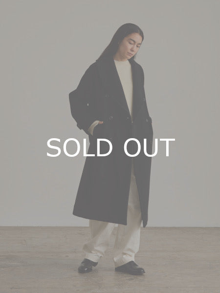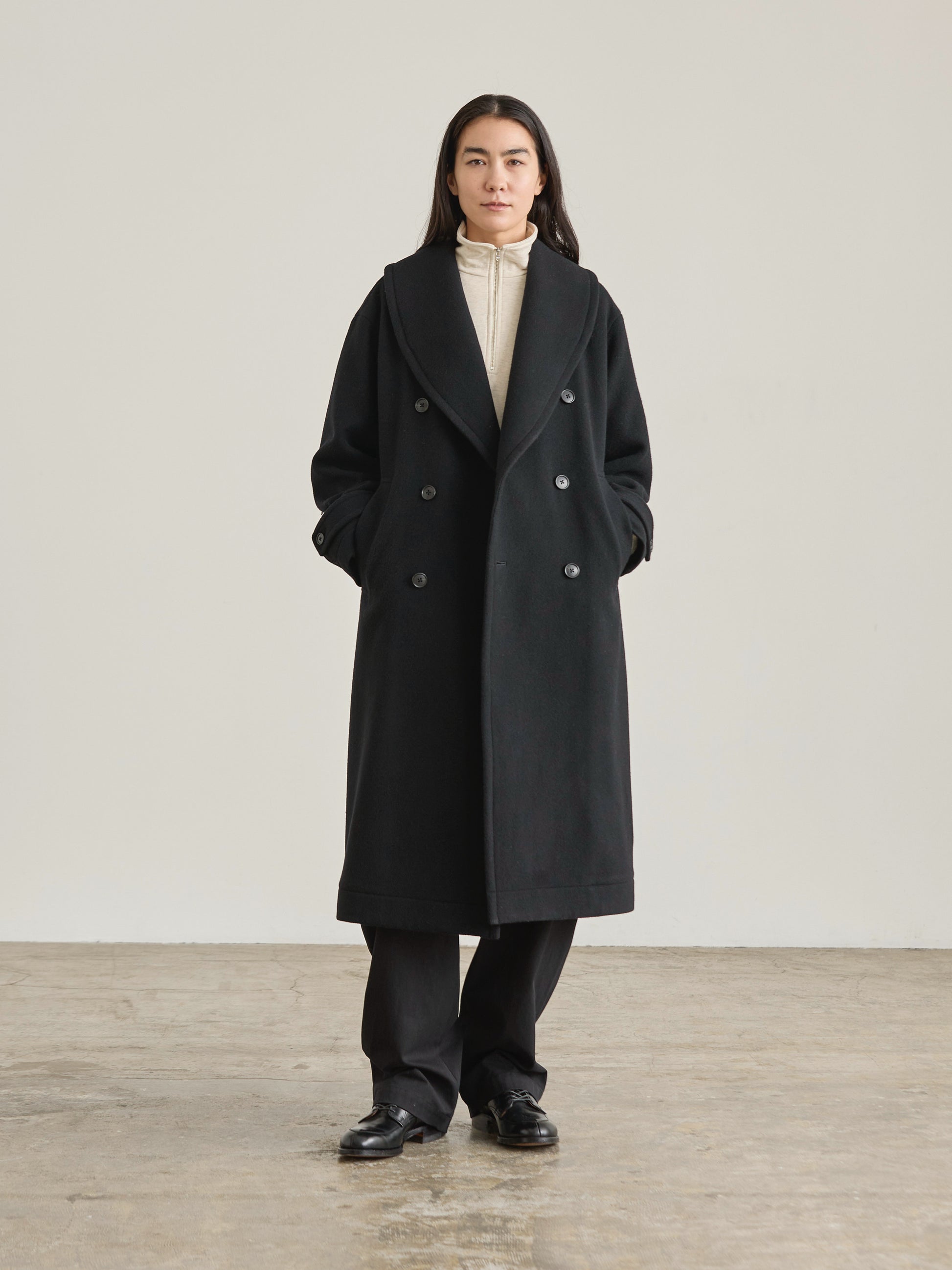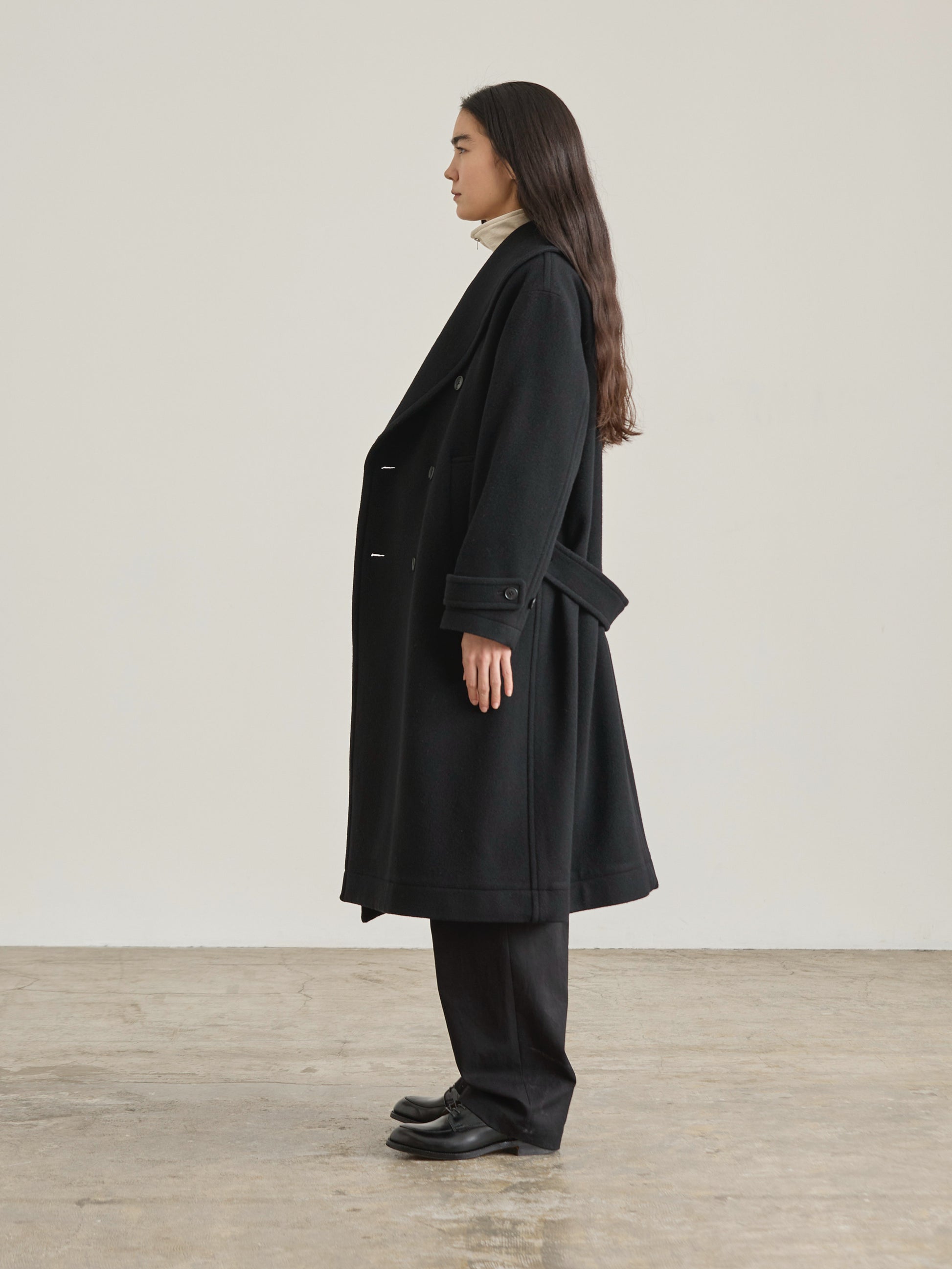 ビンテージのマッキーノコートからインスピレーションを得たショールカラーコート。ダブルブレステッド仕様のロングコートに袖口ベルトやバックベルトのアクセントを加えることで女性らしい1枚に仕上がりました。