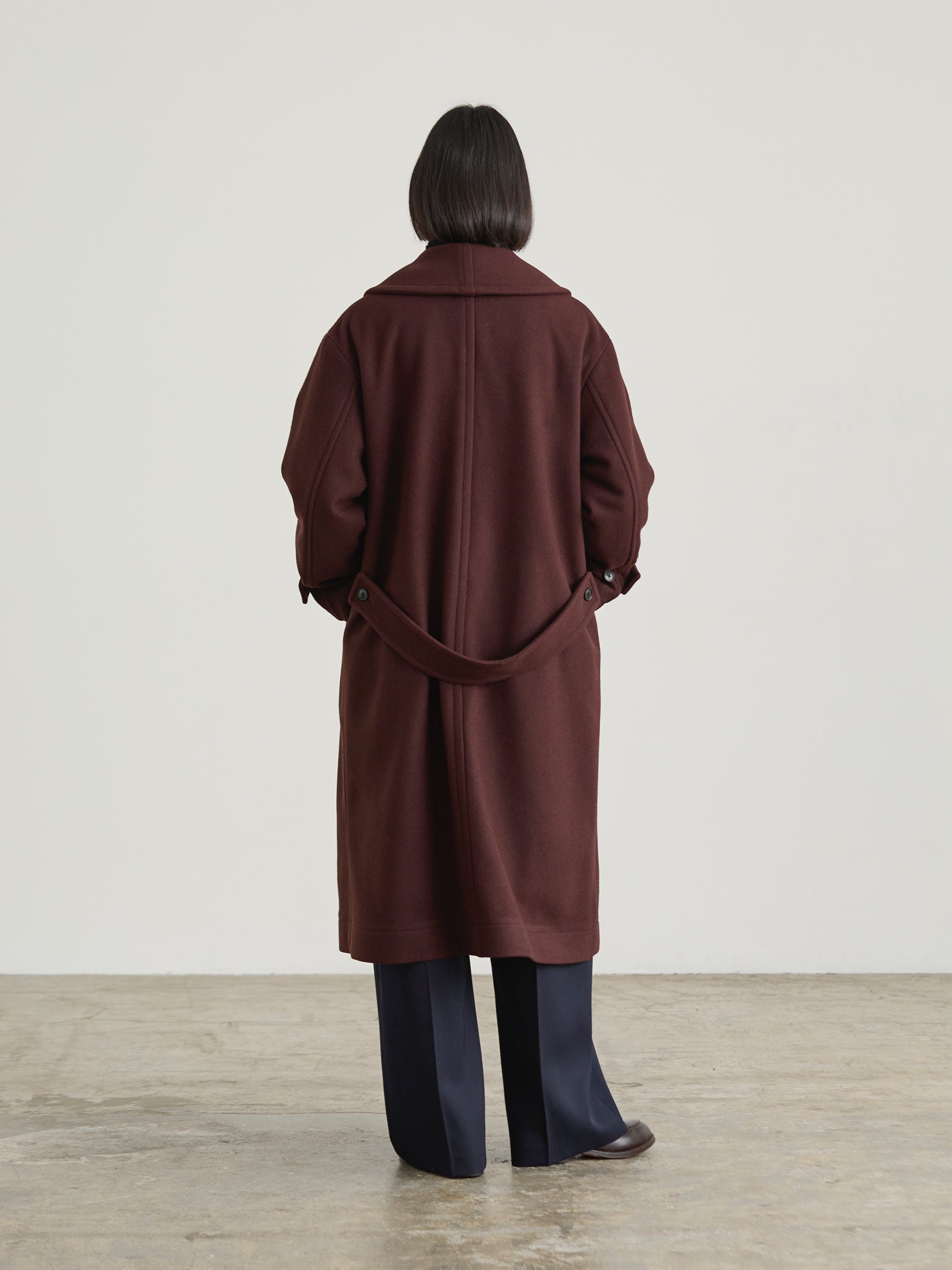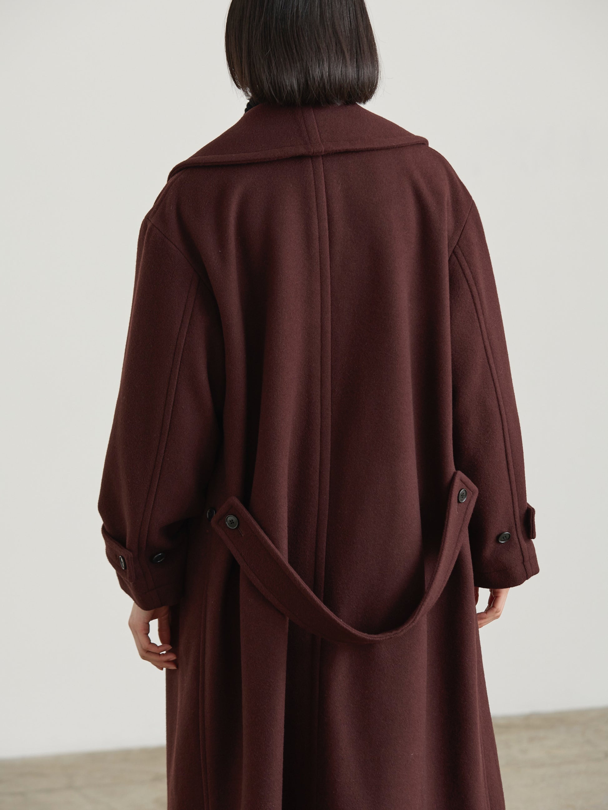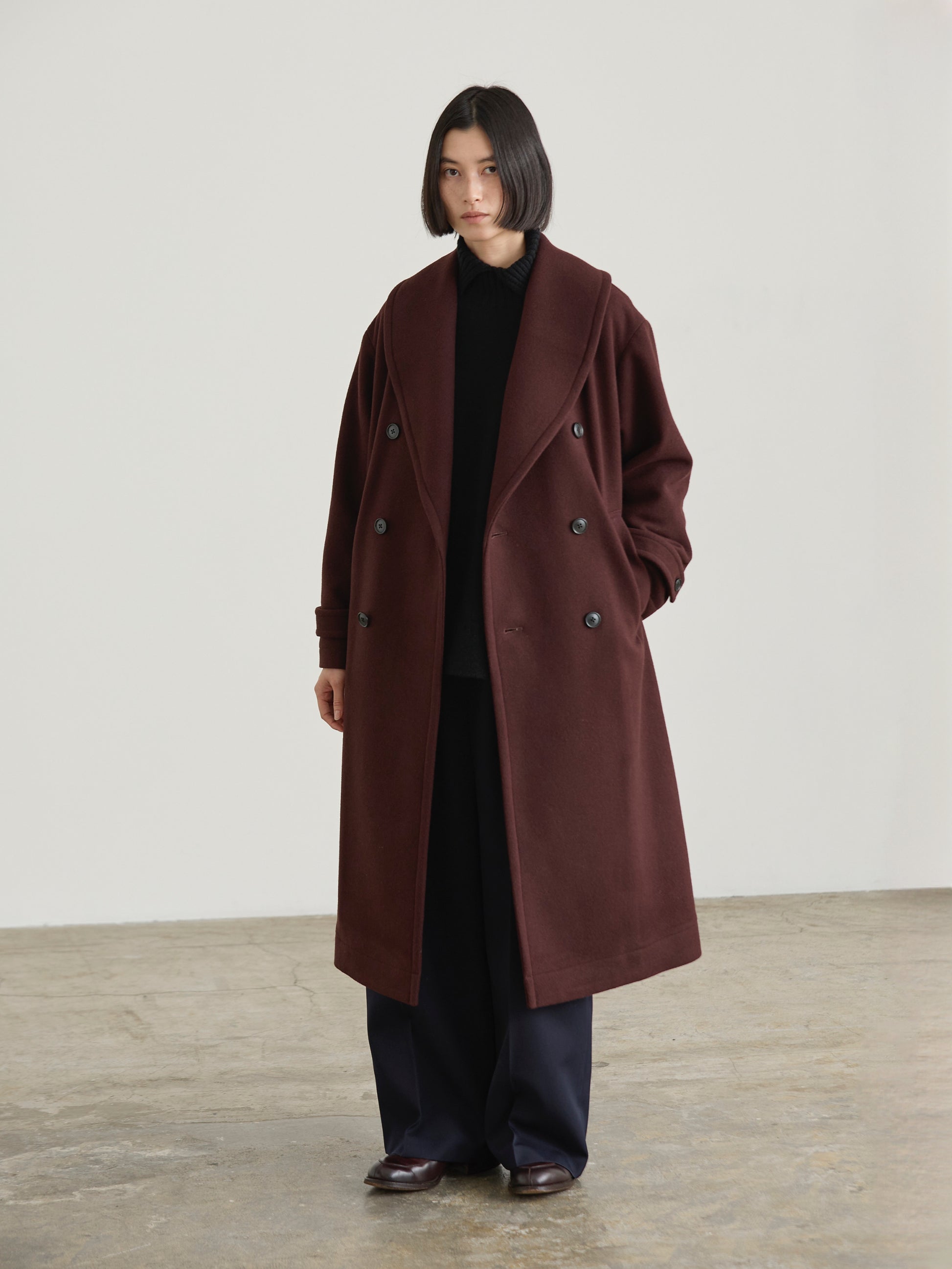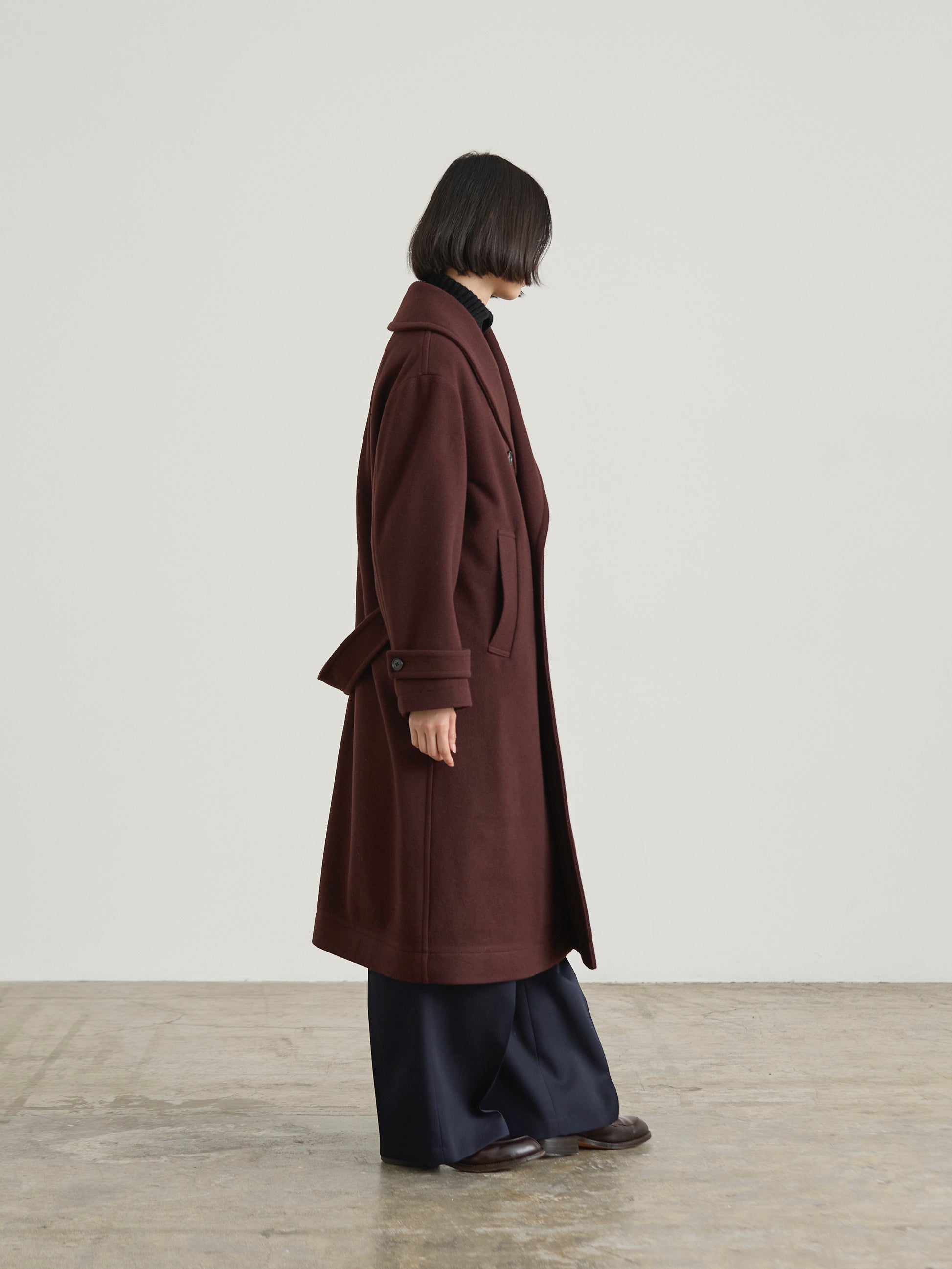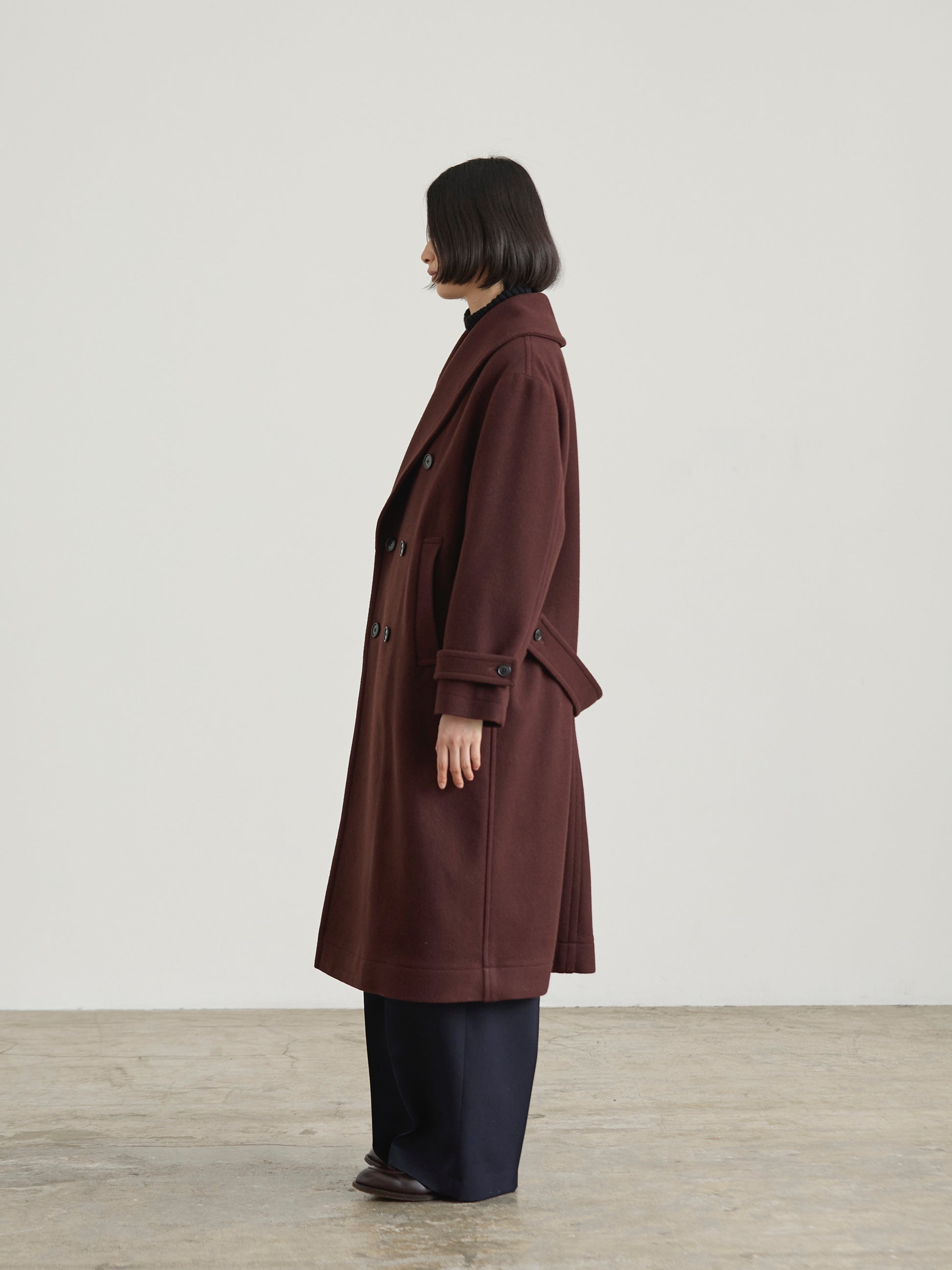 ビンテージのマッキーノコートからインスピレーションを得たショールカラーコート。ダブルブレステッド仕様のロングコートに袖口ベルトやバックベルトのアクセントを加えることで女性らしい1枚に仕上がりました。