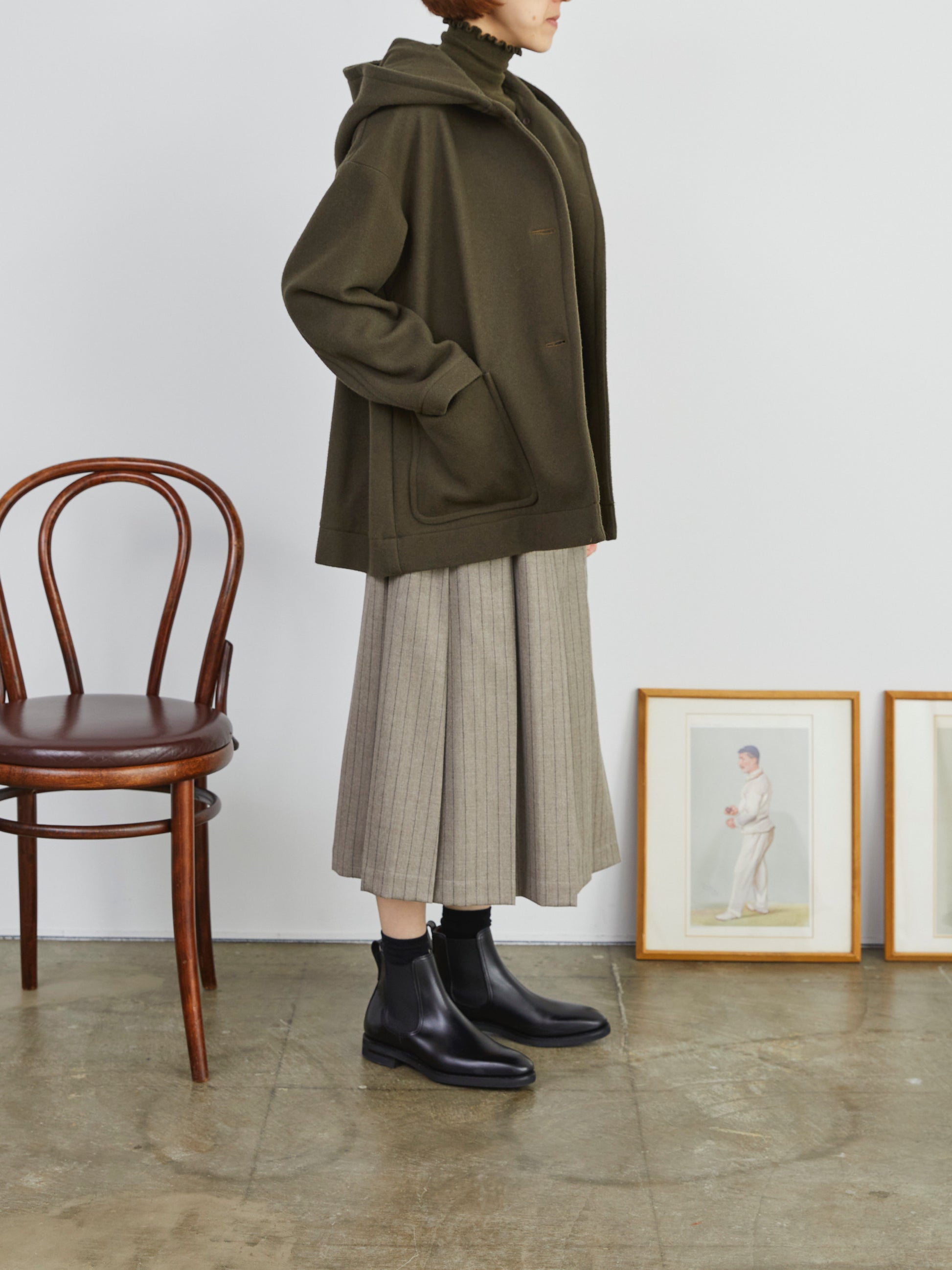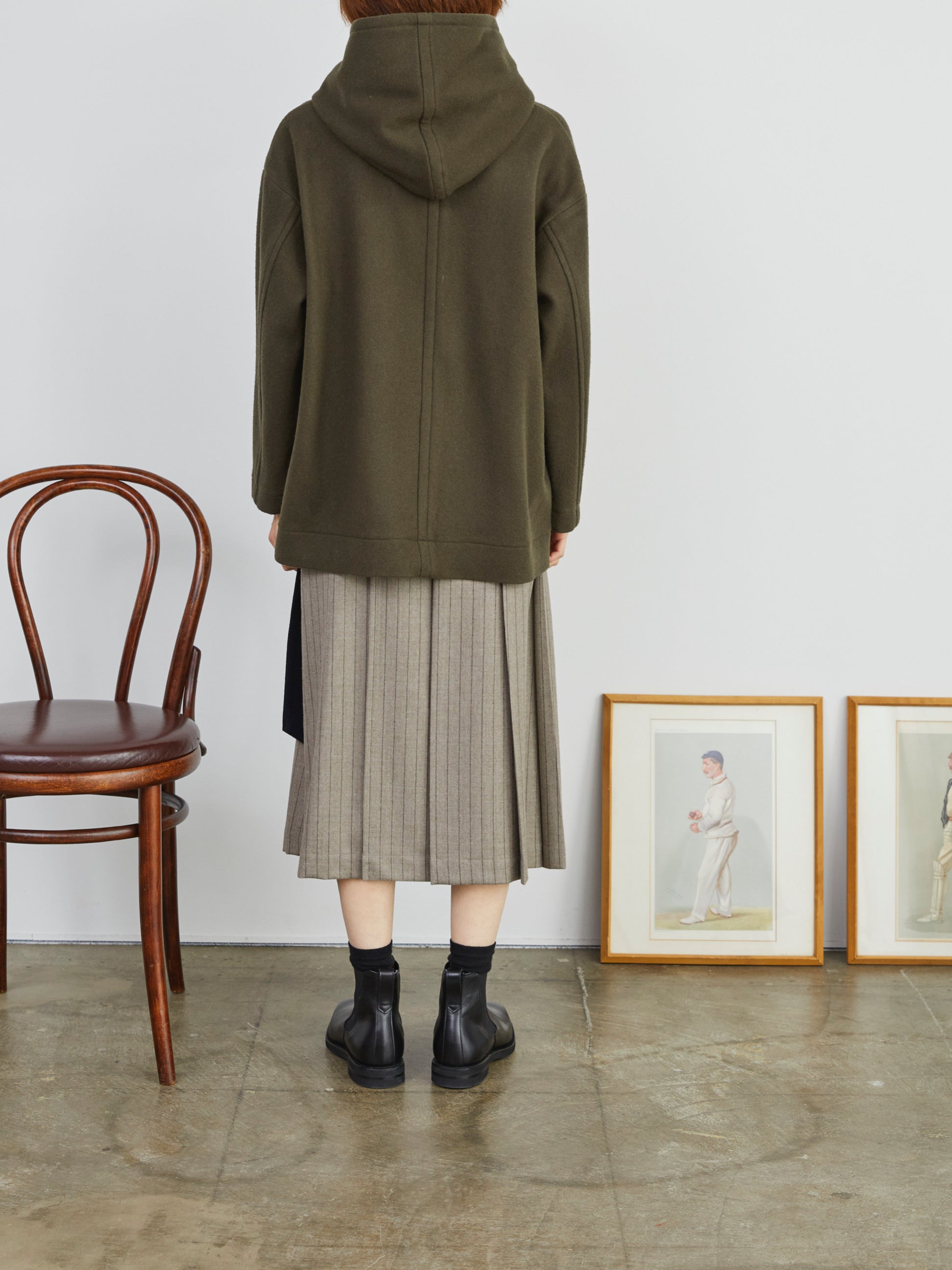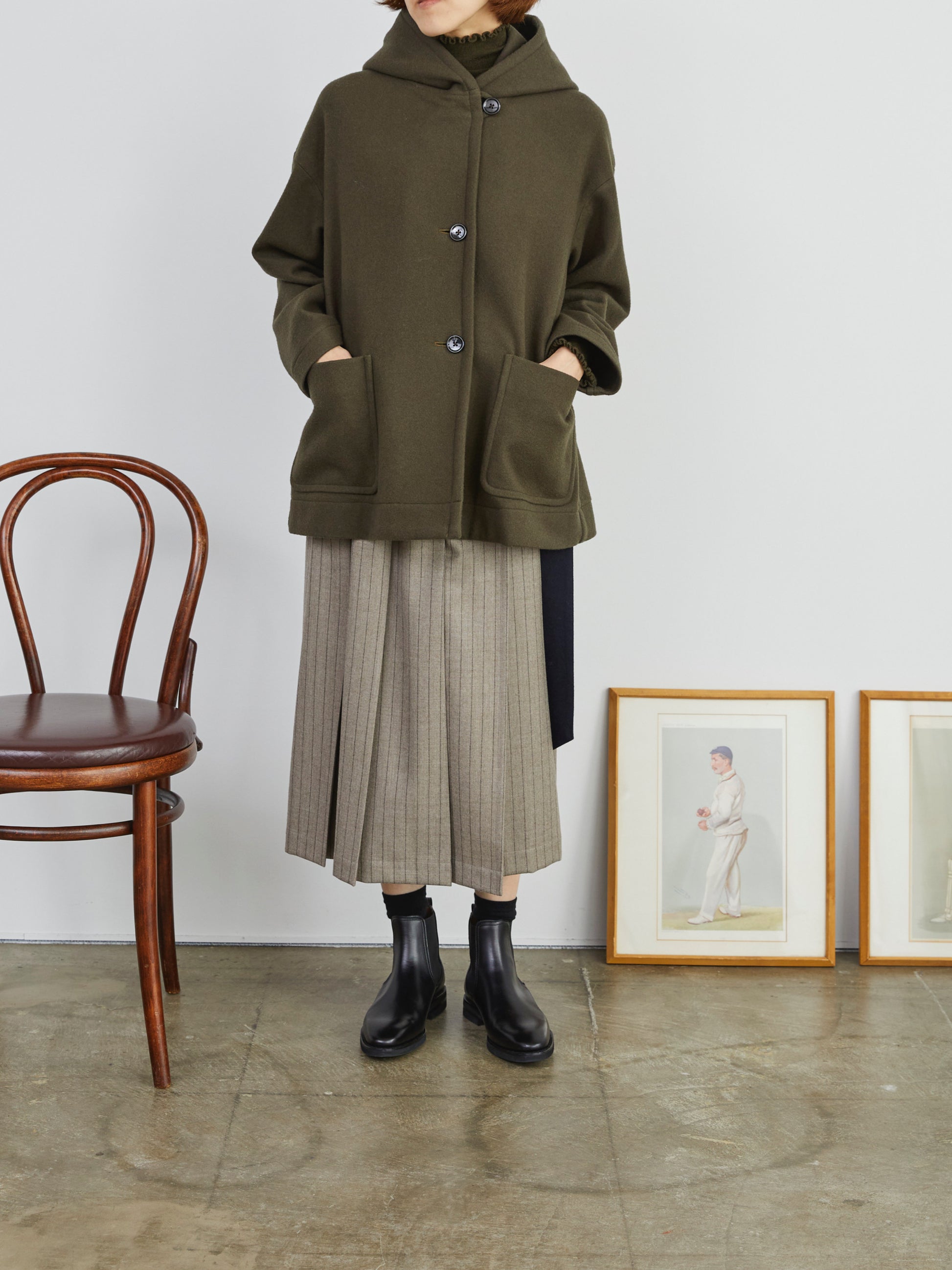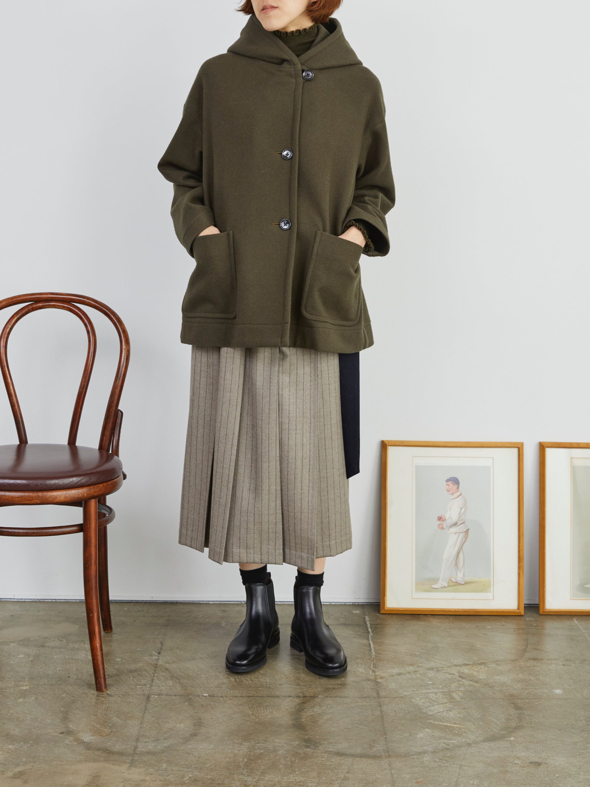 大きめのフードが印象的なショートコート。ボタンを開けるとボリュームあるフードがショールカラーのように美しく広がるデザイン。ゆとりのあるシルエットでレイヤードもしやすいのが特徴です。