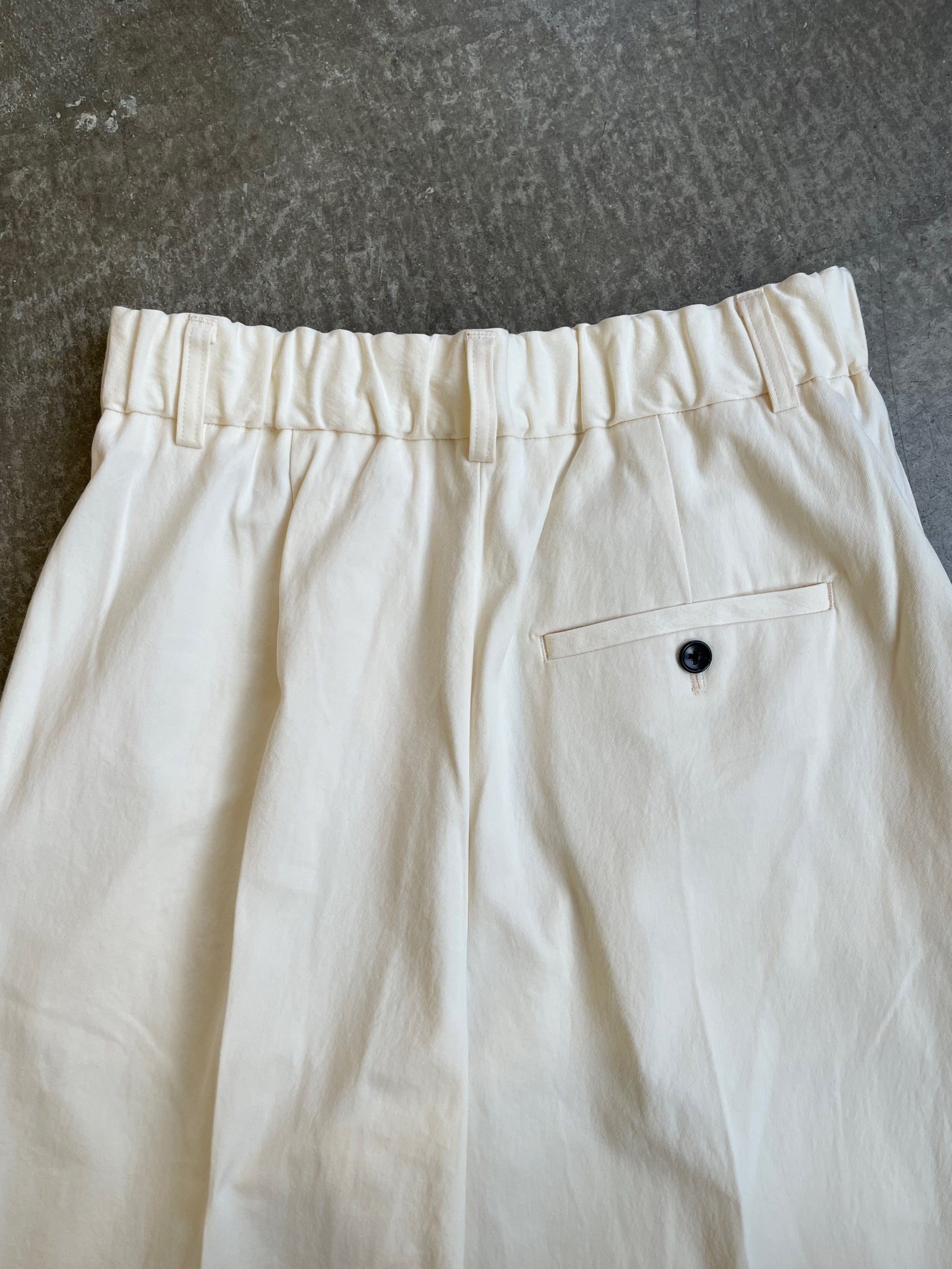 ワンタックのバーレルシルエットのパンツ。美しいワイドレッグのフルレングスが大人のコーディネイトを演出します。後ウエスト部分にはシャーリングゴムを使用しフィッティングをサポート。