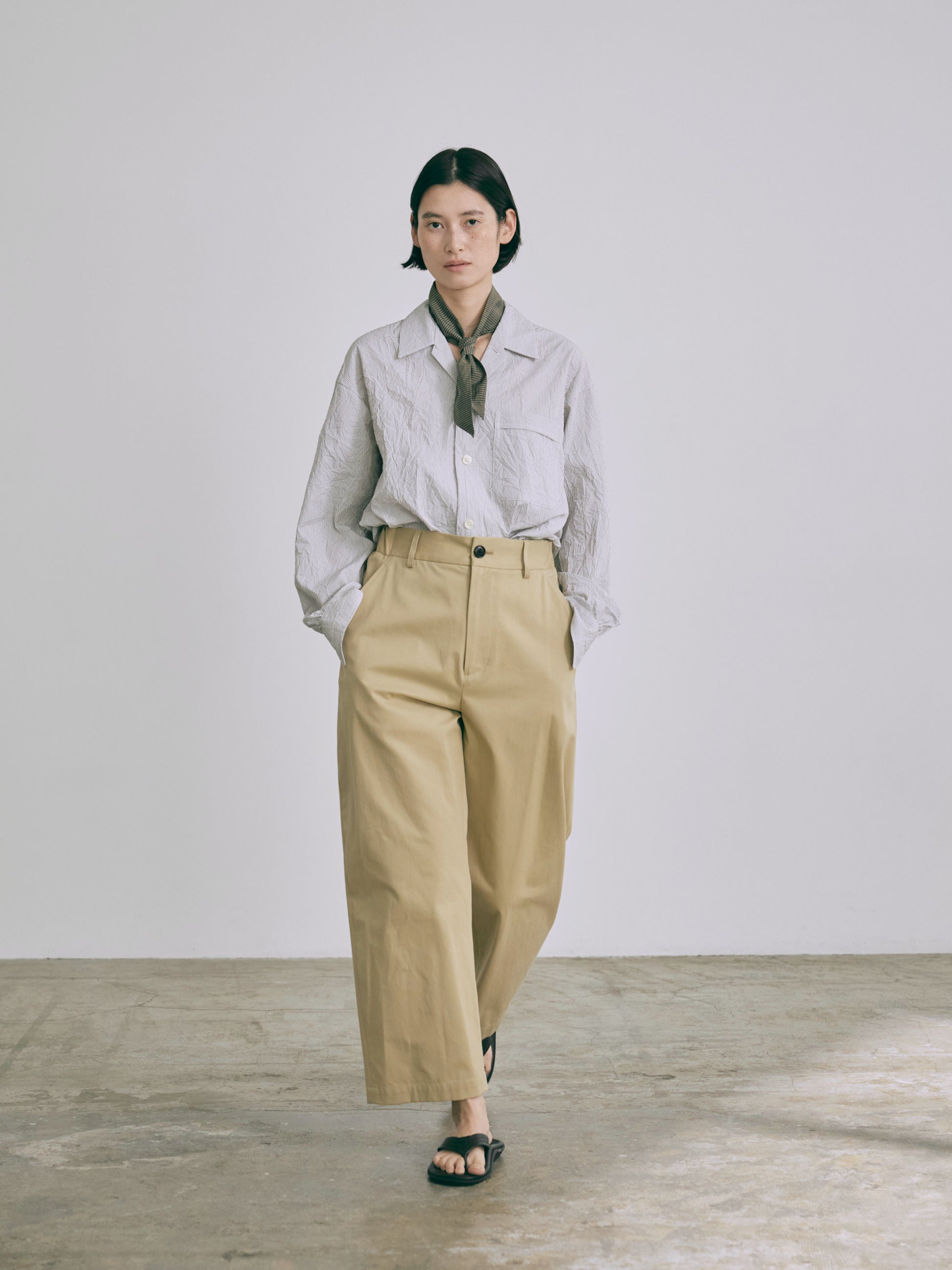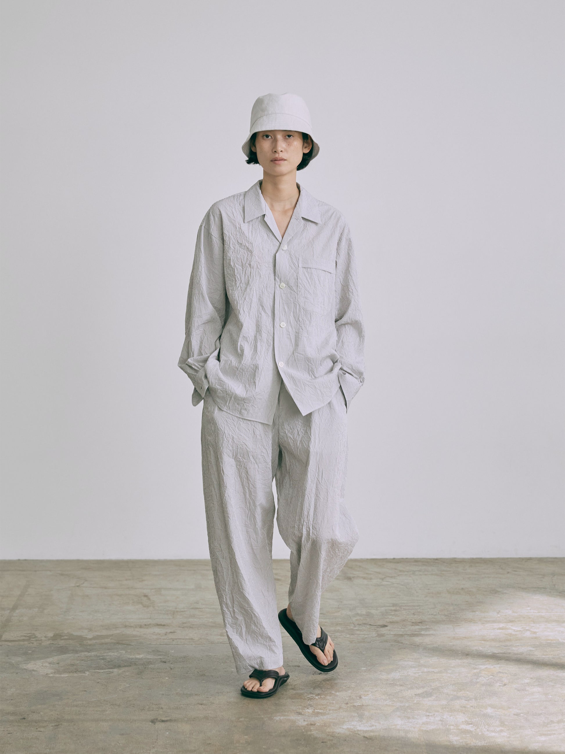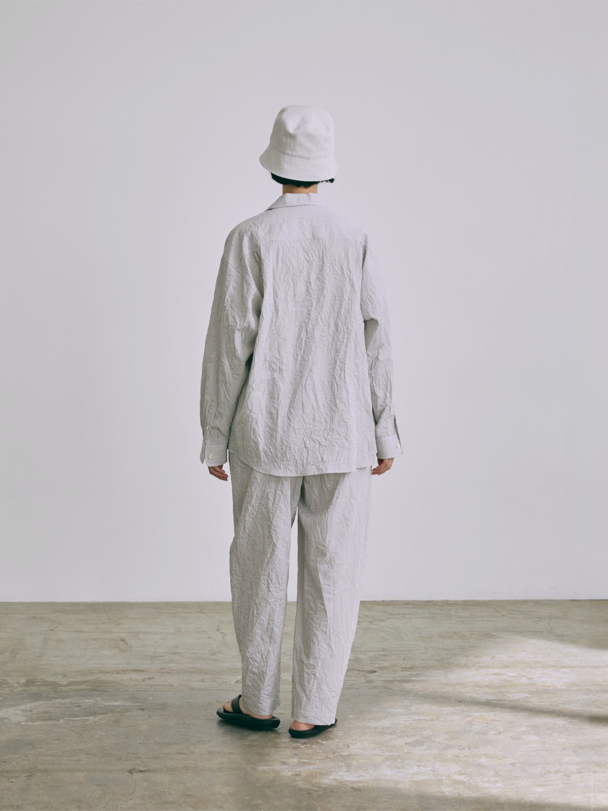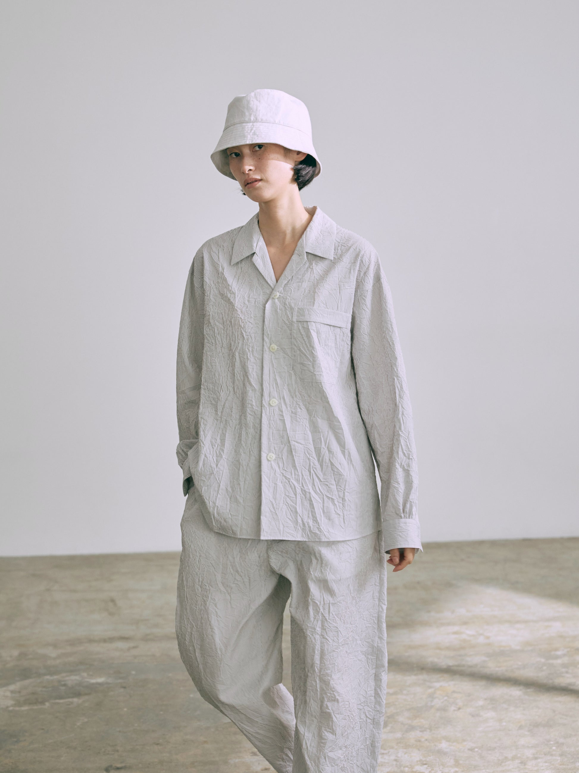 高密度の綿100%ブロード生地に特殊な洗い加工をかけたワッシャー感のある表情がポイント。夏向きな軽さと清涼感を与えながら遊びごころのある素材感を楽しんで。