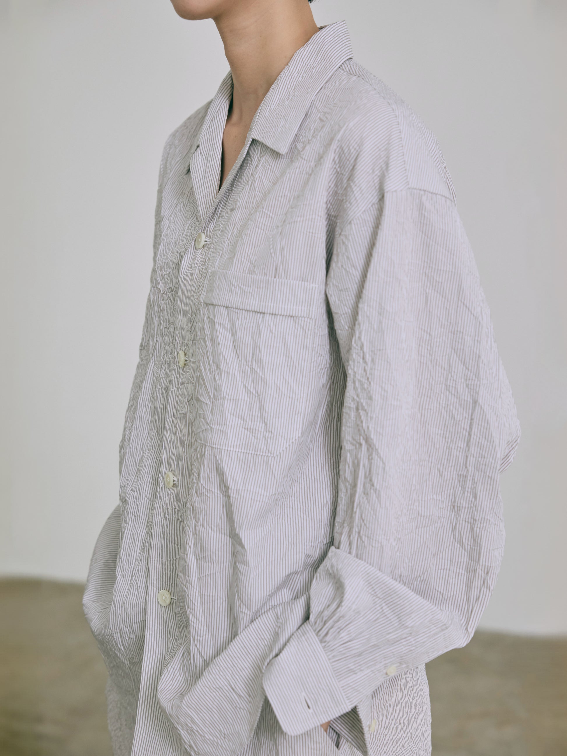 ジェンダーフリーに仕上げたオープンカラーシャツ。胸ポケット、袖口や後ヨークのギャザー部分のクラッシック感漂うディテールや、リラックス感のある着心地が1枚でも、また、夏のレイヤードにも最適。