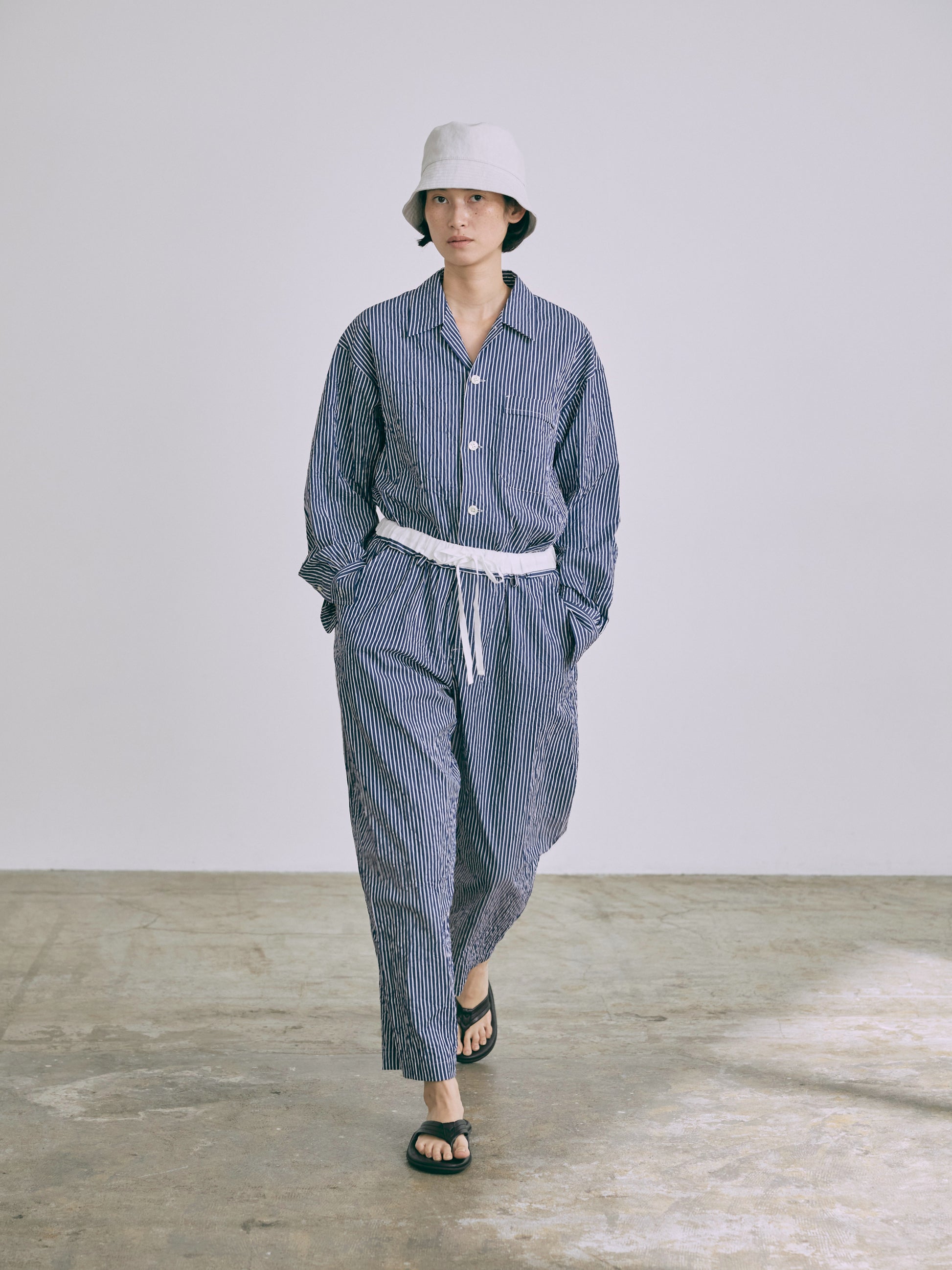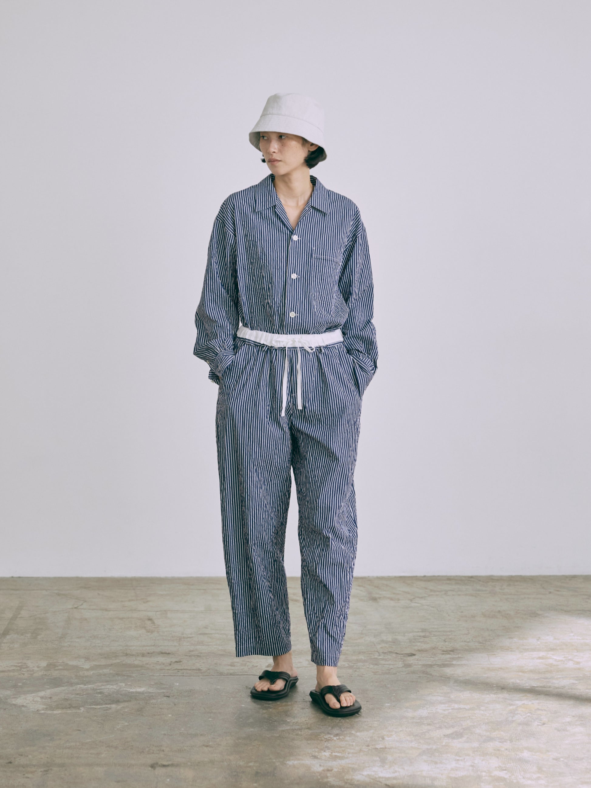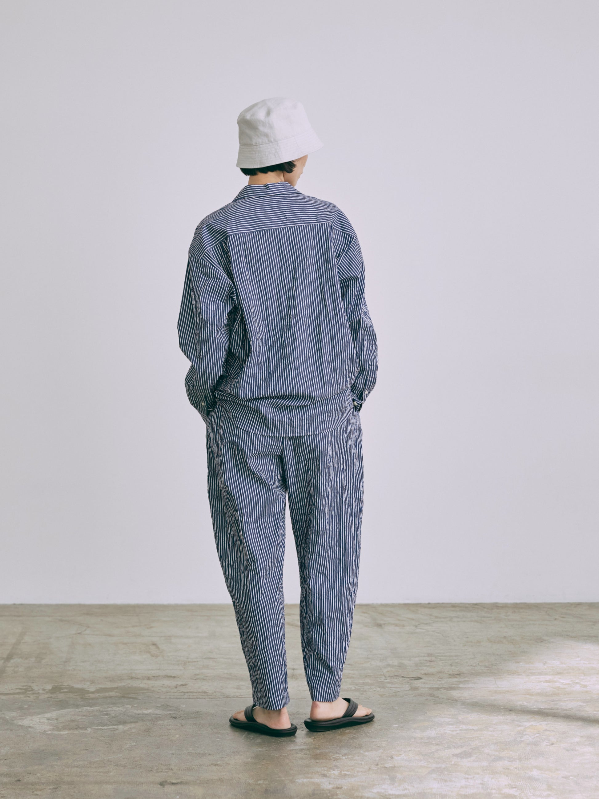 高密度の綿100%ブロード生地に特殊な洗い加工をかけたワッシャー感のある表情がポイント。夏向きな軽さと清涼感を与えながら遊びごころのある素材感を楽しんで。