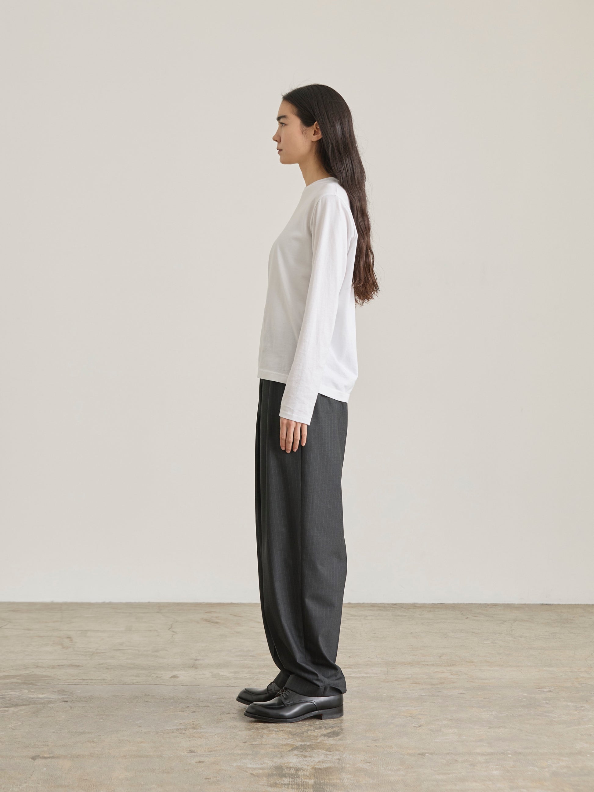 2タックのオーバルシルエットのパンツをイージーに仕上げた一枚。ヒップから裾にかけてぐっとテーパードさせたメンズライクな2タックイージーパンツ。裾ダブルの仕上げは足元に重厚感が生まれクリースラインを際立たせます。ウエストはゴム仕様に加えフィット感を高めるドローストリング仕様に。