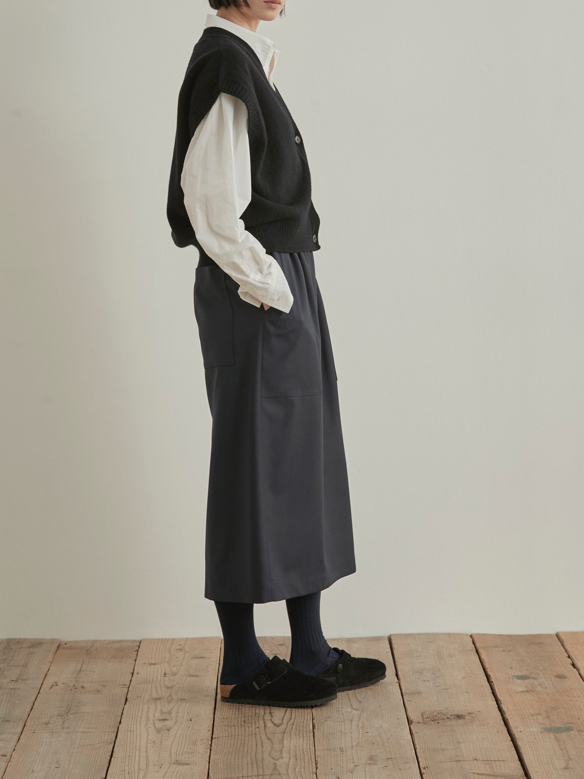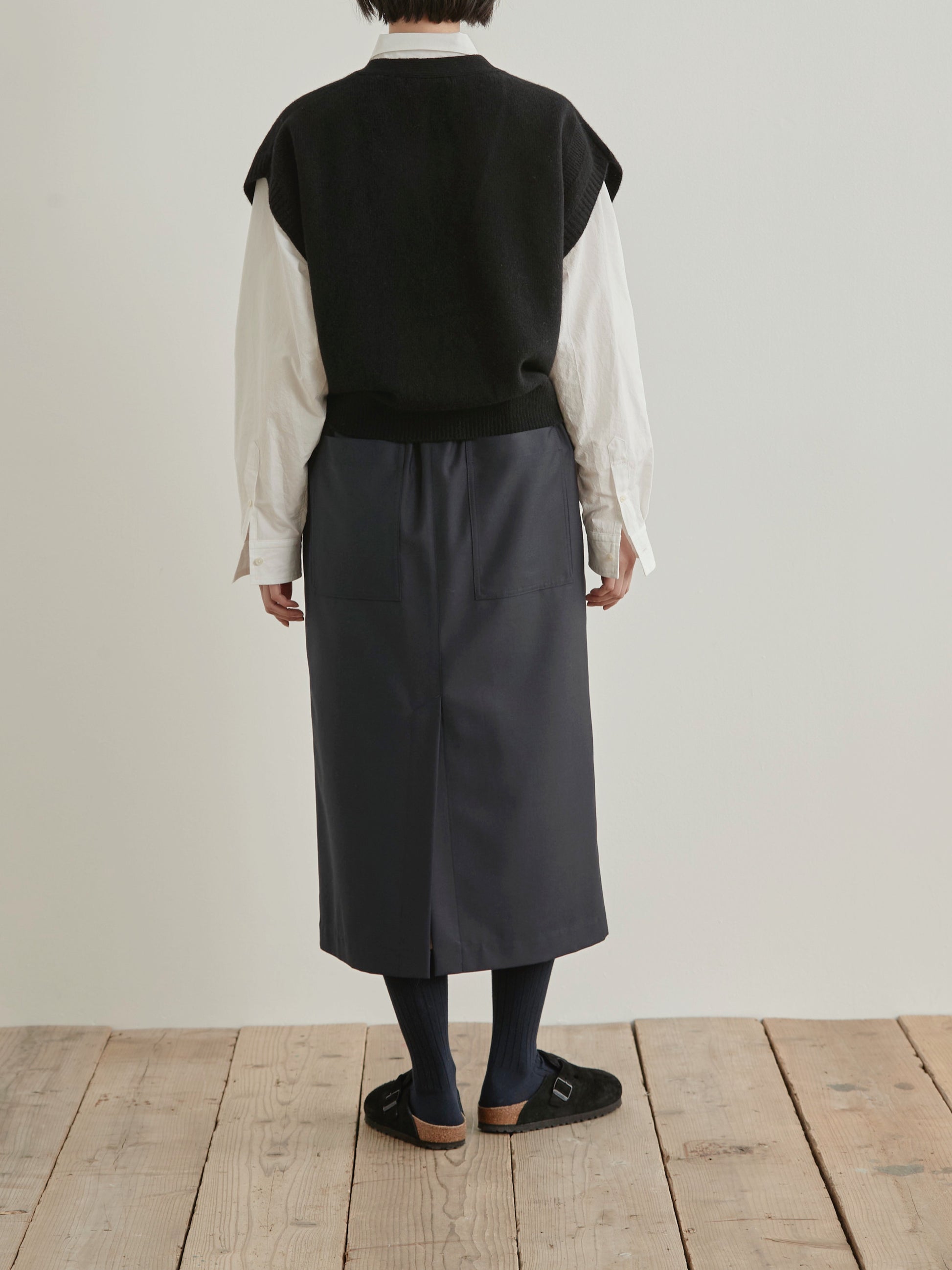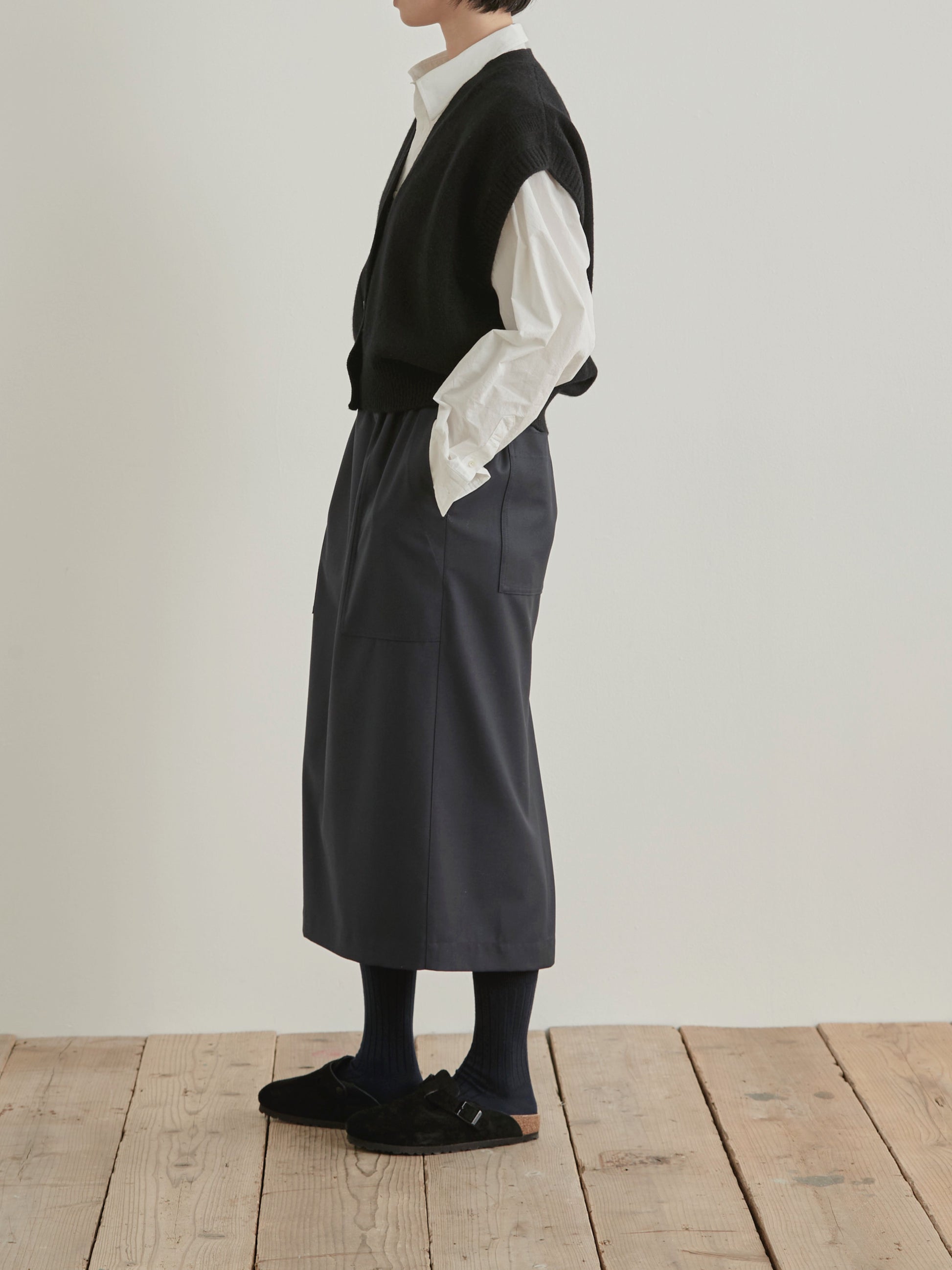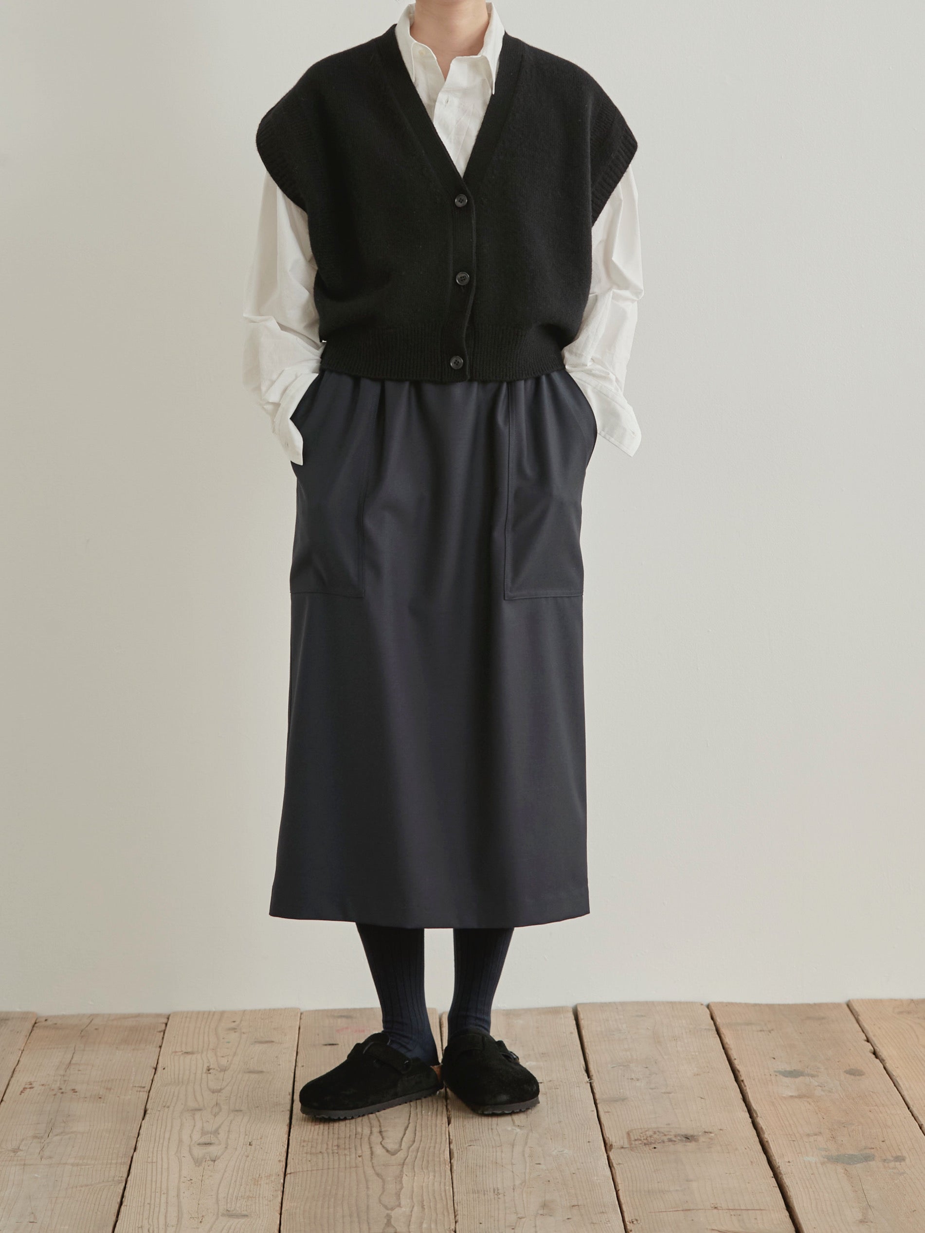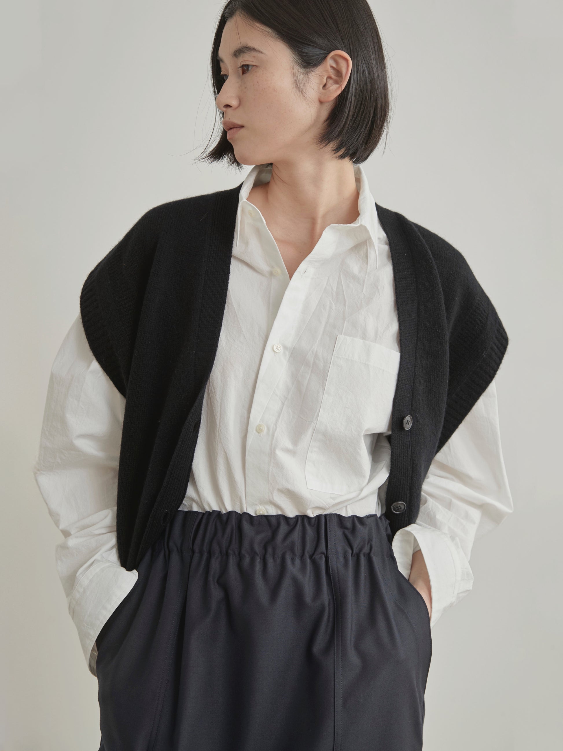 レイヤードスタイルに欠かせないニットベスト。編地の変化でシンプルなデザインにアクセントをつけました。コーディネートの幅が広がるおすすめのアイテムです。