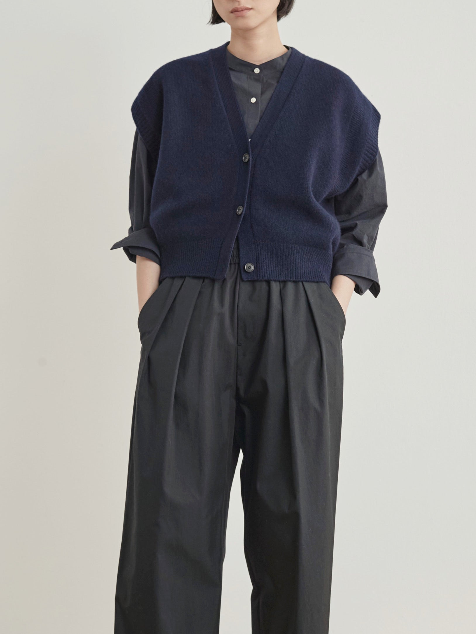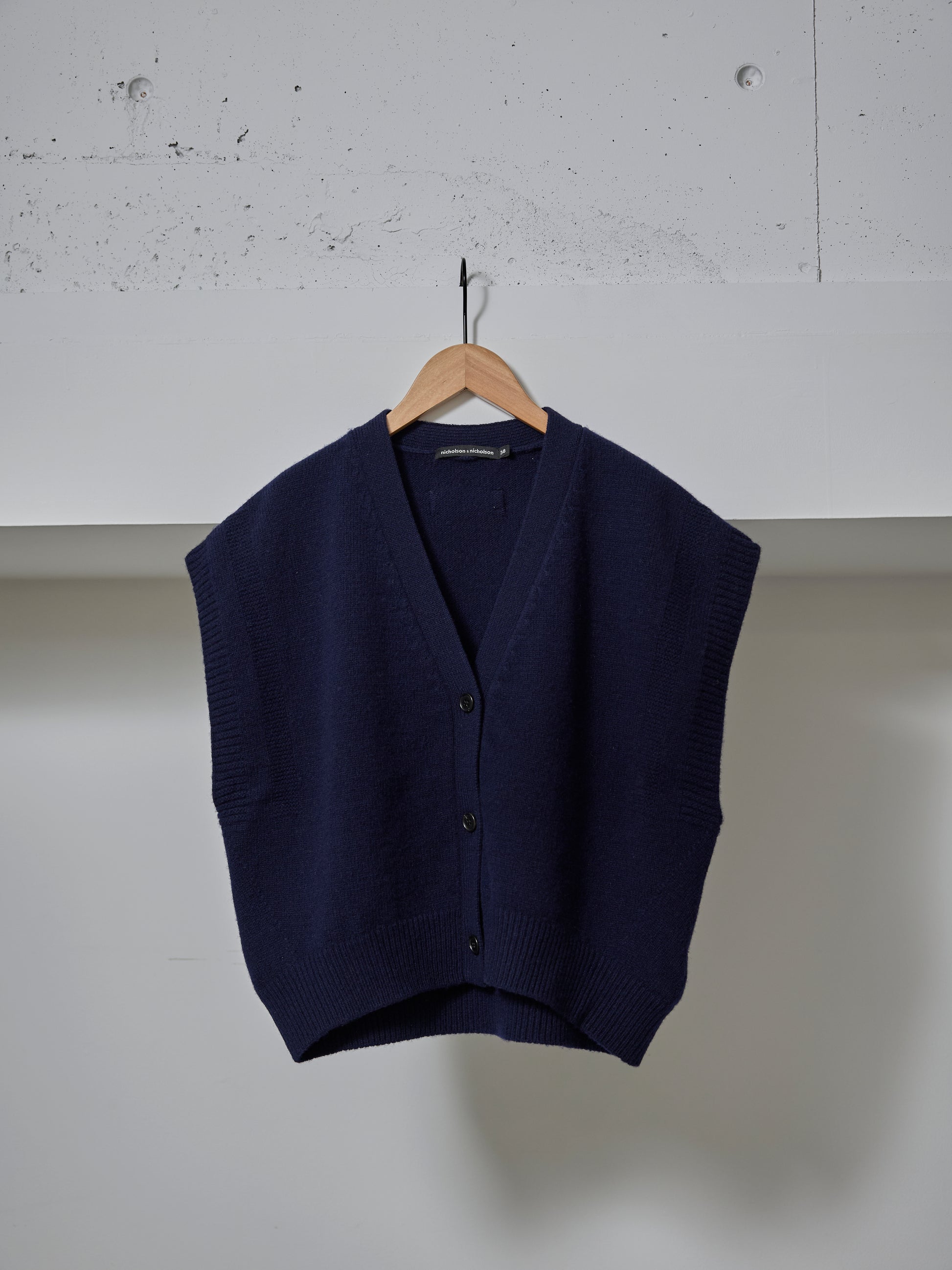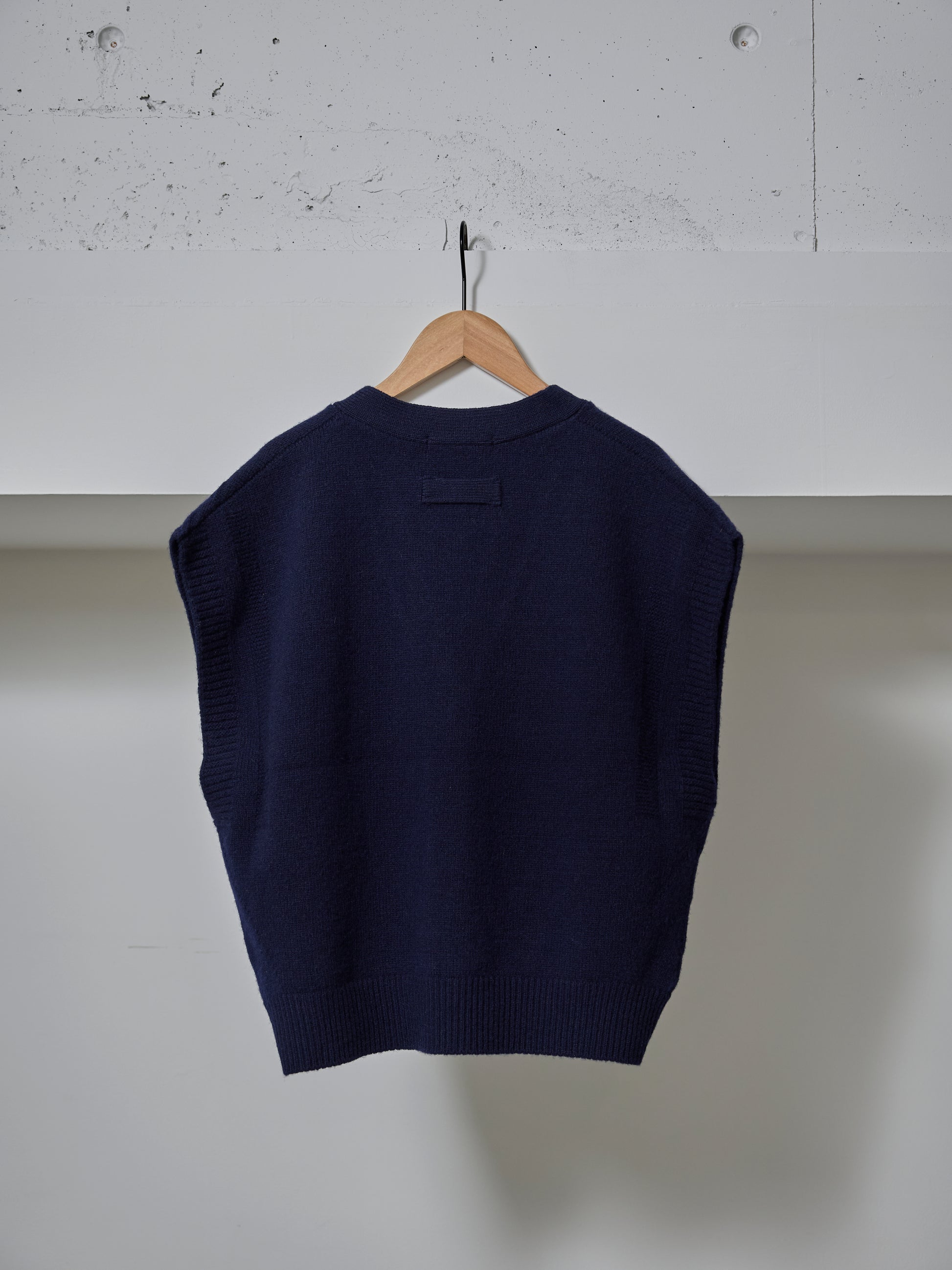 レイヤードスタイルに欠かせないニットベスト。編地の変化でシンプルなデザインにアクセントをつけました。コーディネートの幅が広がるおすすめのアイテムです。